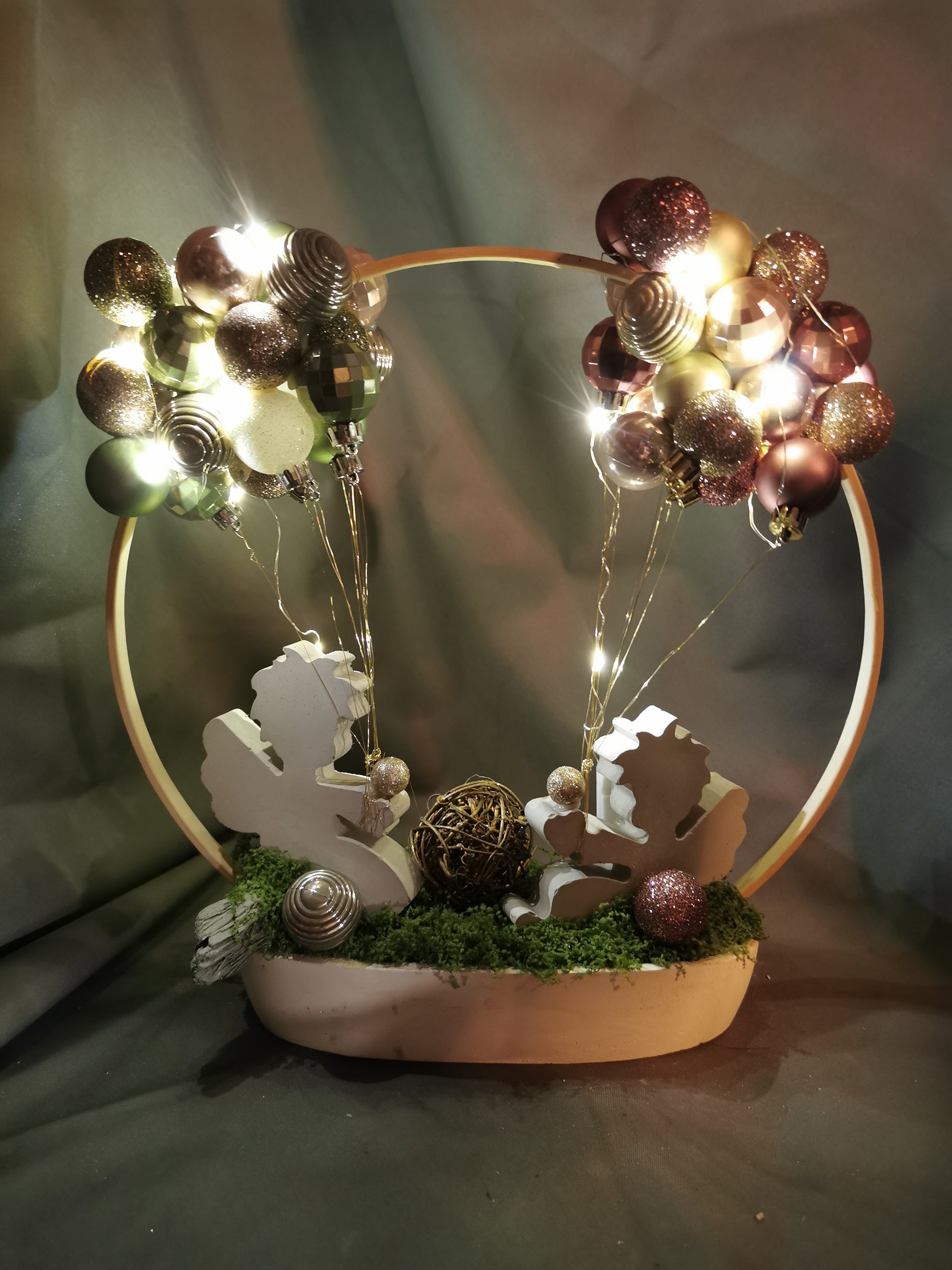Betonschale mit Betonengeln und Weihnachtskugeln als Luftballons mit Lichterkette. die Betonschale ist mit Kork unterlegt, damit nichts zerkratzt werden kann.