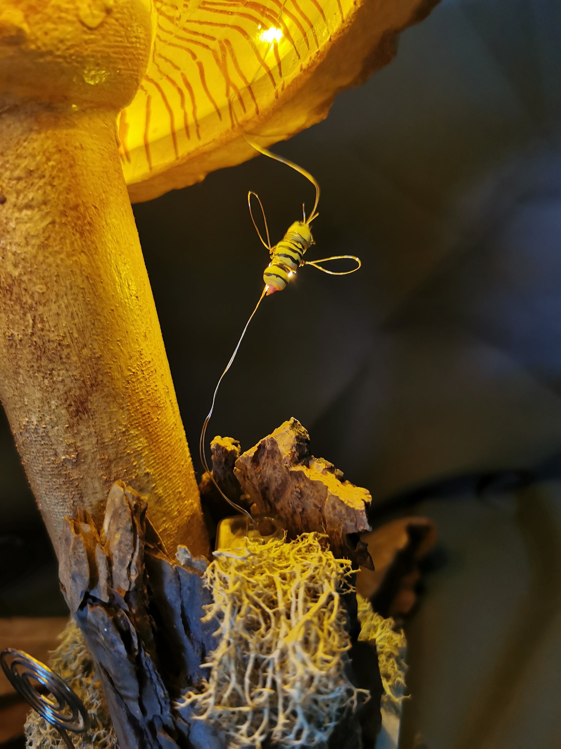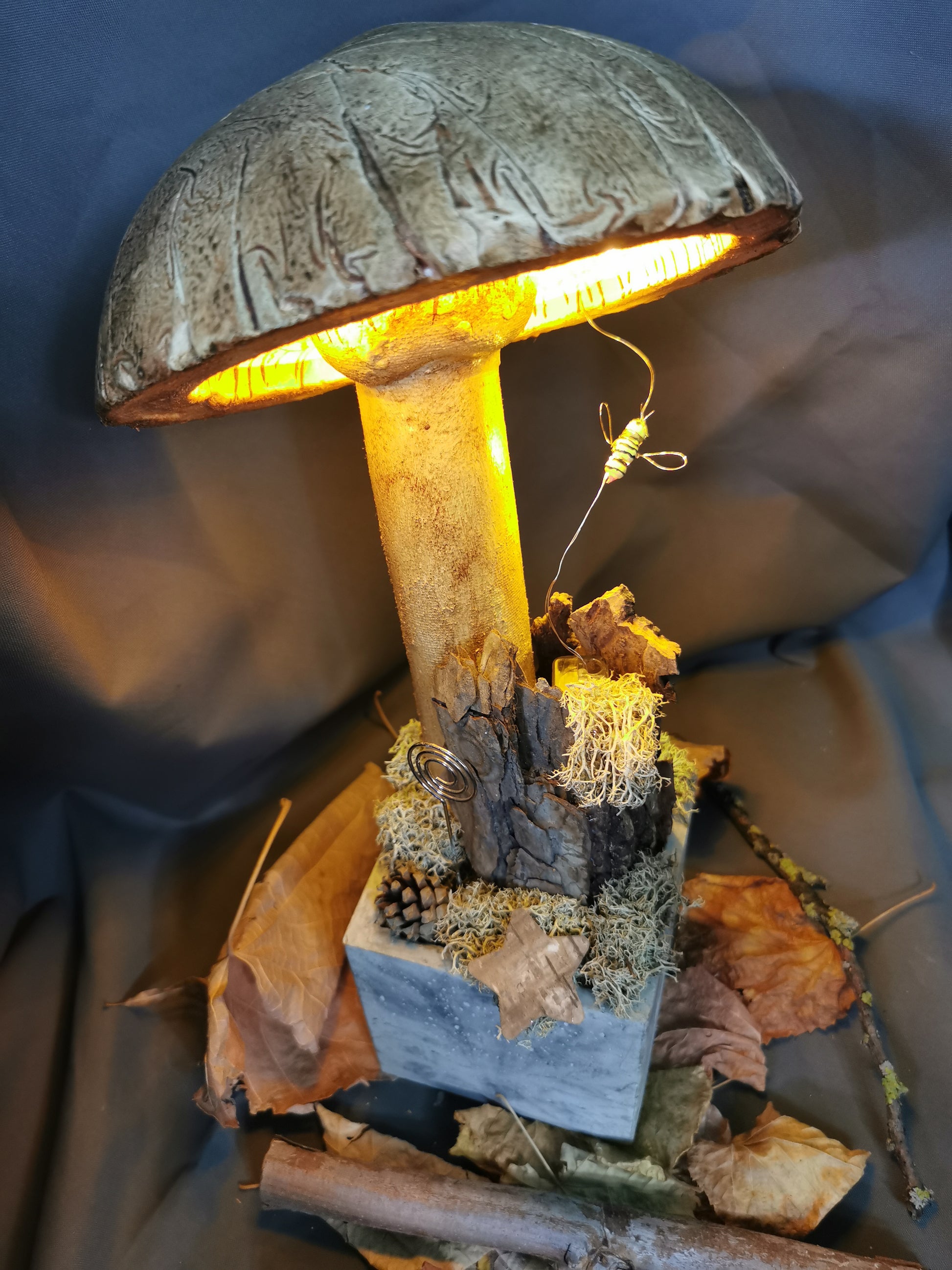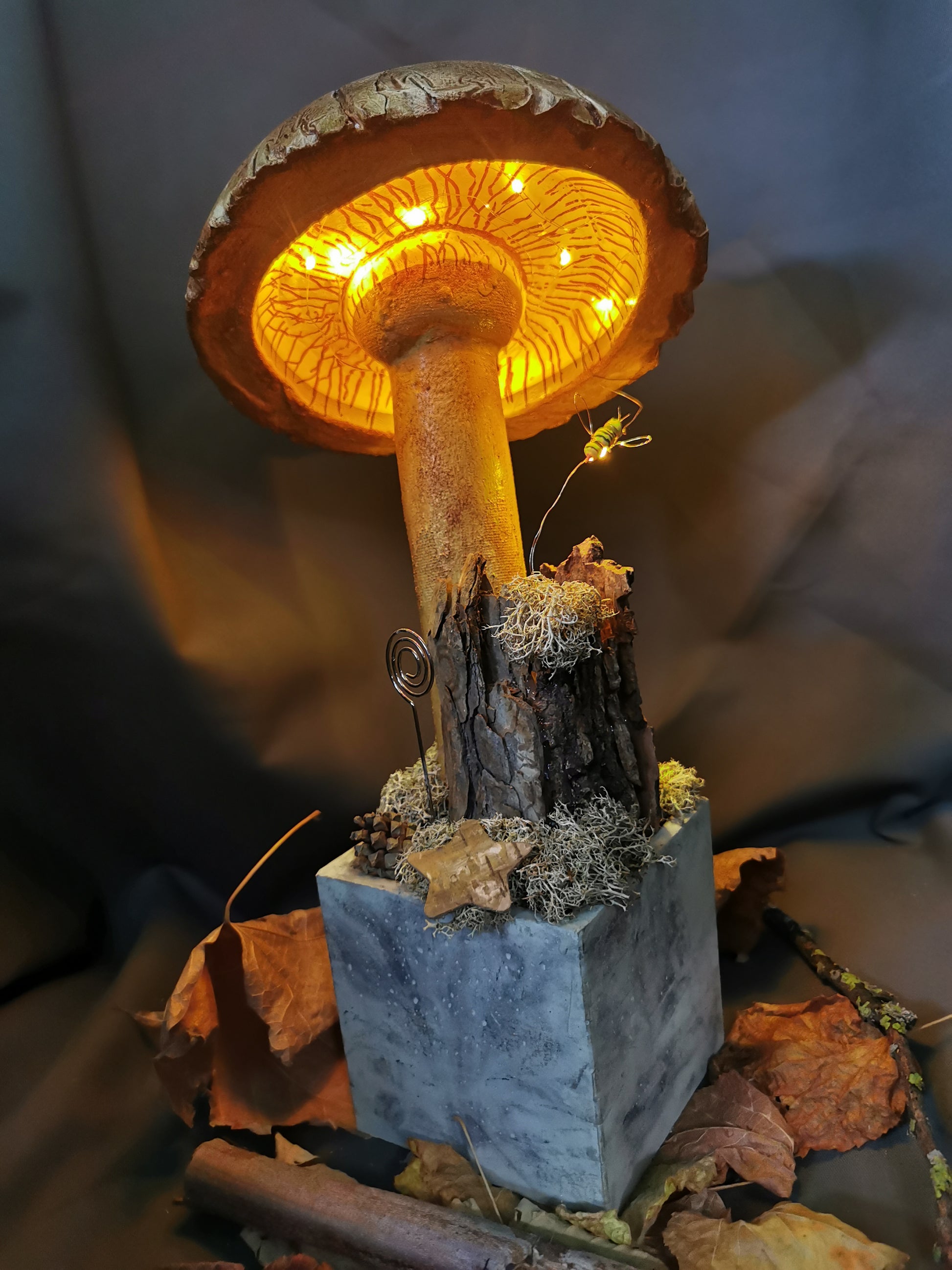 Betonpilz mit Licht, brauner Pilz mit in Epoxidharz eingelassener Lichterkette, Betontopf grau/schwarz marmoriert mit Filz unterlegt, in der Baumrinde ist das Endstück (AN/Aus, Batteriefach) versteckt. kann einfach herausgezogen werden um Batterien einzulegen oder zu wechseln. Eine kleine Holzbiene kaschiert den Draht zur Lichterkette. Deko des Topfes alles natürliche Materialien, Notizhalter aus Metall. Ein tolles Deko-Objekt mit indirekter Beleuchtung.
