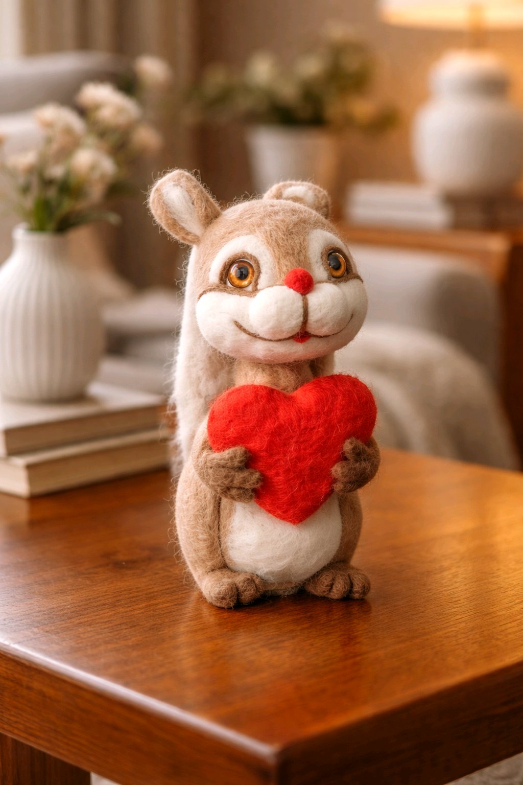 Filz Eichhörnchen mit Herz auf kleiner Holzscheibe