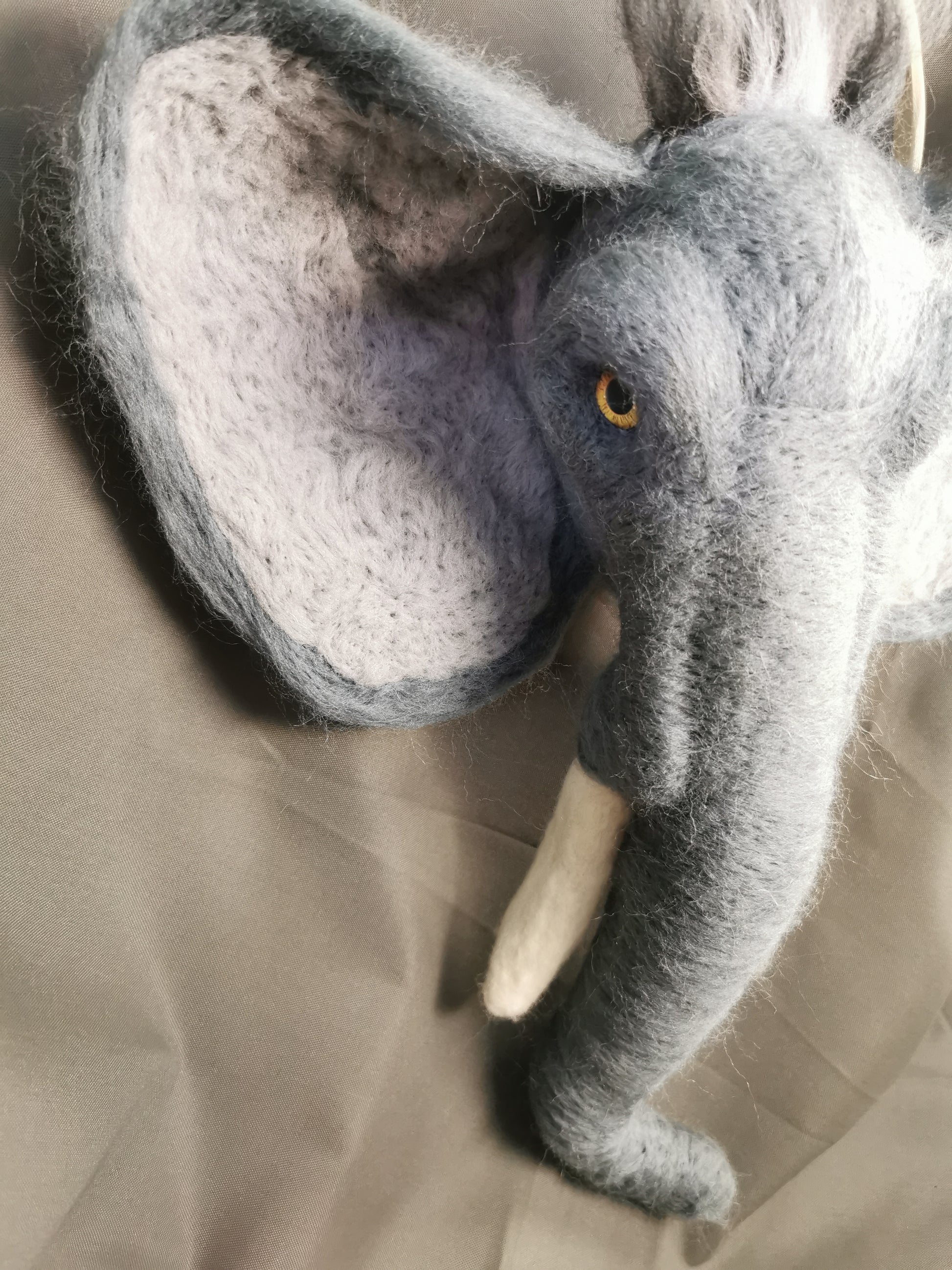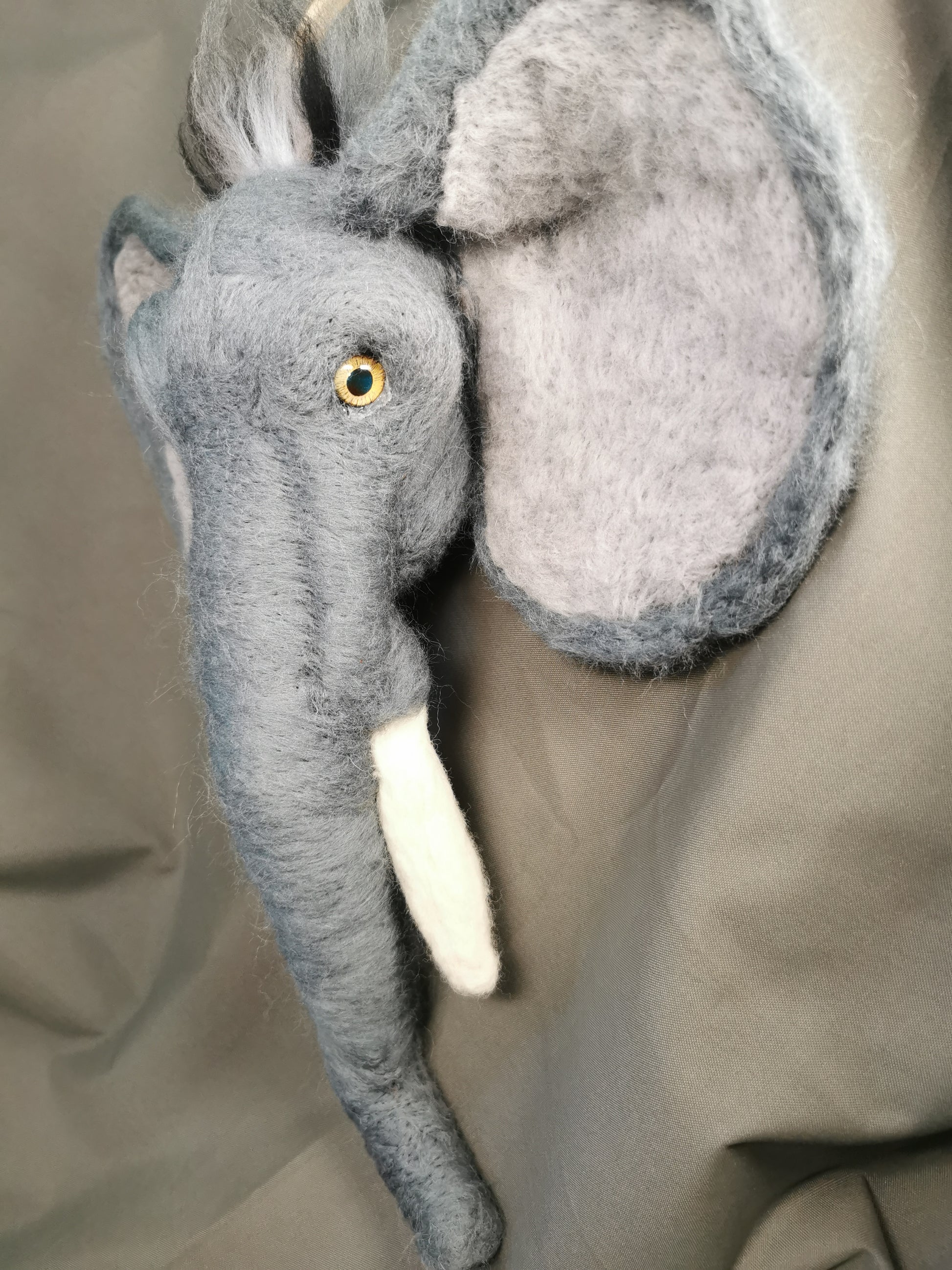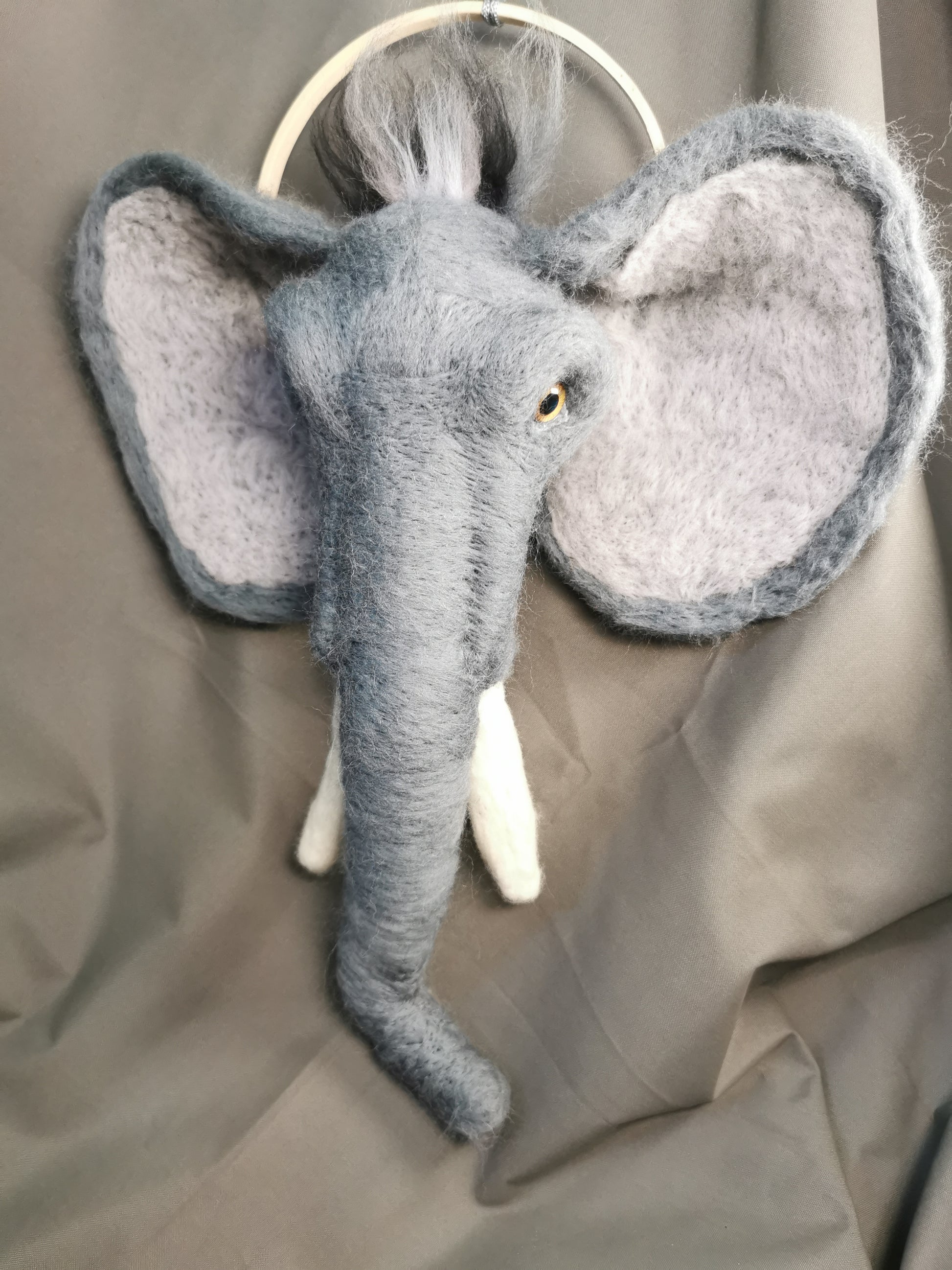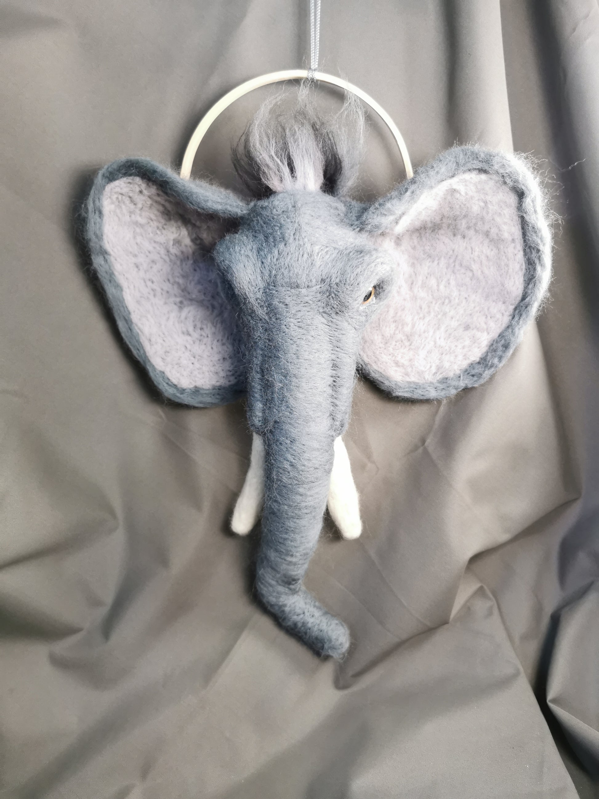 Filz Elefantenkopf (Einzelstück), an einem Bambusring befestigt ist dieser Elefantenkopf aus Filz und Glasaugen ein tolles Geschenk für jeden Elefantenliebhaber.