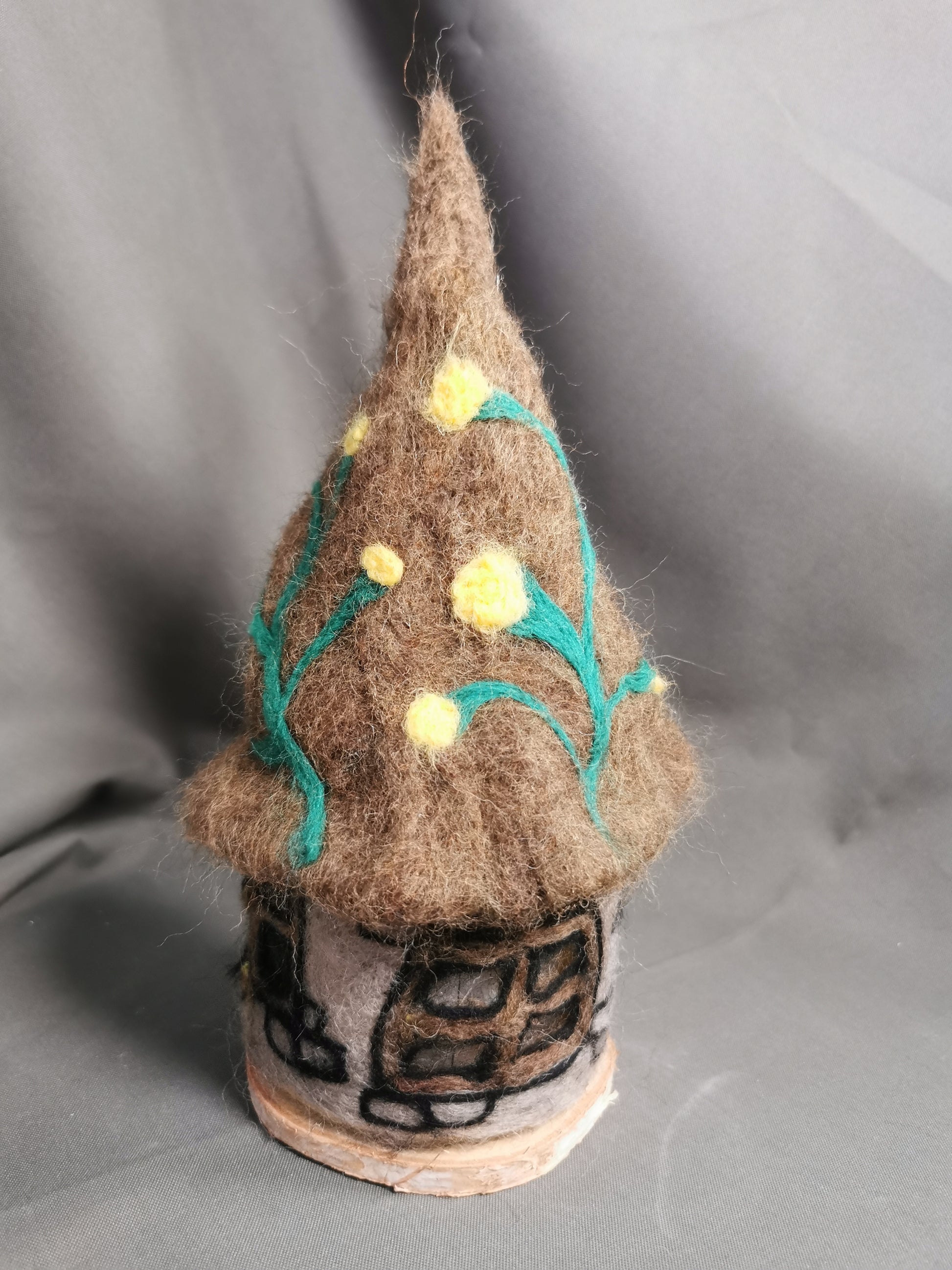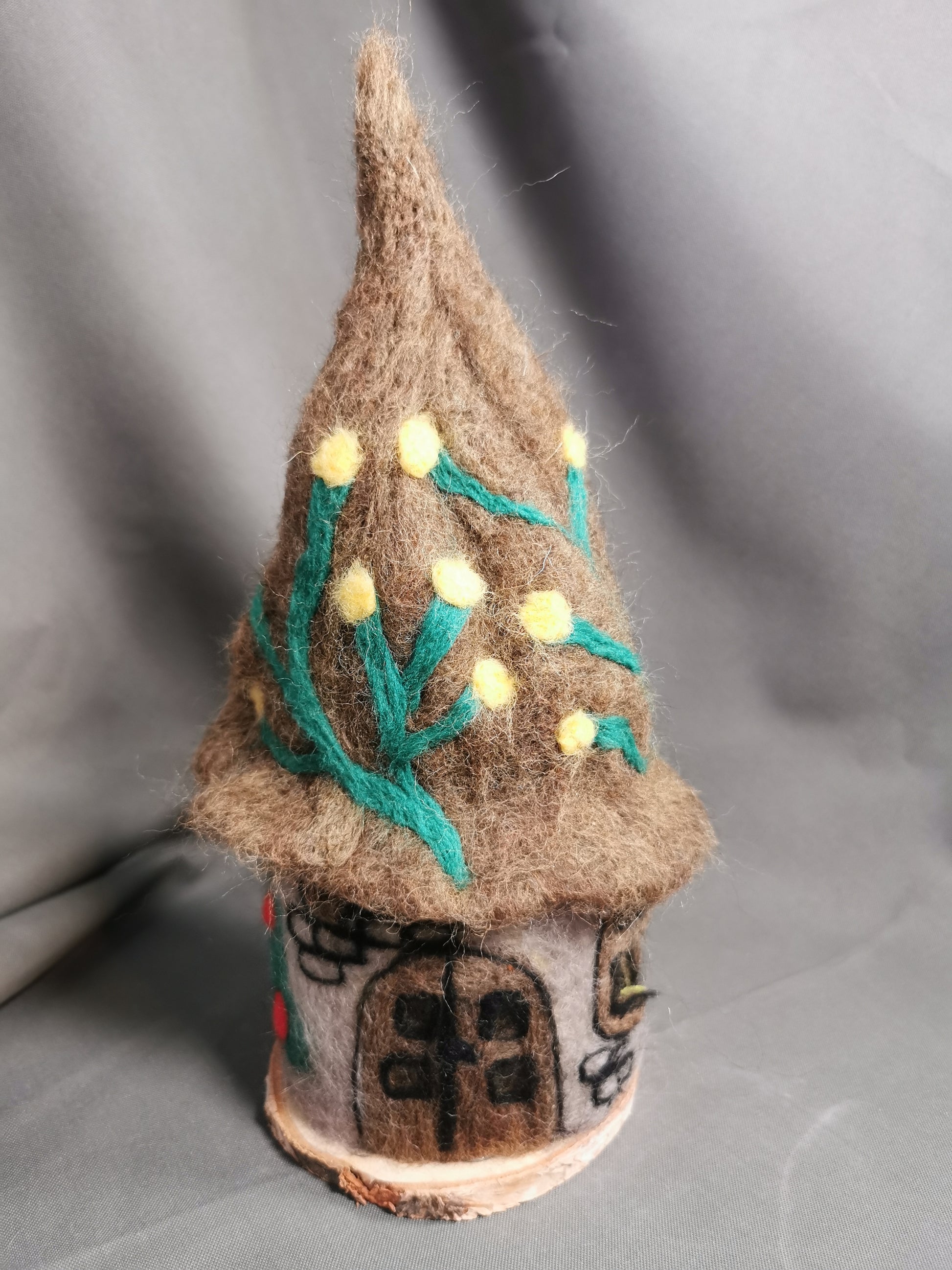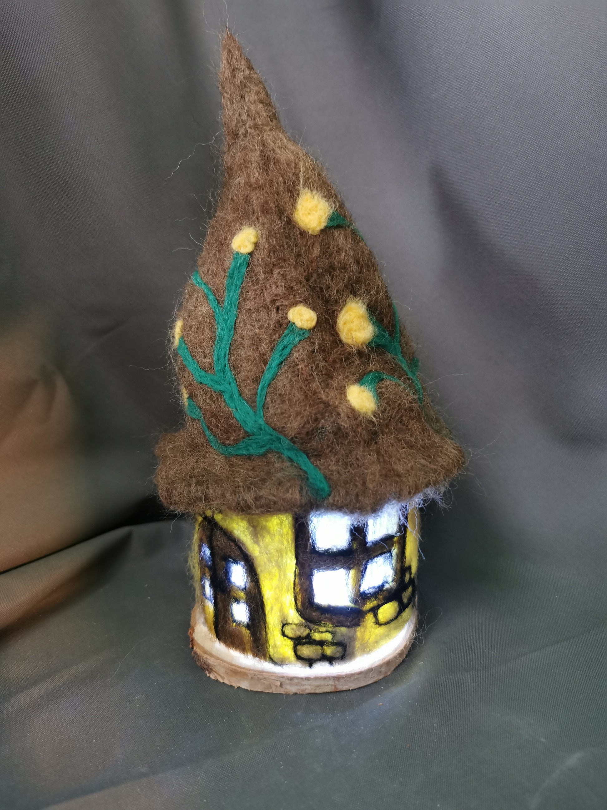 Ein schönes Wichtelhaus aus Filz und Glas, inkl. LED Lichterkette (inkl. Batterien). Das Dach kann man aufschrauben um die Lichterkette An/Aus zu machen oder einen Batteriewechsel vorzunehmen.