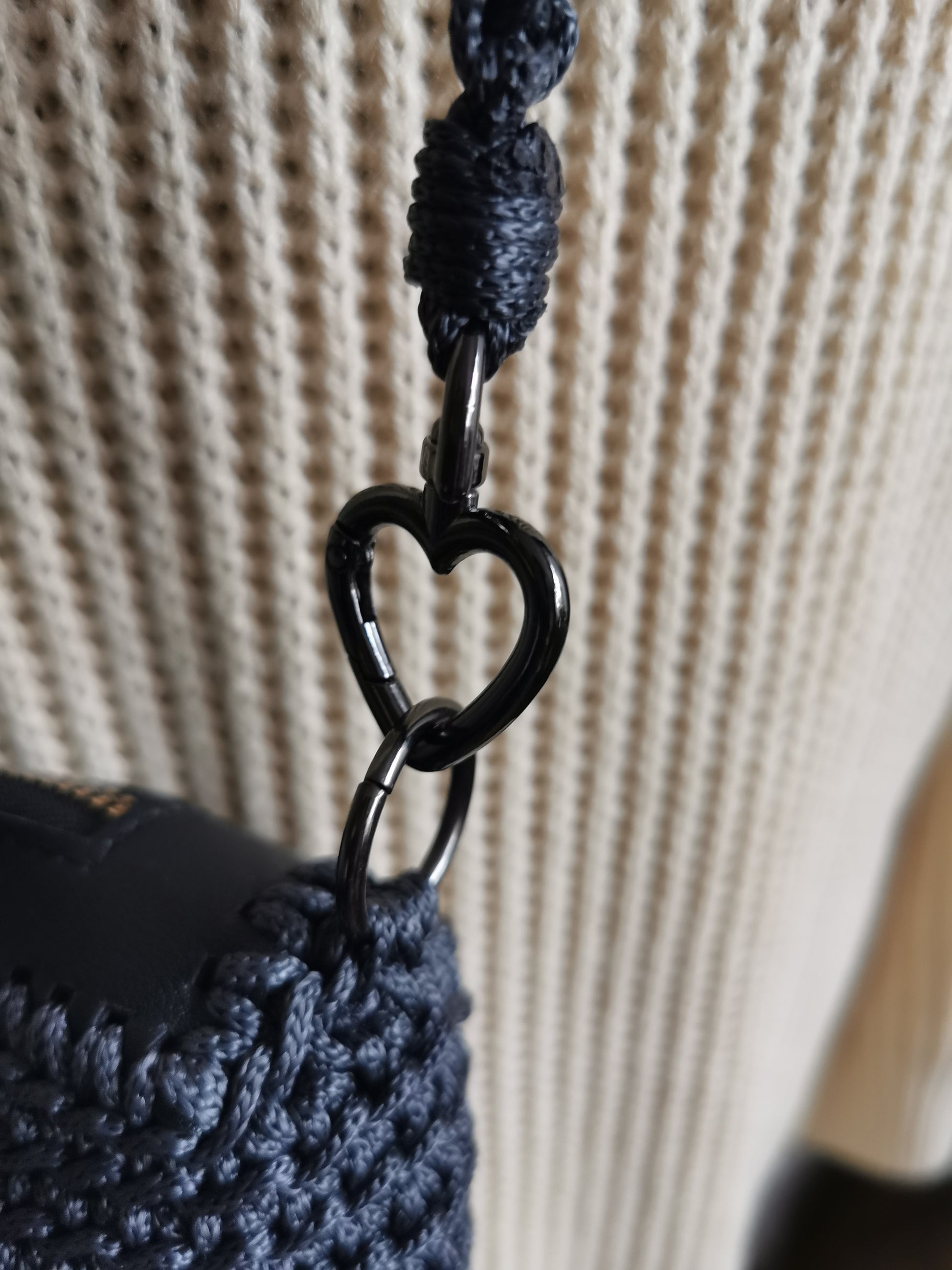 Handtasche mit Reißverschluss und separater Innentasche - Einzelstück, gehäkelt aus geflochtenem Kunstgarn anthrazit, Reißverschluss auf schwarzem Kunstleder genäht, Tragstrick (Makramee) inkl. Herzkarabiner.