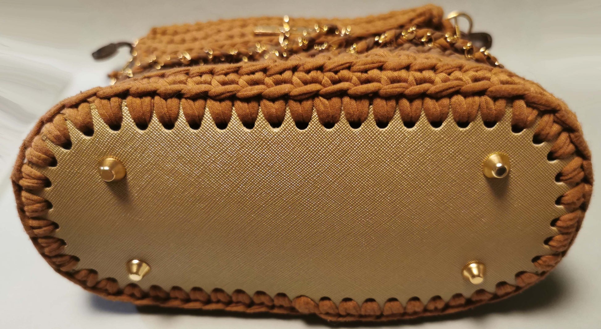Diese einzigartige Handtasche wurde liebevoll aus T-Shirt-Garn in zwei harmonischen Brauntönen gehäkelt – ein echtes Unikat! Sie überzeugt mit einer praktischen separaten Innentasche für mehr Ordnung und zwei sicheren Magnetverschlüssen.