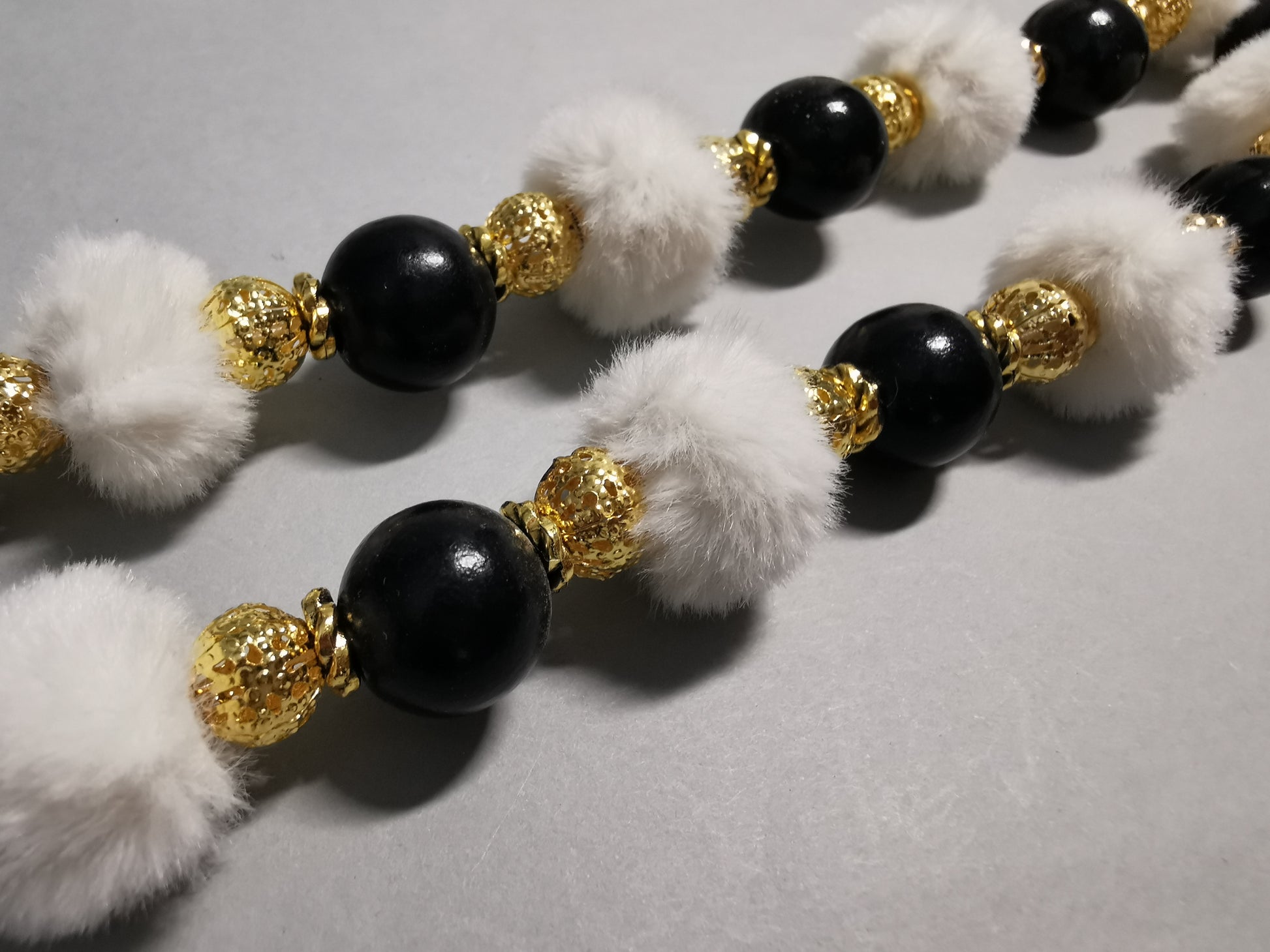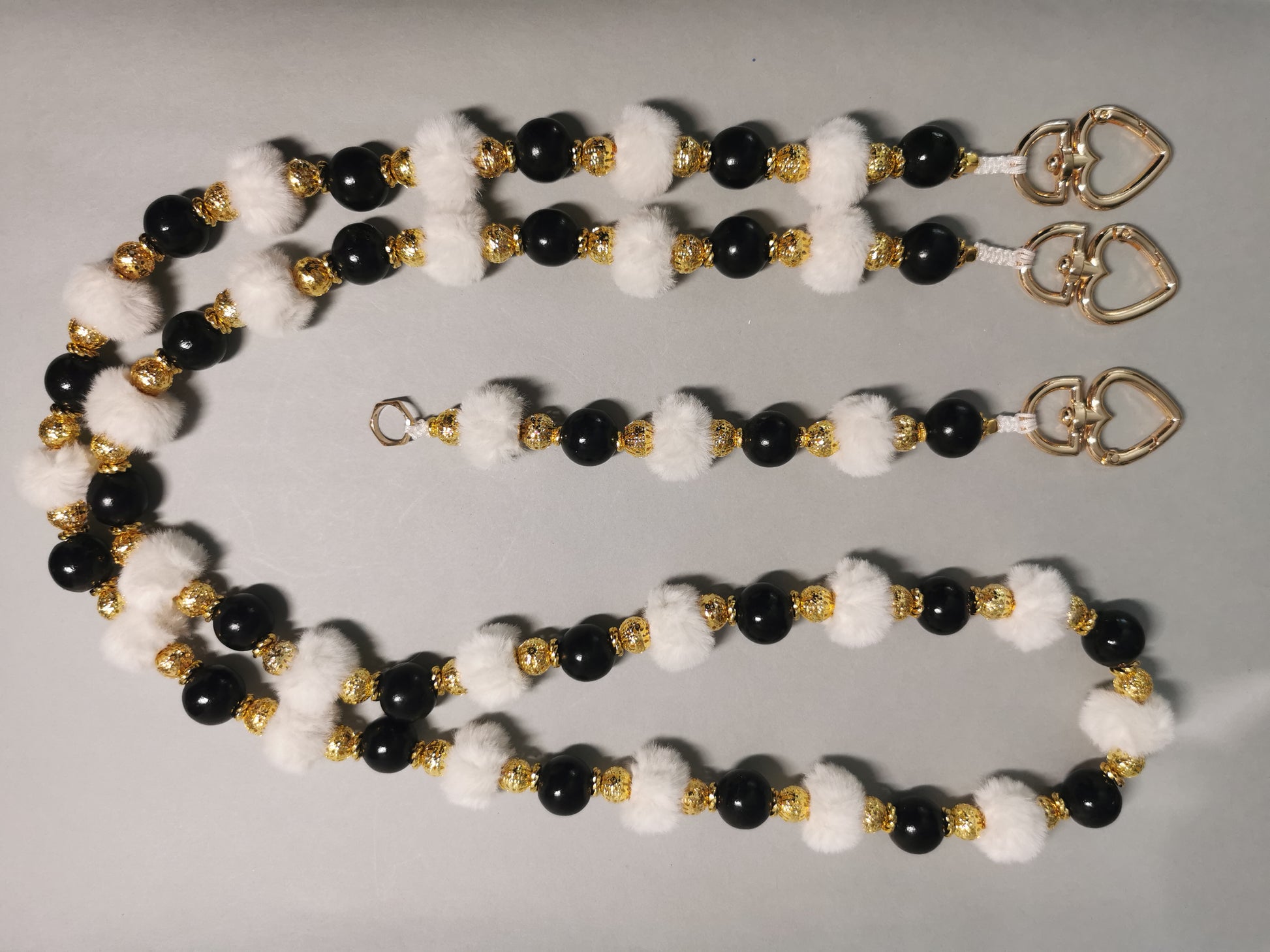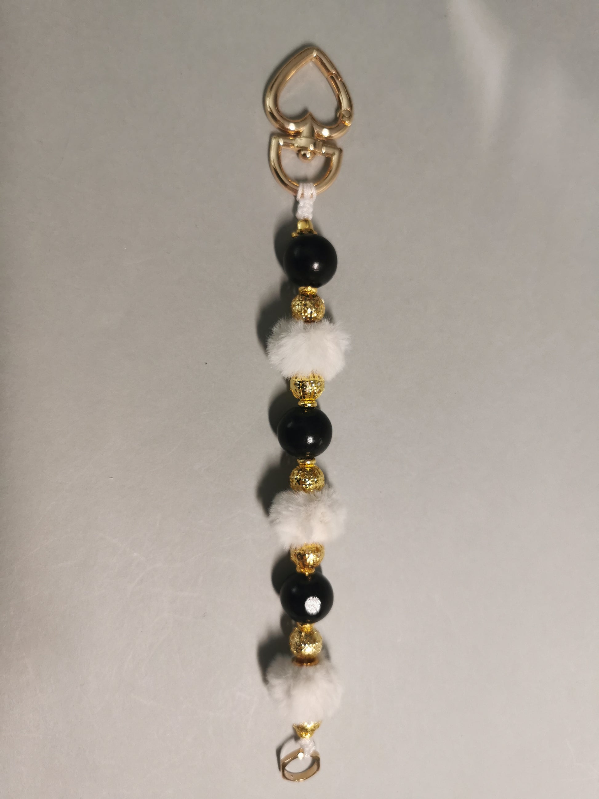 Holz-, Kunstfellperlenhandykette, 15 mm schwarze Holzperlen mit 9 mm goldfarbenen Metall Hohlperlen und weiße Kaninchenkunstfellperlen, goldfarbene Zwischenperlen mit Strass und goldfarbenen Herzkarabiner. Handykette universal, handgefertigt in Deutschland, Necklace zum umhängen, kompatibel mit allen Smartphone, Handyhülle erforderlich (nicht im Lieferumfang enthalten). Bindung: spezielle Schnürung für einen langlebigen Halt, inkl. Pad. und Verlängerungskette mit goldfarbenen Herzkarabiner und Einsteckring. Verlängerung kann auch als Handytrageschlaufe, Schlüsselanhänger, Taschenschmuck getragen werden.