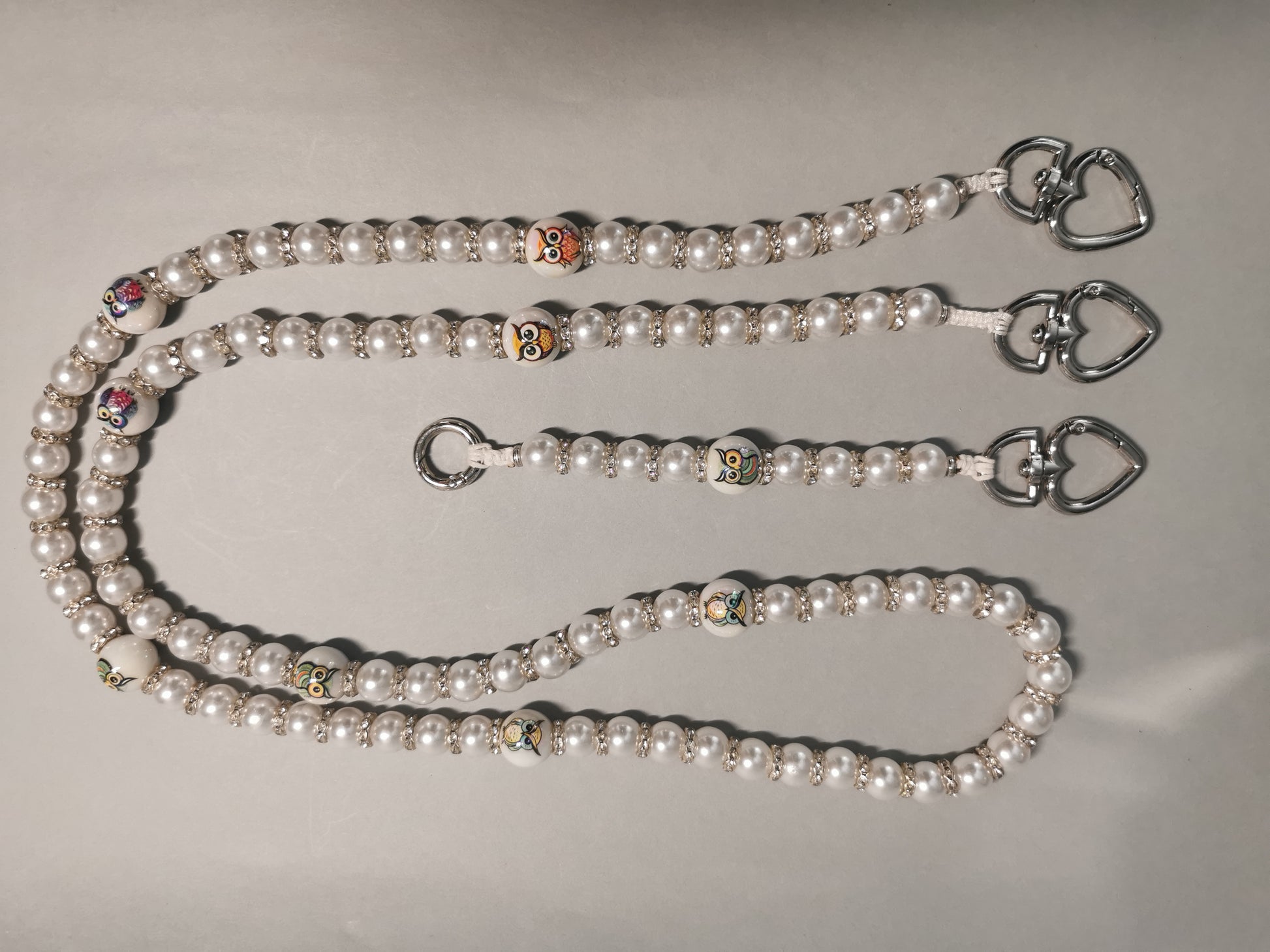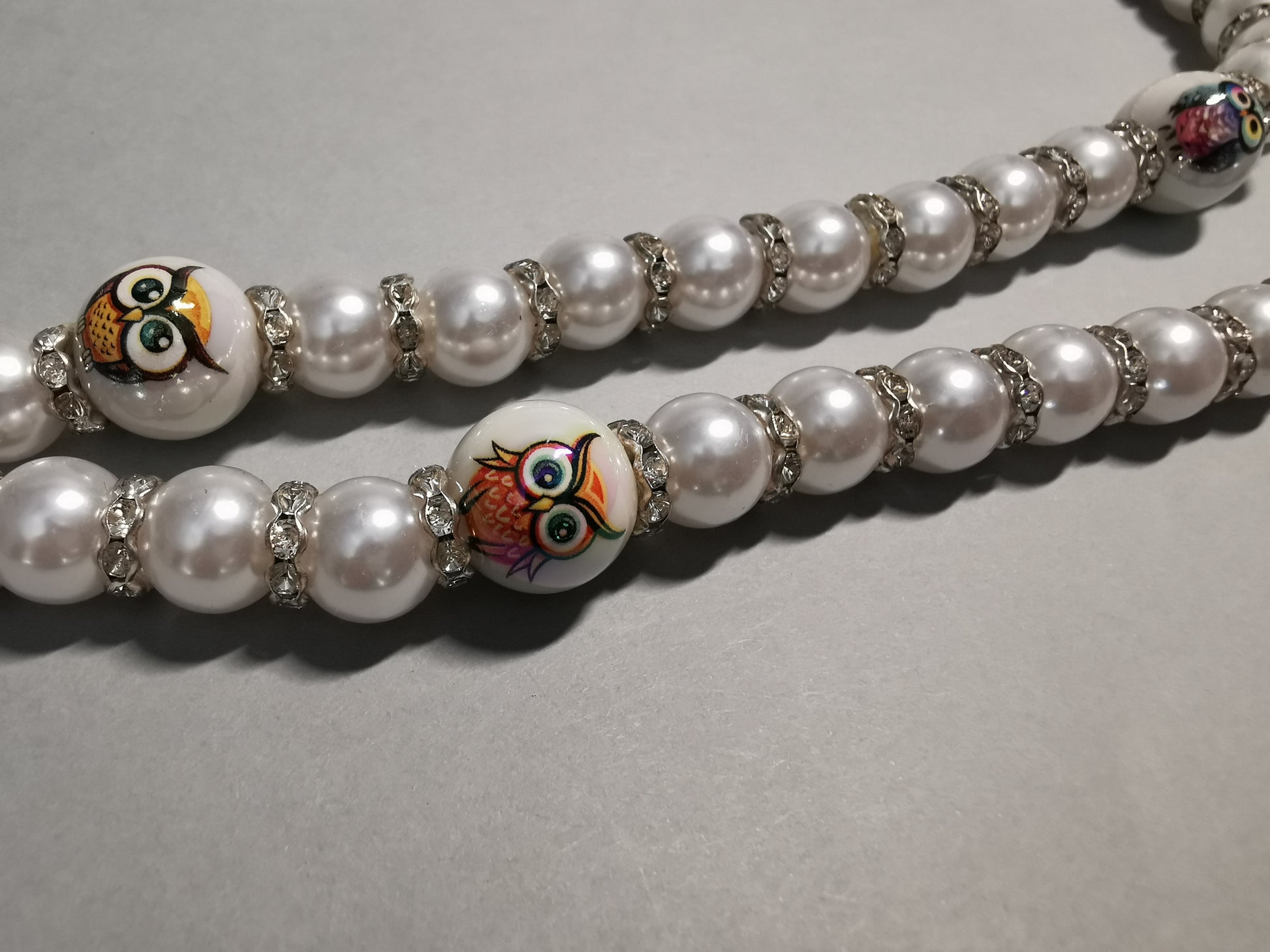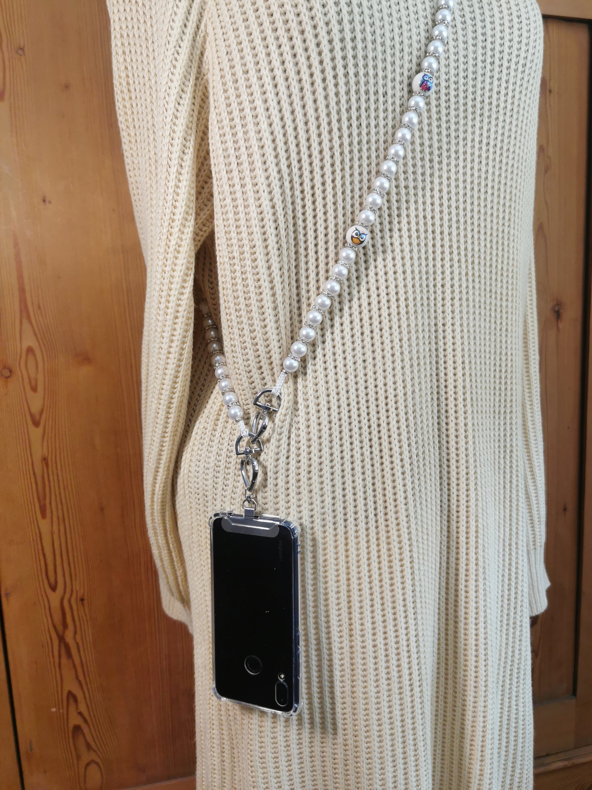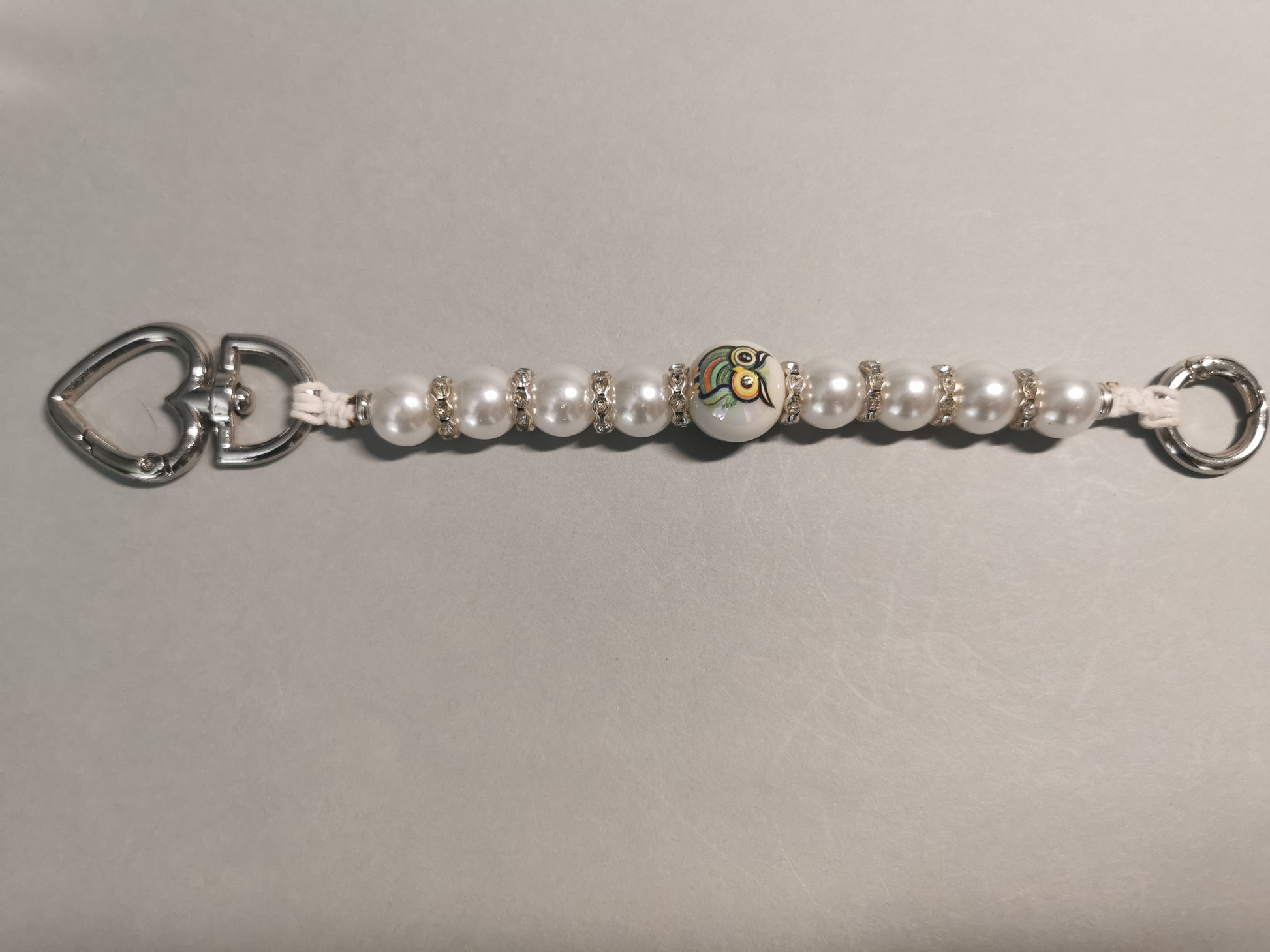 Acrylperlenhandykette mit Eulen, 11 mm Acrylperlen in weiß, 15mm Acrylperle mit Eulen Applikation, silberfarbene Zwischenperlen mit Strass. mit silberfarbenen Herzkarabiner. Handykette universal, handgefertigt in Deutschland, Necklace zum umhängen, kompatibel mit allen Smartphone, Handyhülle erforderlich (nicht im Lieferumfang enthalten). Bindung: spezielle Schnürung für einen langlebigen Halt, inkl. Pad. und Verlängerungskette mit silberfarbenen Herzkarabiner und Karabinerring. Verlängerung kann auch als Handytrageschlaufe, Schlüsselanhänger oder Taschenschmuck getragen werden.