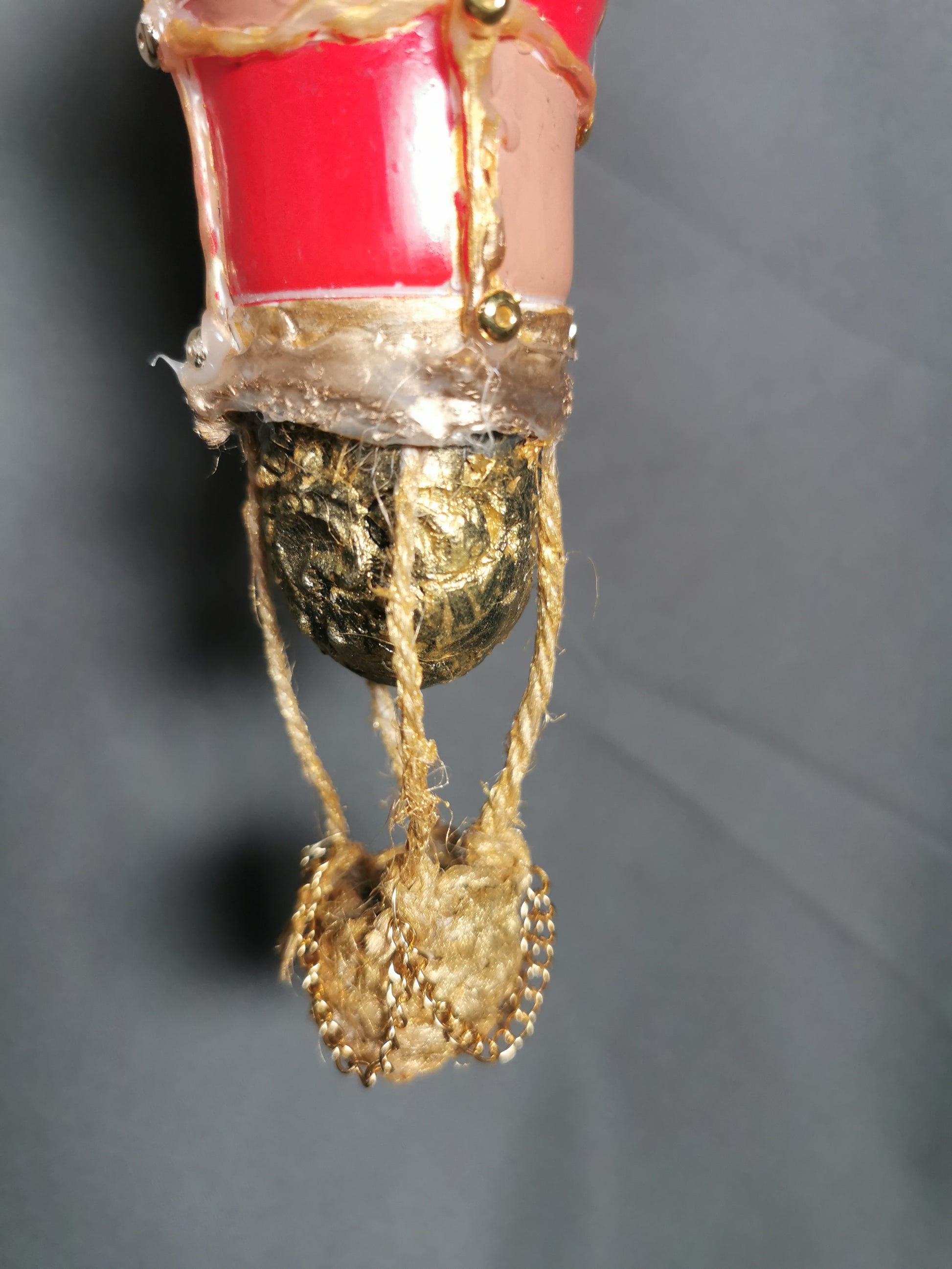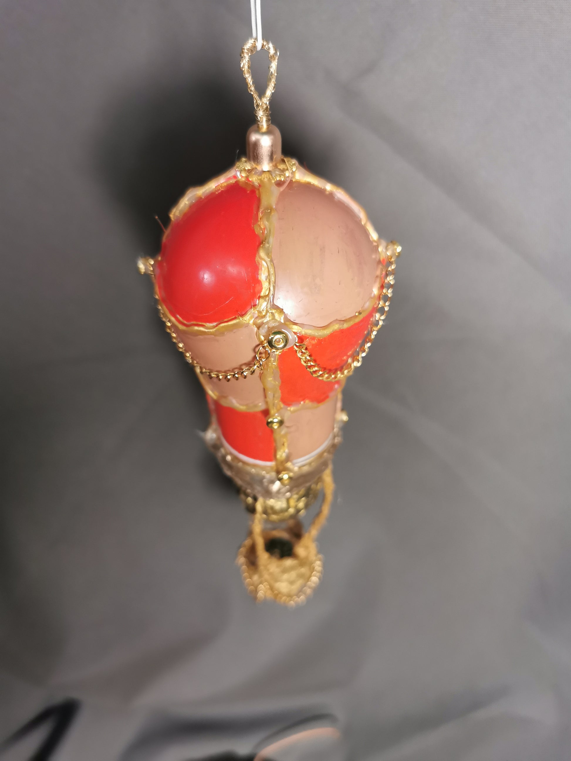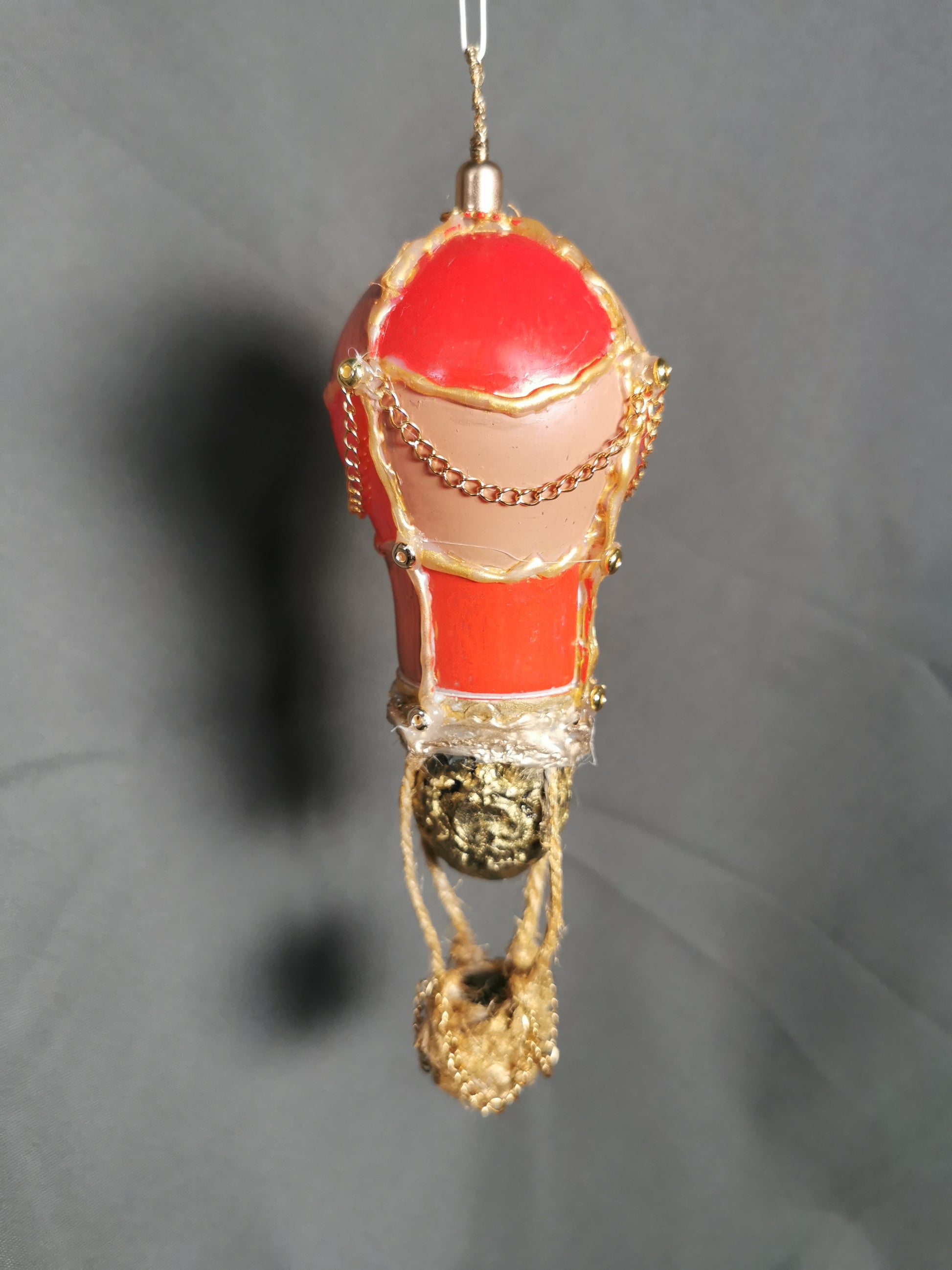 kleiner Heißluftballon, aus einer alten normalen Glühbirne hergestellt, rot/braun/goldfarben, verziert mit goldfarbener Kette und Plattperlen. Ob im Fenster oder im Raum, ein toller Hingucker!
