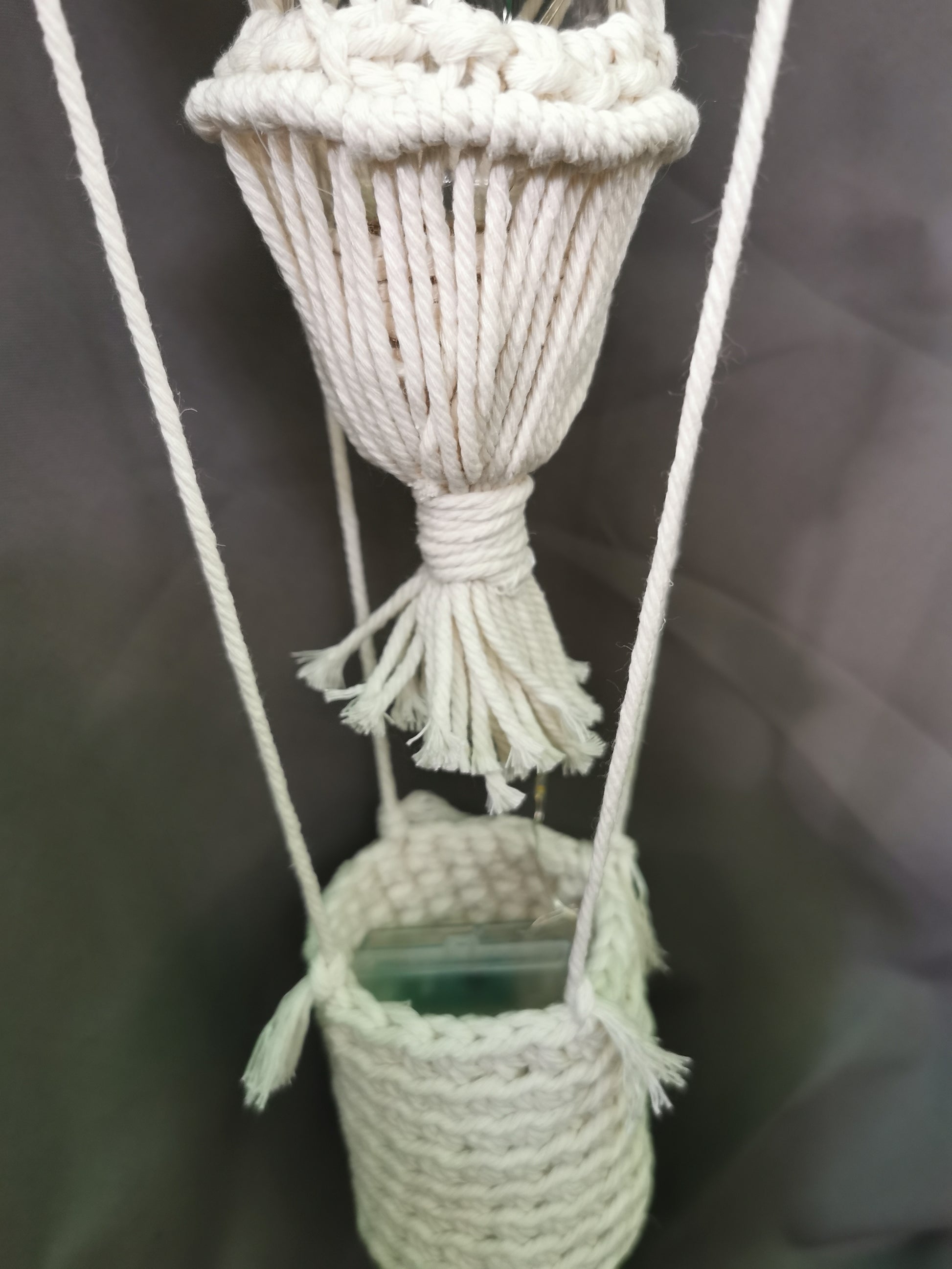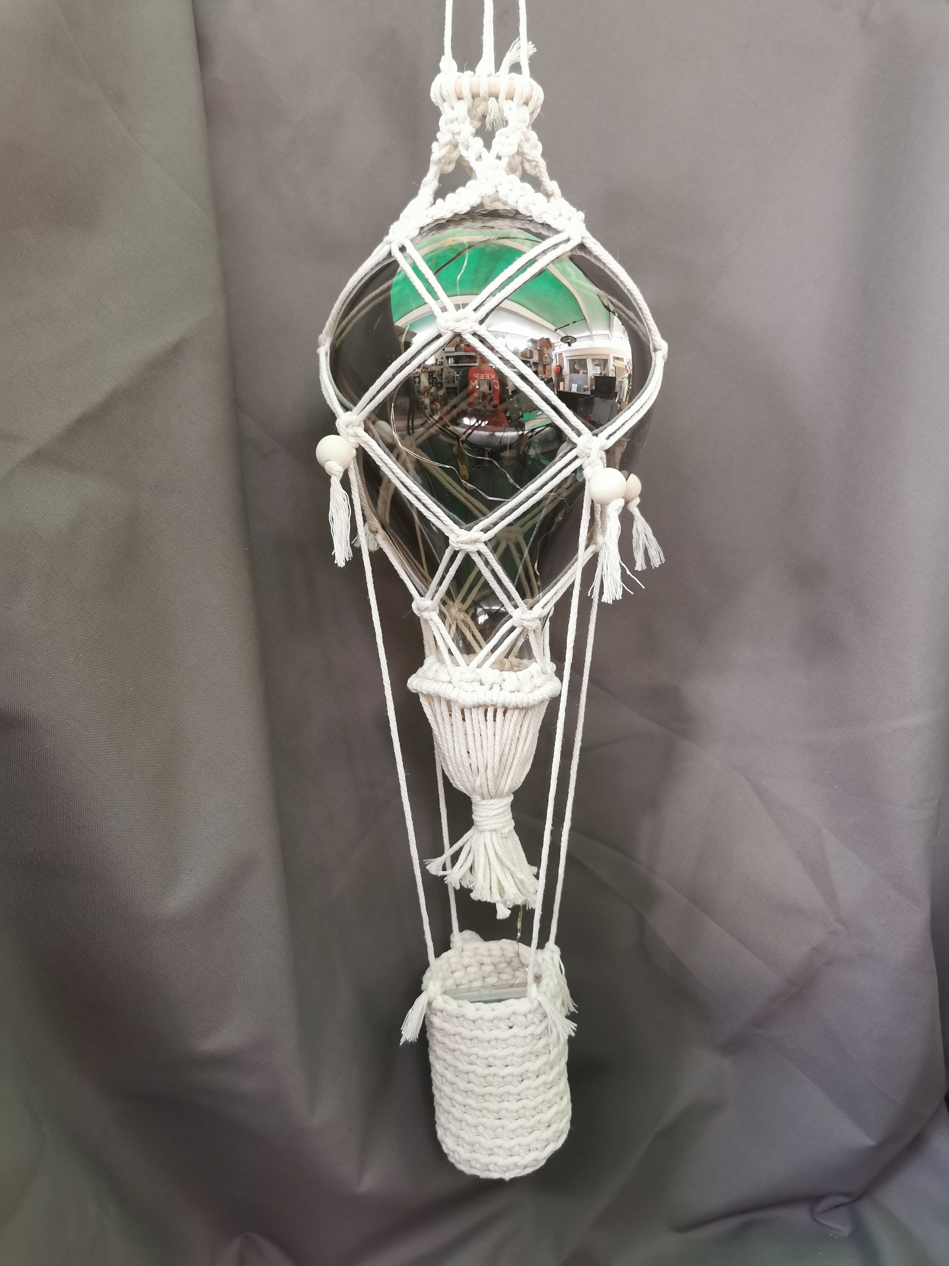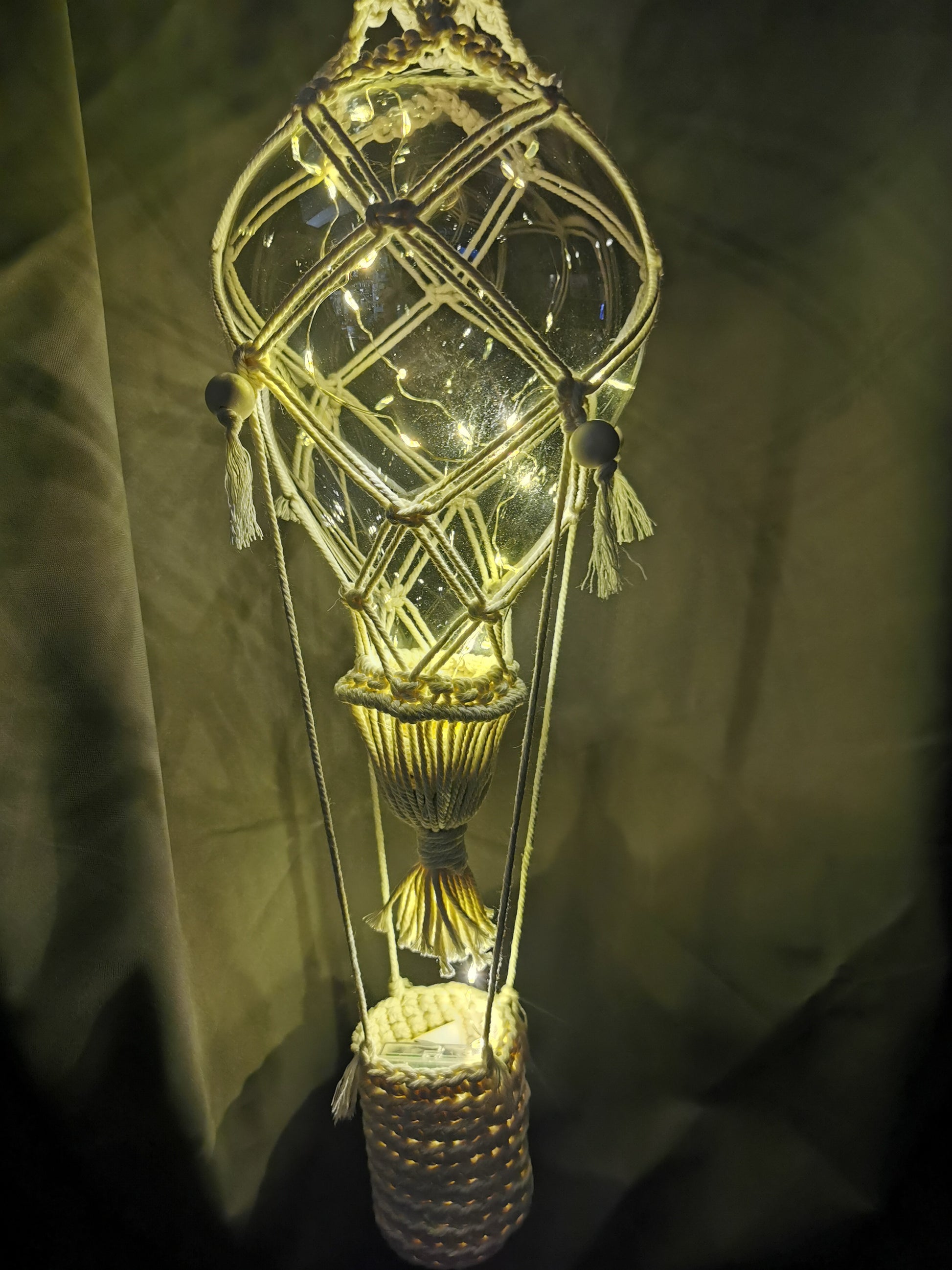 Leuchtender Heißluftballon, aus einer sehr großen getönten Glühbirne wurde ein tolles Deko-Objekt, mit Makramee verknotetes Gebinde und gehäkeltem Ballonkorb. Lichterkette mit 20 Lichtern und Timer, multicolor oder warmweiß, 8 Einstellungen. (Batterien nicht im Lieferumfang)