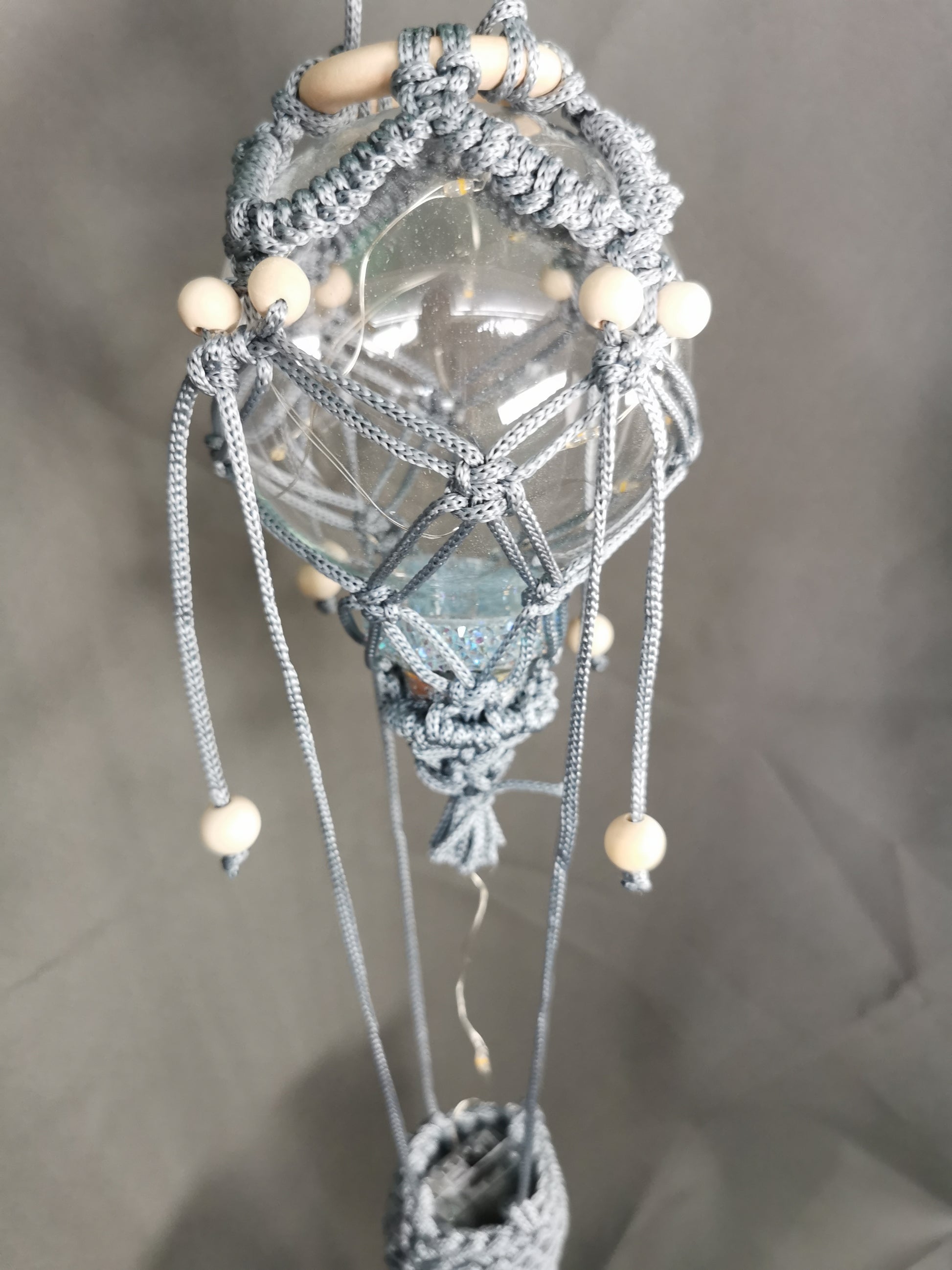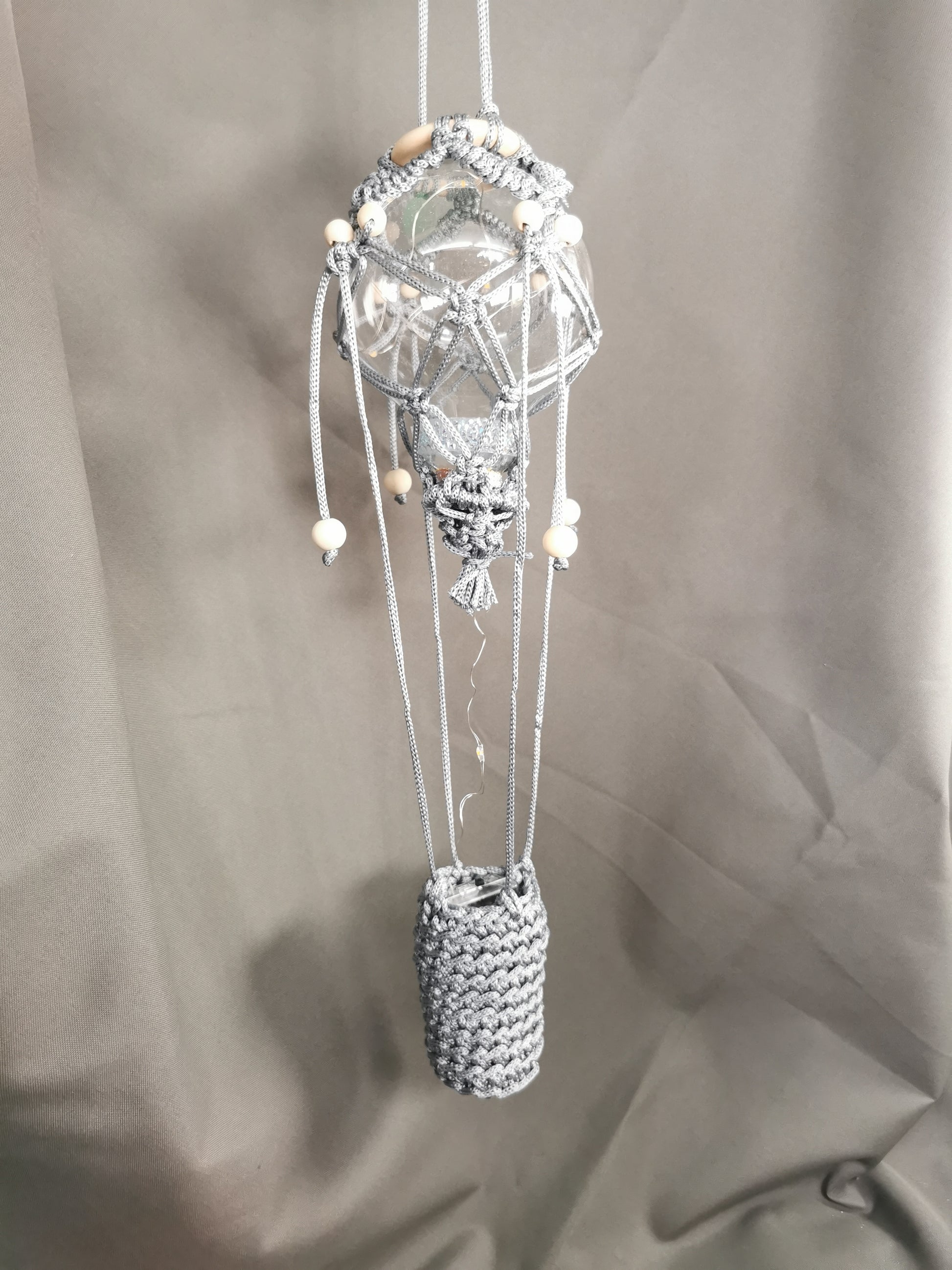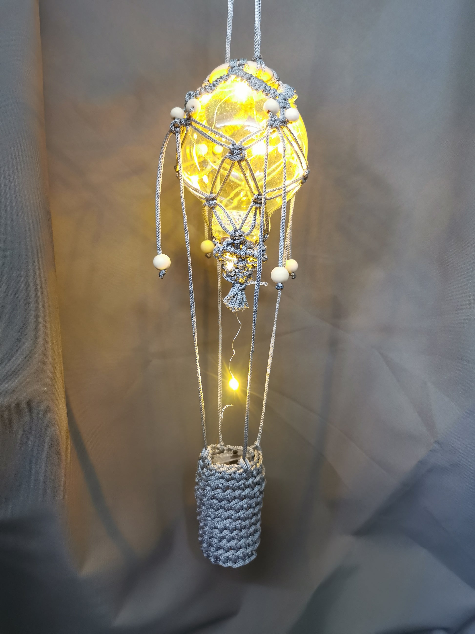 Leuchtender Heißluftballon, aus einer großen Glühbirne wurde ein tolles Deko-Objekt, mit Makramee verknotetes Gebinde und gehäkeltem Ballonkorb. Lichterkette mit 10 Lichtern, warmweiß (Batterien nicht im Lieferumfang)