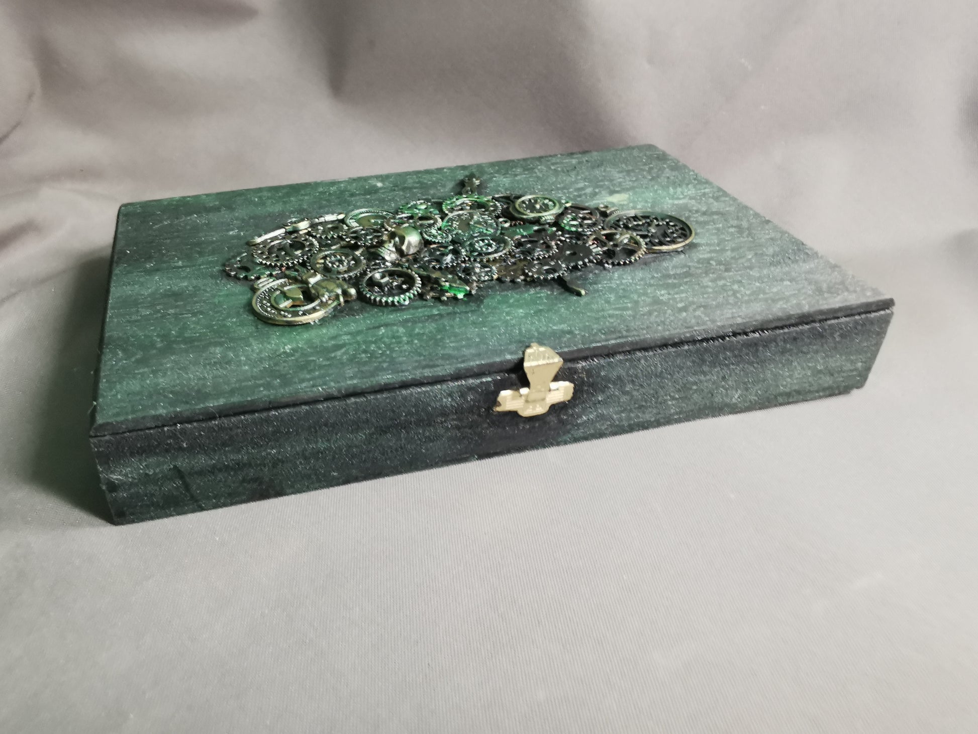 Steampunk-Holzschachtel mit Verschluss, ob als Schmuckschachtel oder für Kleinigkeiten, immer ein toller Hingucker. Die Schachtel besteht aus Holz mit Steampunk Accessoires bestückt mit Verschluss, in schwarz/goldfarben. Innen mit Kork ausgelegt, Unterseite ist mit Moosgummi belegt.