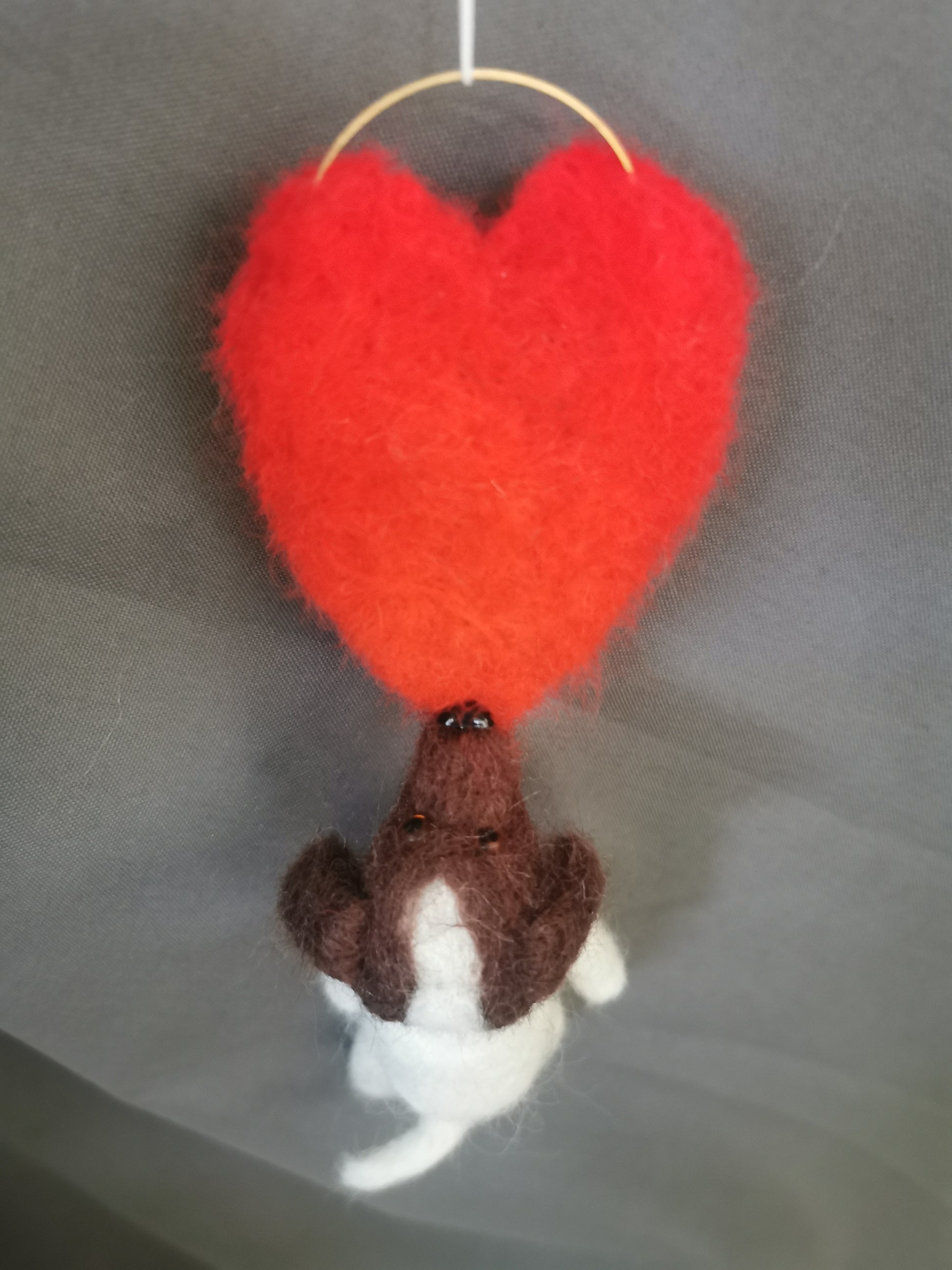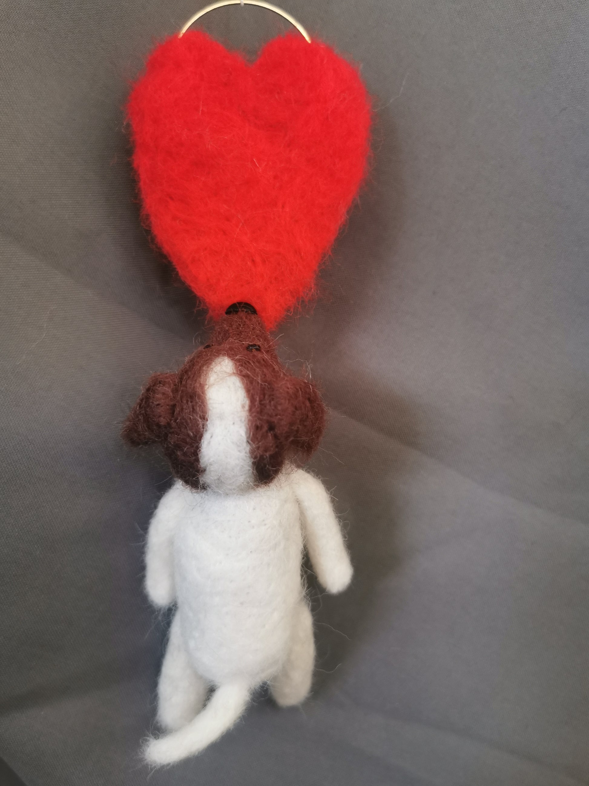 Filz Hund beißt in ein Filz-Herz, zum aufhängen handgefertigt