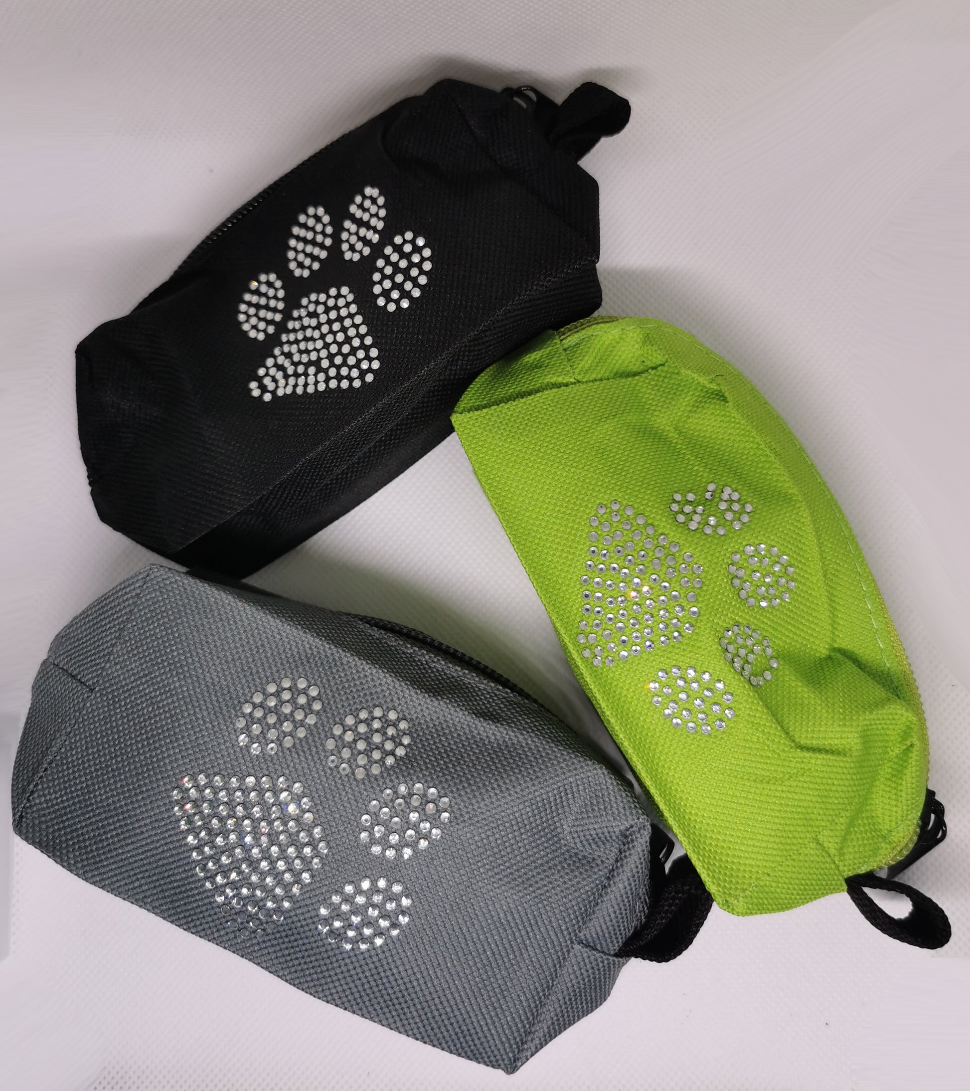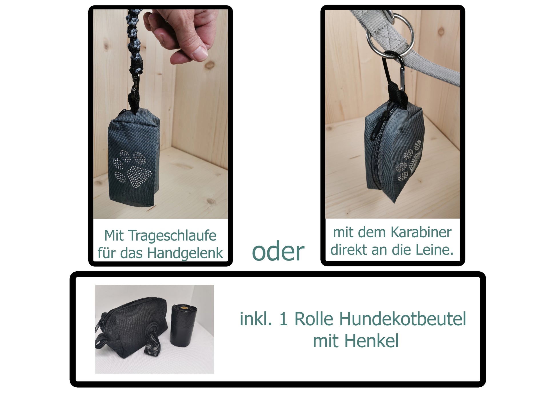 Hundekotbeutel-Tasche, groß mit Strasspfote, Reißverschluss und Kotbeutel-Gummidurchzug, Trageschlaufe und einzelnem Karabiner. Bequem tragen oder direkt mit dem Karabiner an die Hundeleine befestigen. Inkl. 1 Rolle Kotbeutel mit Trageschlaufe.