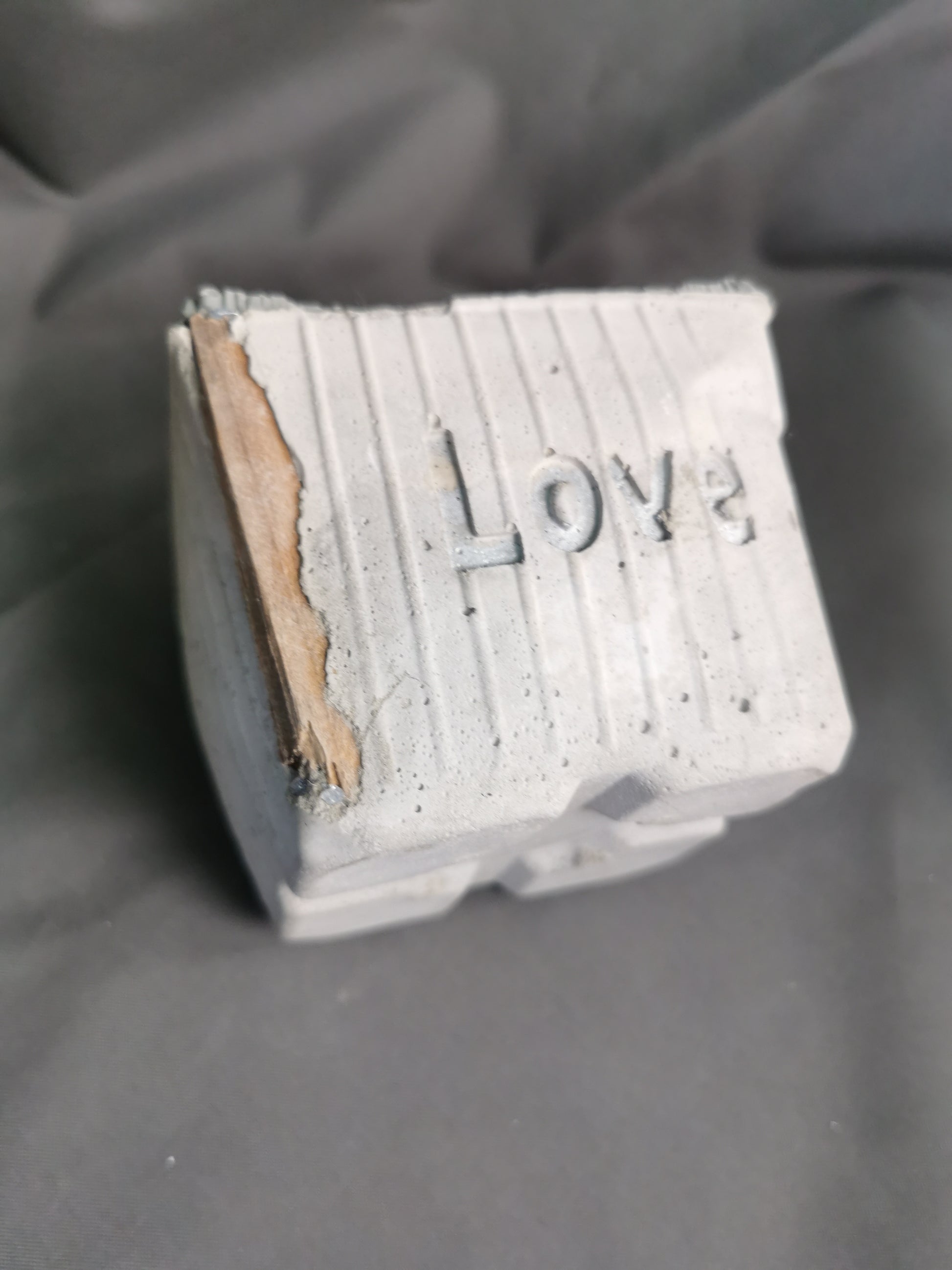 Kerzenhalter mit Holz-Ecke, handgefertigt mit Beton in einer Ecke wurde ein altes Holzstück mit eingegossen, sowie der Schriftzug "Love", oben auf den Ecken kleine Beton Applikationen (ohne Kerze)