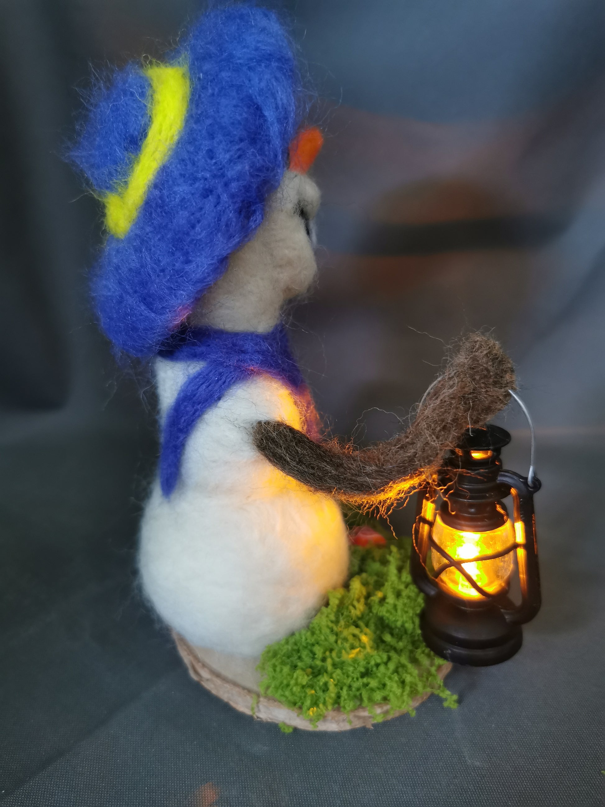 Lustiger Filz Schneemann mit Leuchte auf Holzscheibe, handgefertigt, Einzelstück
