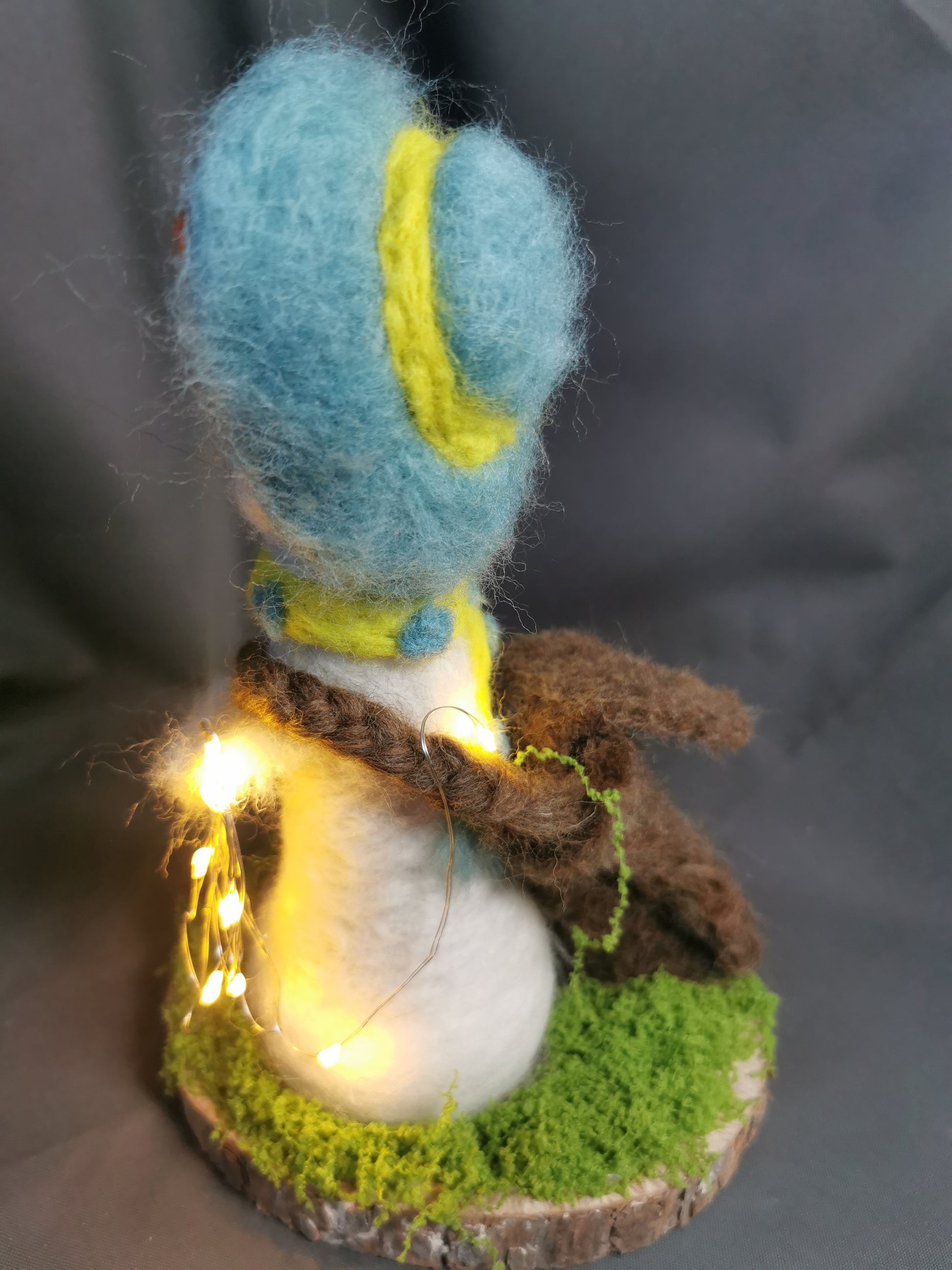 Lustiger Filz Schneemann mit Lichterkette mit Tannenzapfen auf einer Holzscheibe, handgefertigt, Einzelstück