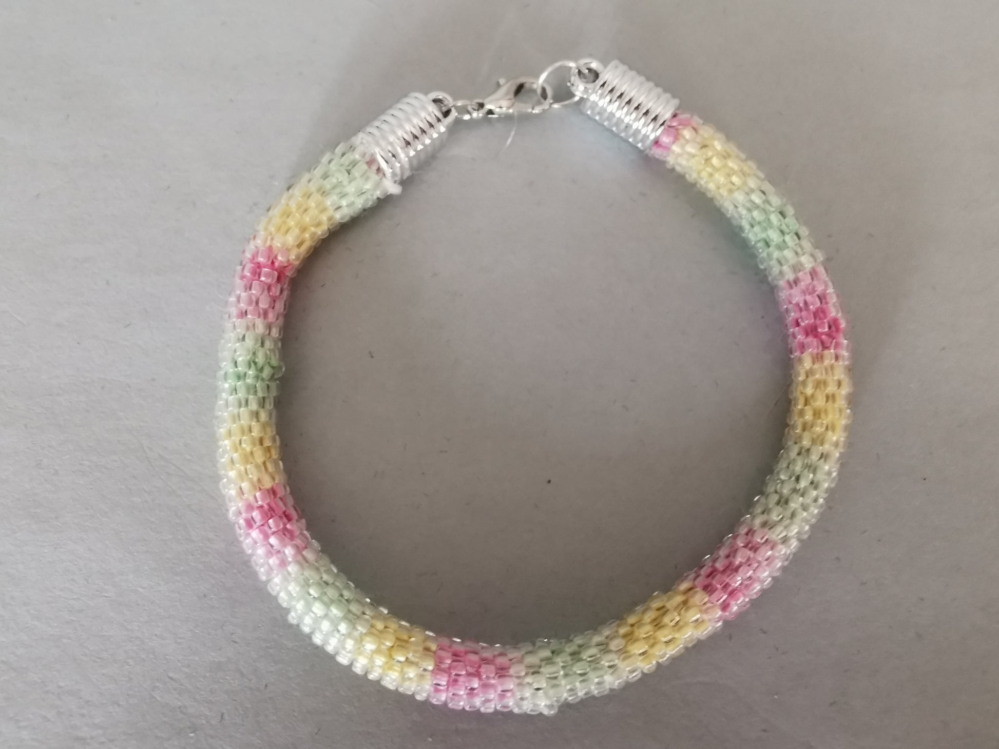 Perlenhäkelarmband, transparente Perlen auf Farbverlaufsgarn gehäkelt, silberfarbene Endkappen mit Karabinerverschluss