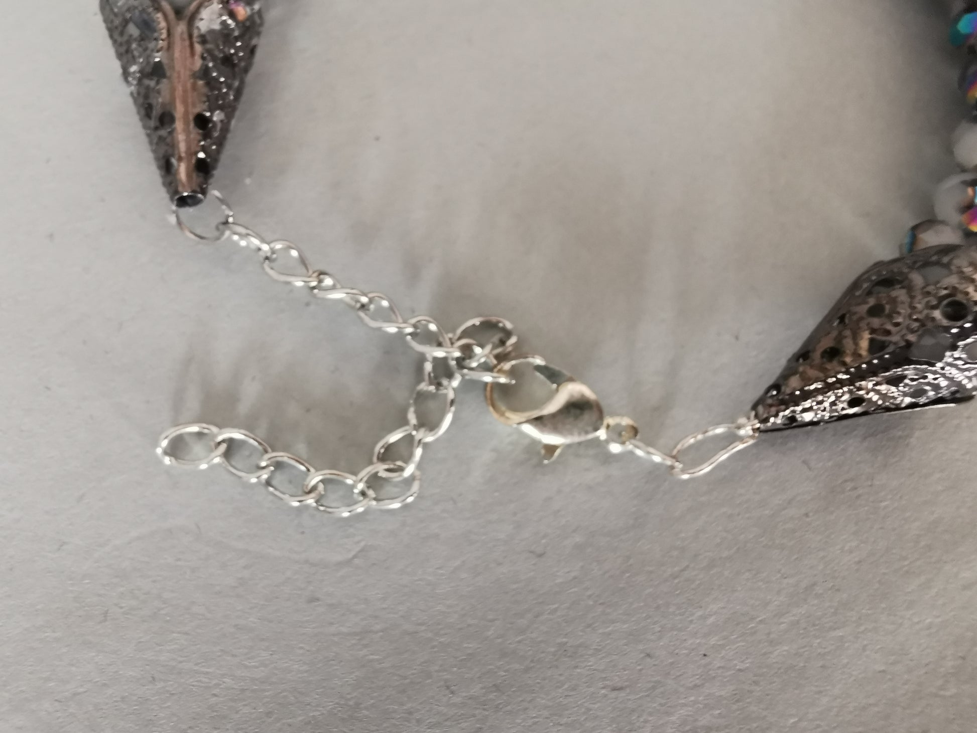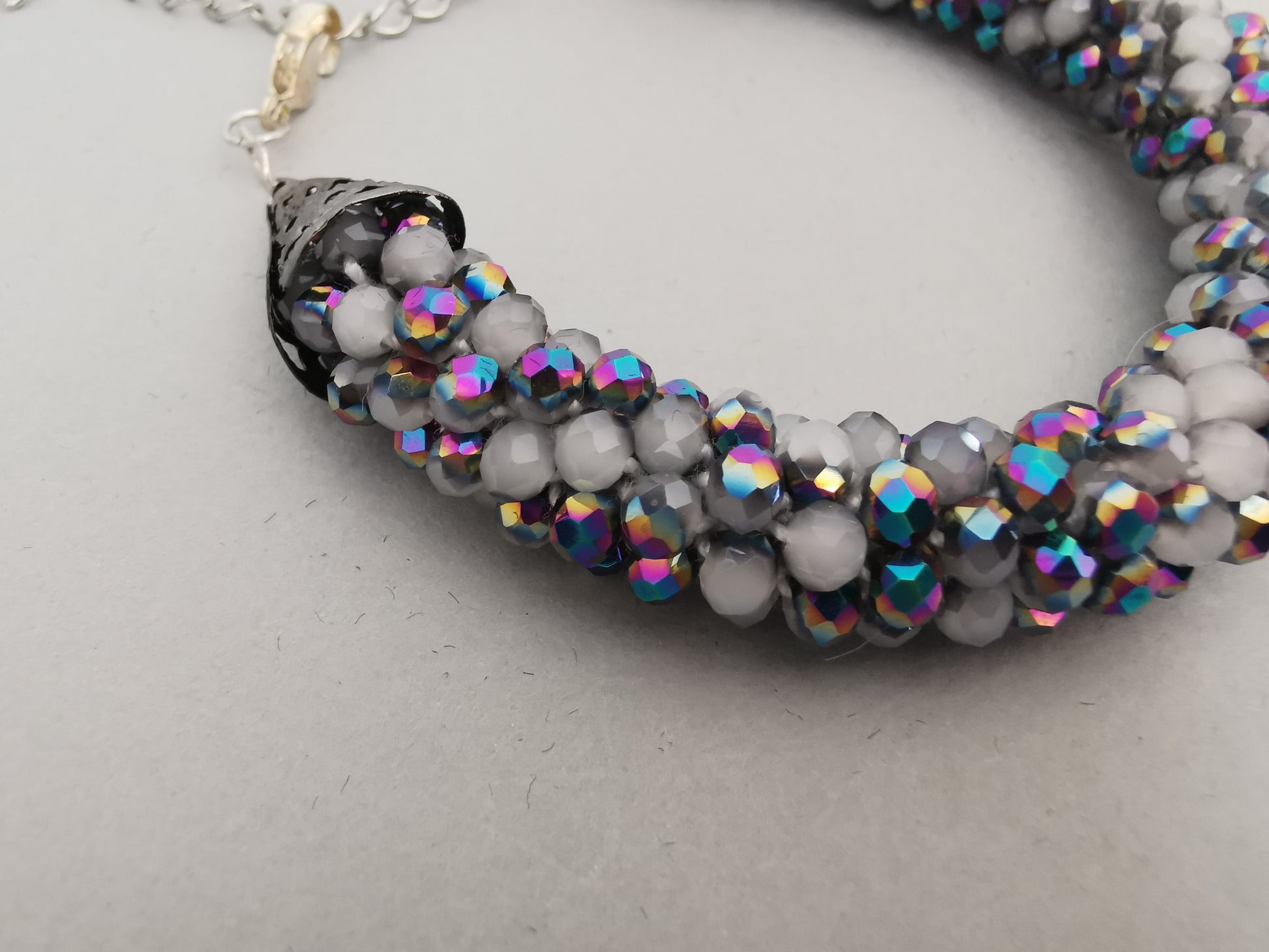 Perlenhäkelkette, schön glitzernde facettierte multicolor / matt weiße Perlen mit altsilbernen Endkappen , Verlängerungskette und Karabiner.