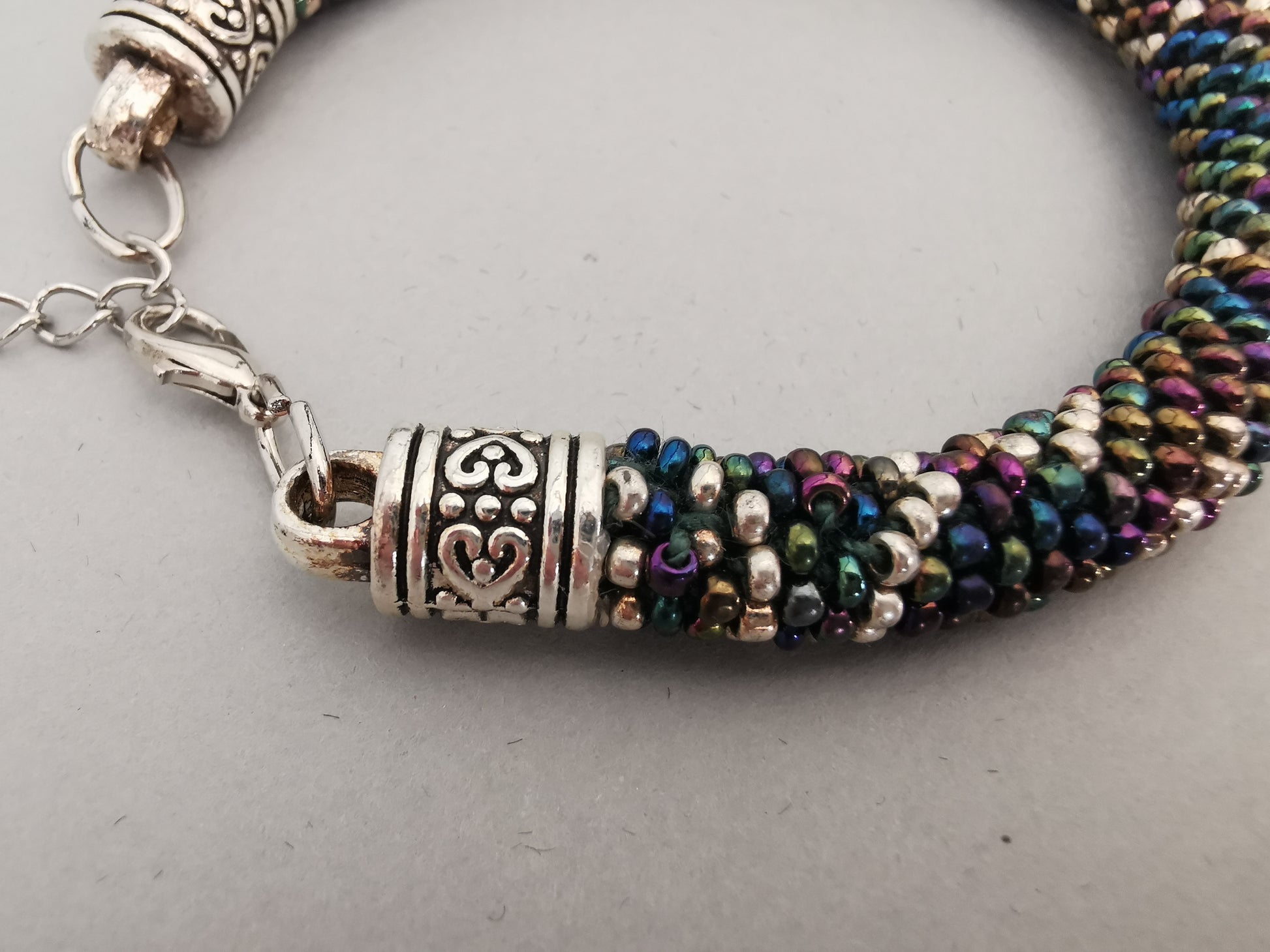 Perlenhäkelarmband - Einzelstück, multicolor / silberfarbene Perlen bunt gemustert, silberfarbene Endkappen mit Verlängerungskette und Karabinerverschluss.