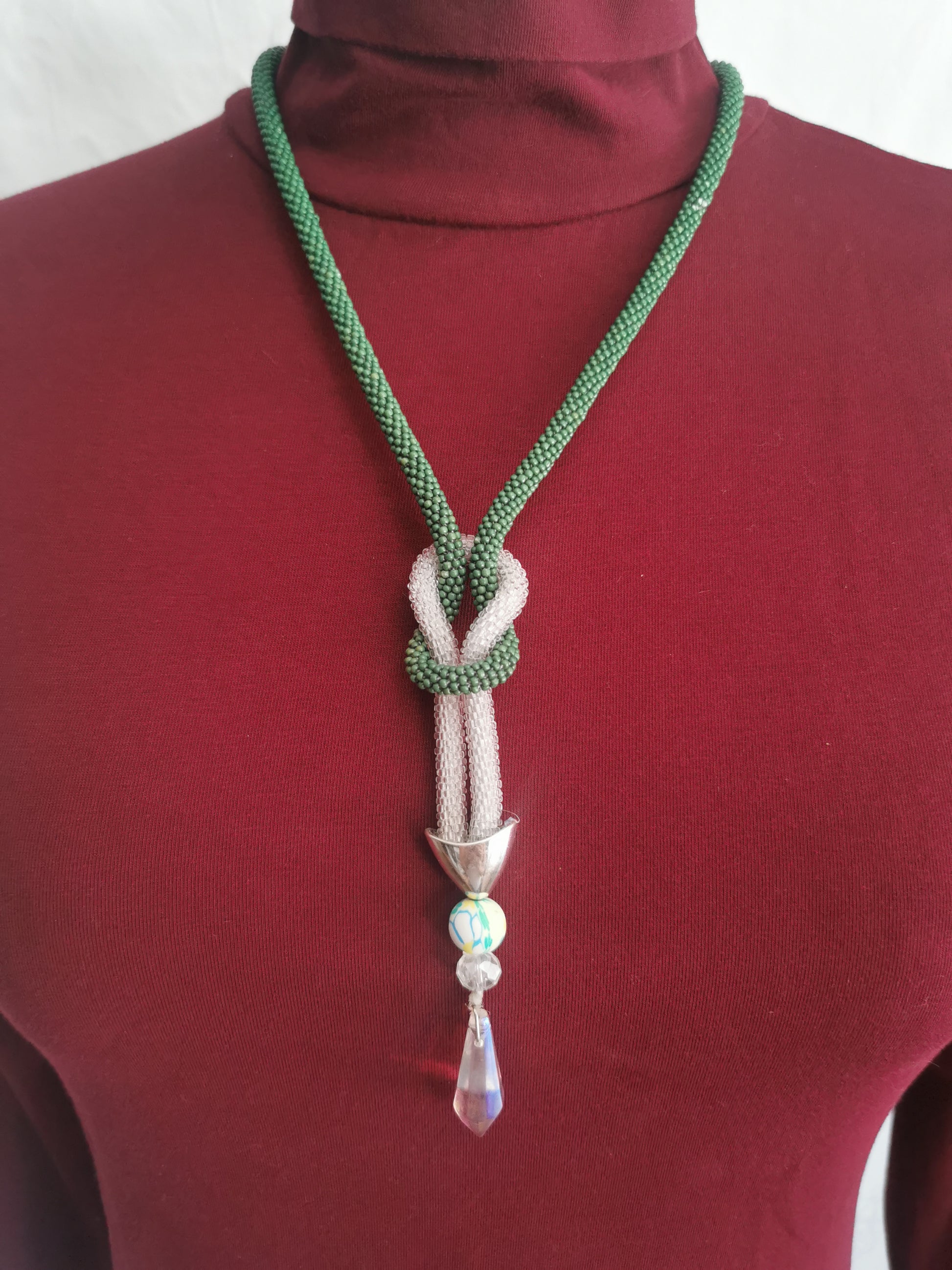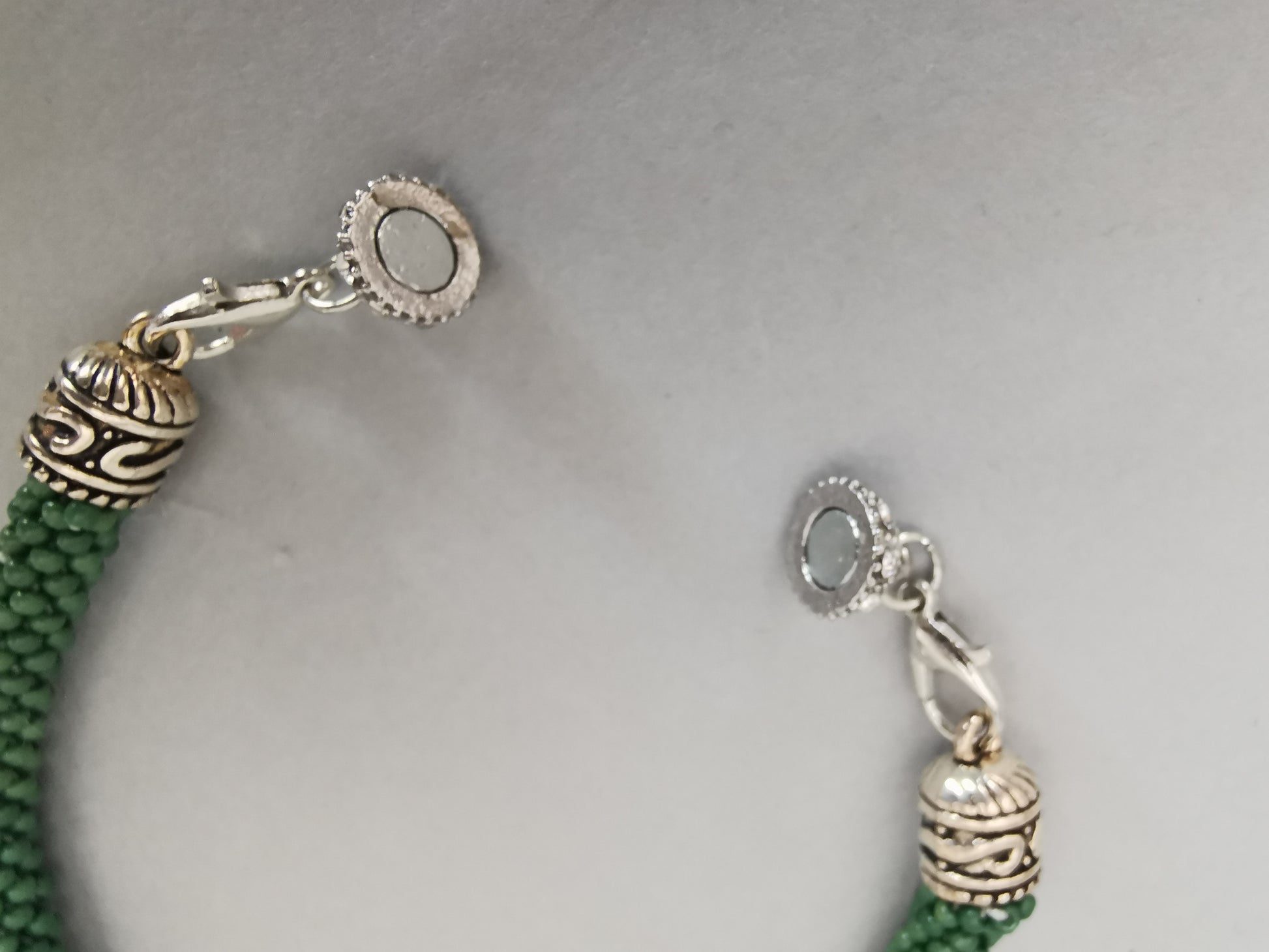 Kombi Kette, die grüne Kette kann auch allein getragen werden, sie hat silberfarbenes Endkappen mit einem Magnetkugel Verschluss mit Strassbesatz, das transparente Endstück endet in einer schönen silberfarbenen Endkappe mit einer bunten Silikon und einer transparenten facettierten Perle, am Schluss ein großer facettierter Strassstein.