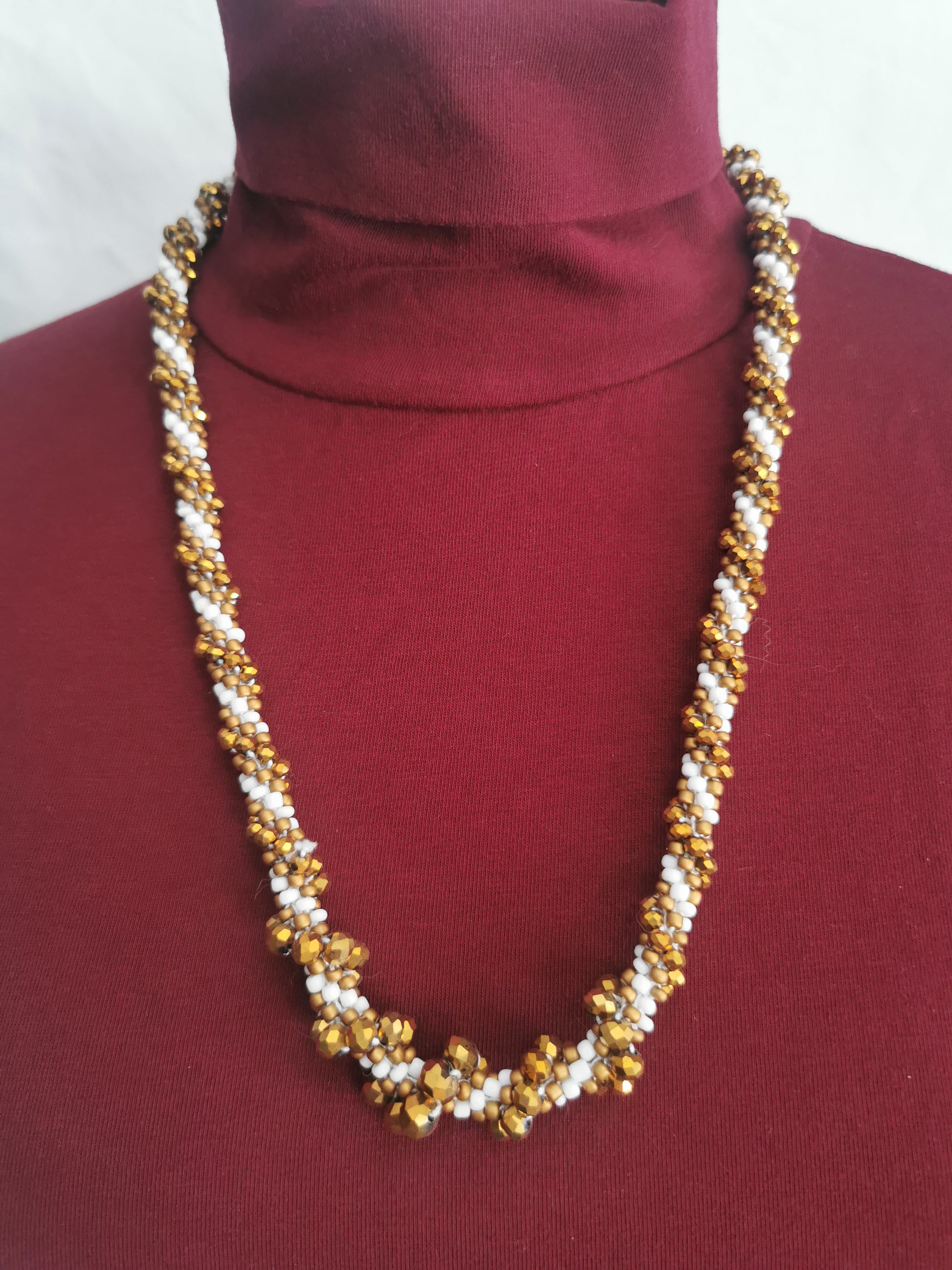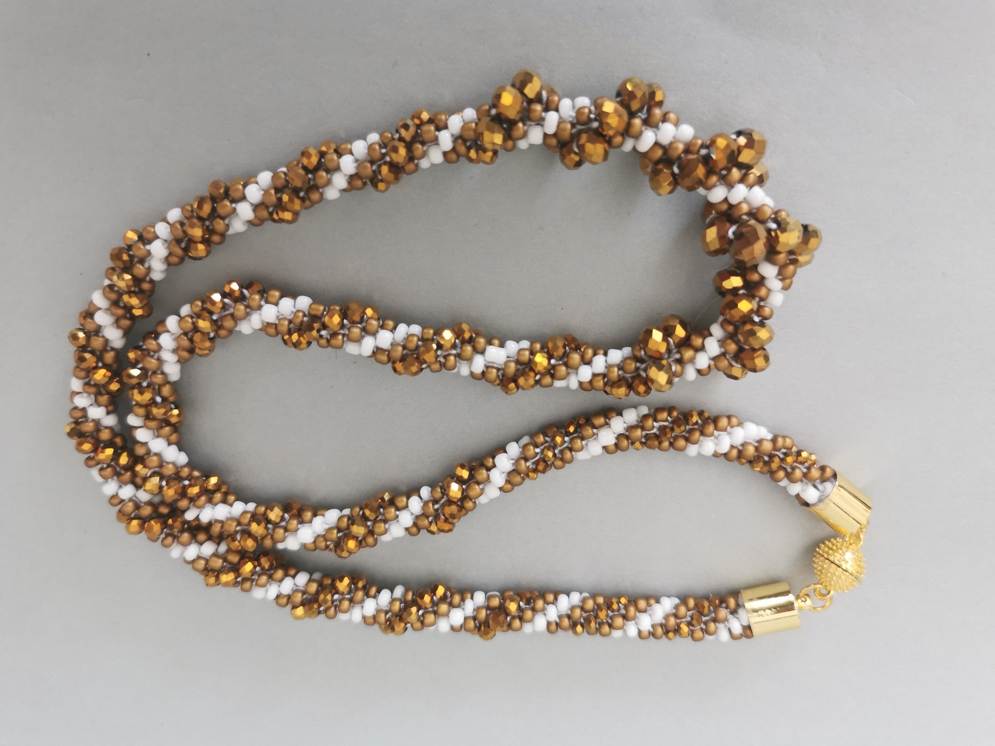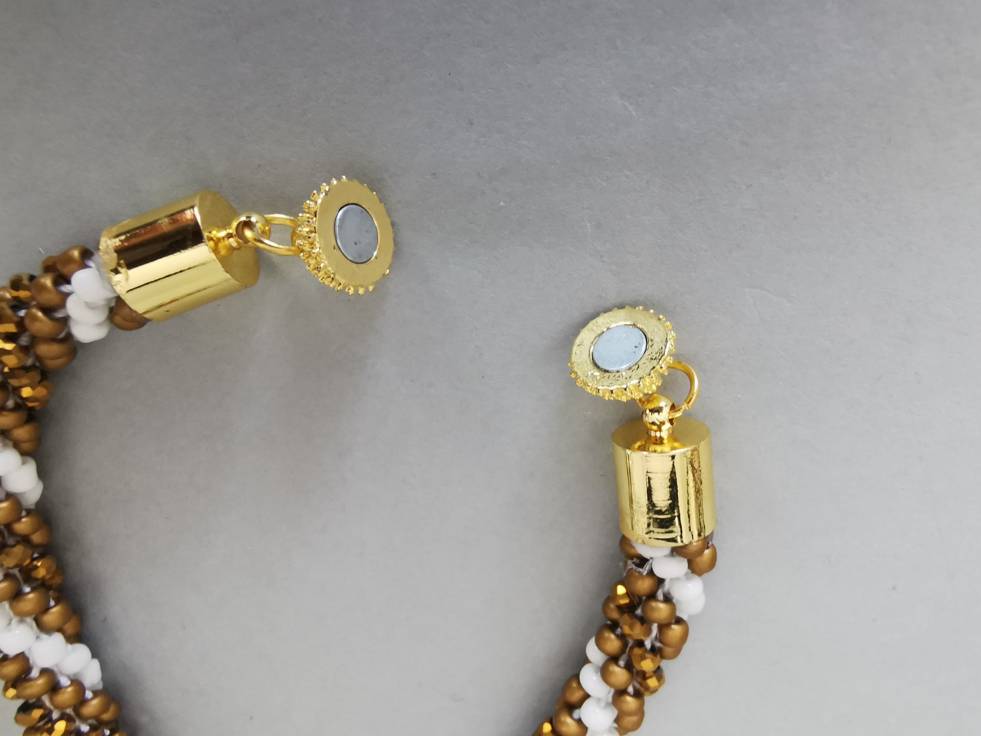 weiß matt / goldfarben matt /facettierte goldfarbene Perlen die im Verlauf der Kette immer größer werden, goldfarbene Endkappen mit Kugelmagnet Verschluss.