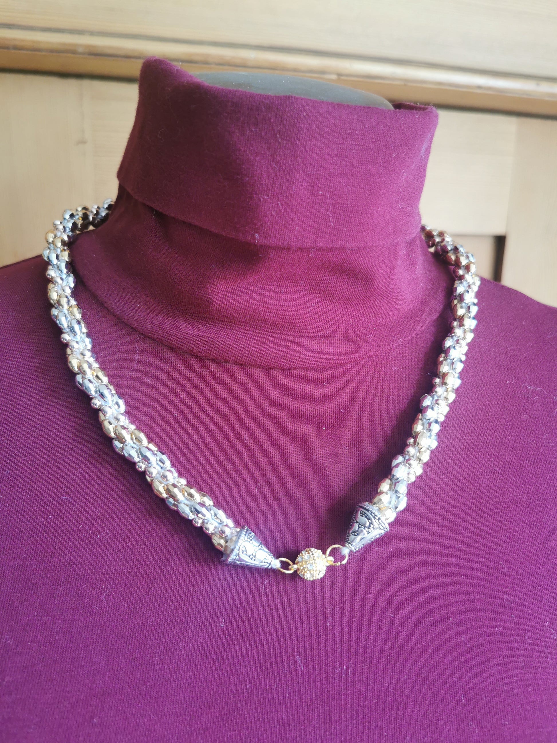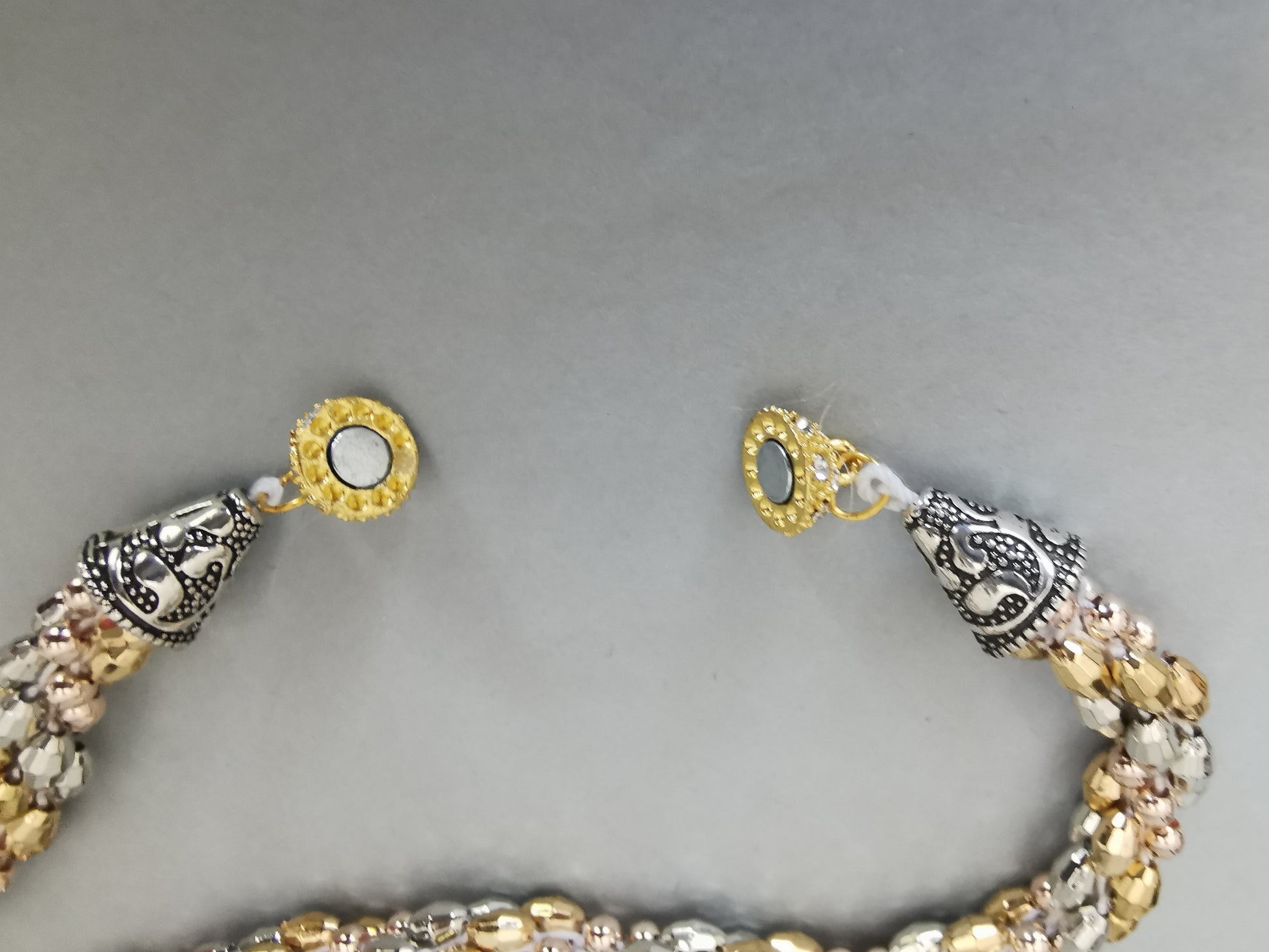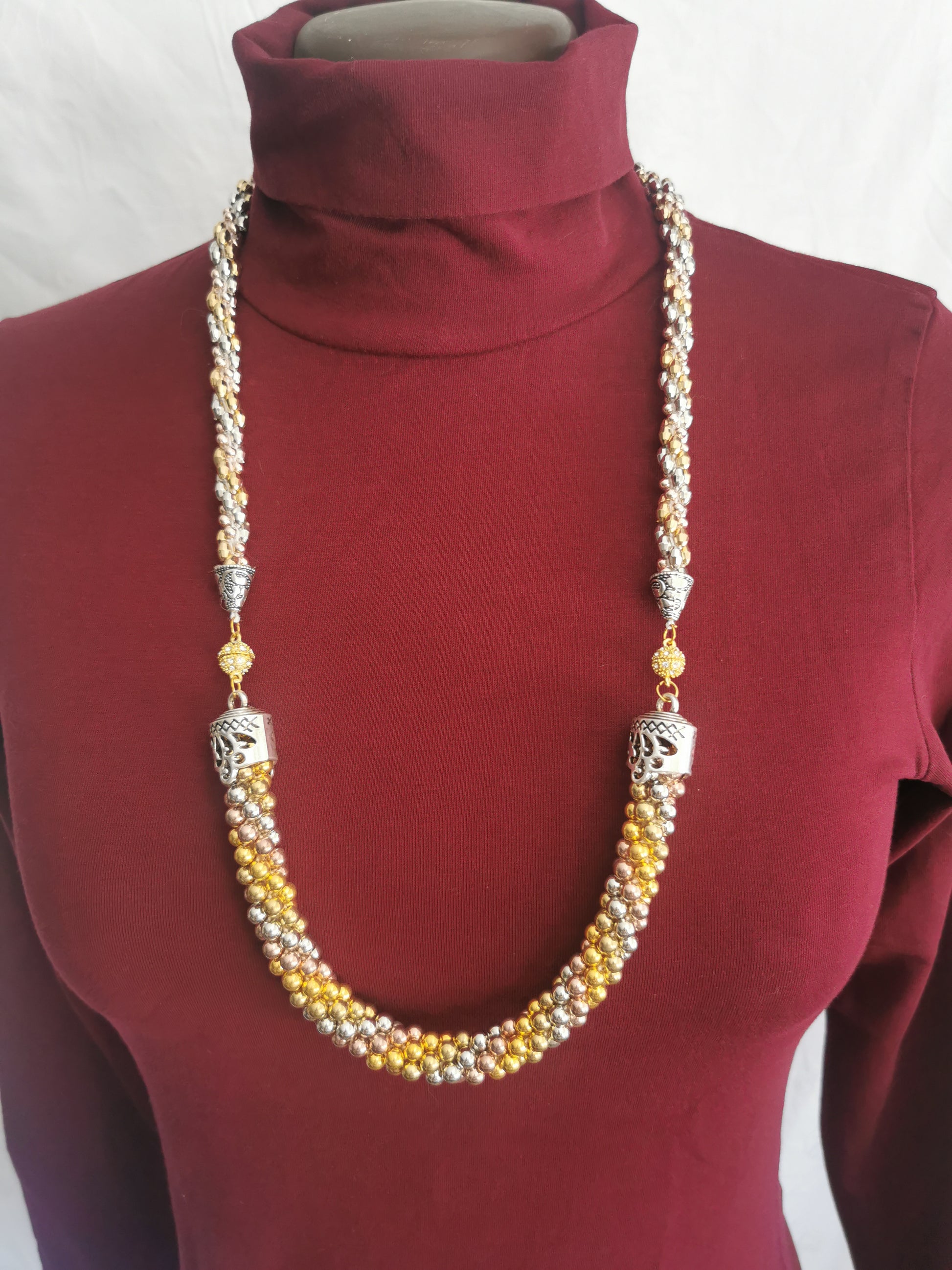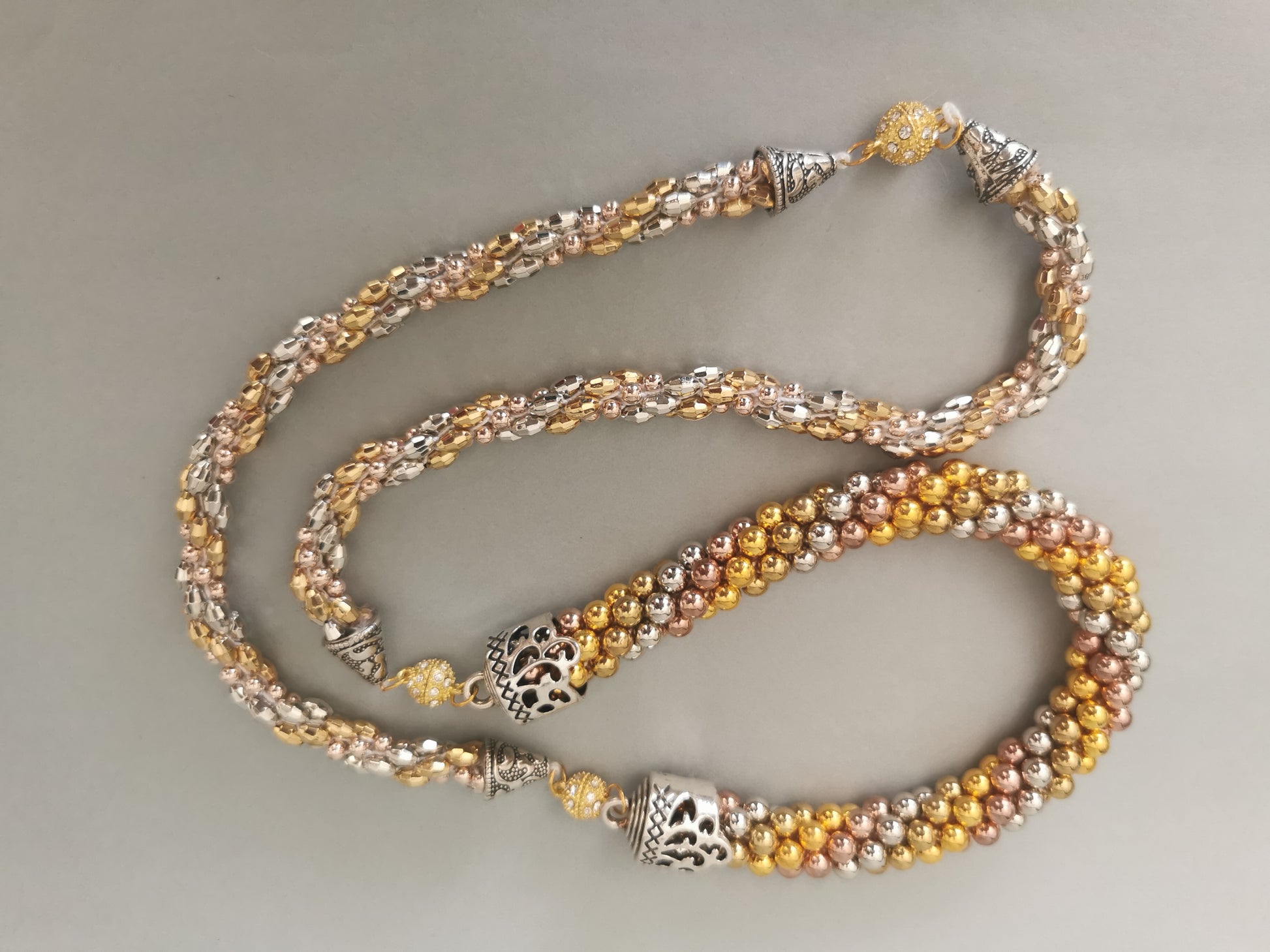 separat getragen werden. Mittelstück aus silber-, rosegold- und goldfarbenen runden Perlen mit zwei silberfarbenen Endkappen, die beiden Endstücke gold- und silberfarben.