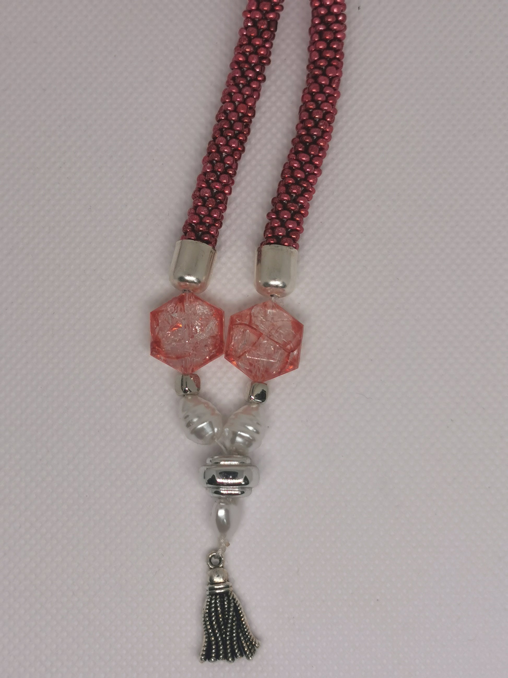 am roten Endstück sind zwei transparent / rot marmorierte große Perlen mit zwei ovalen weißen Perlen einer großen silbrigen Perle, eine Herzperle zum Abschluss eine eine Metallquaste