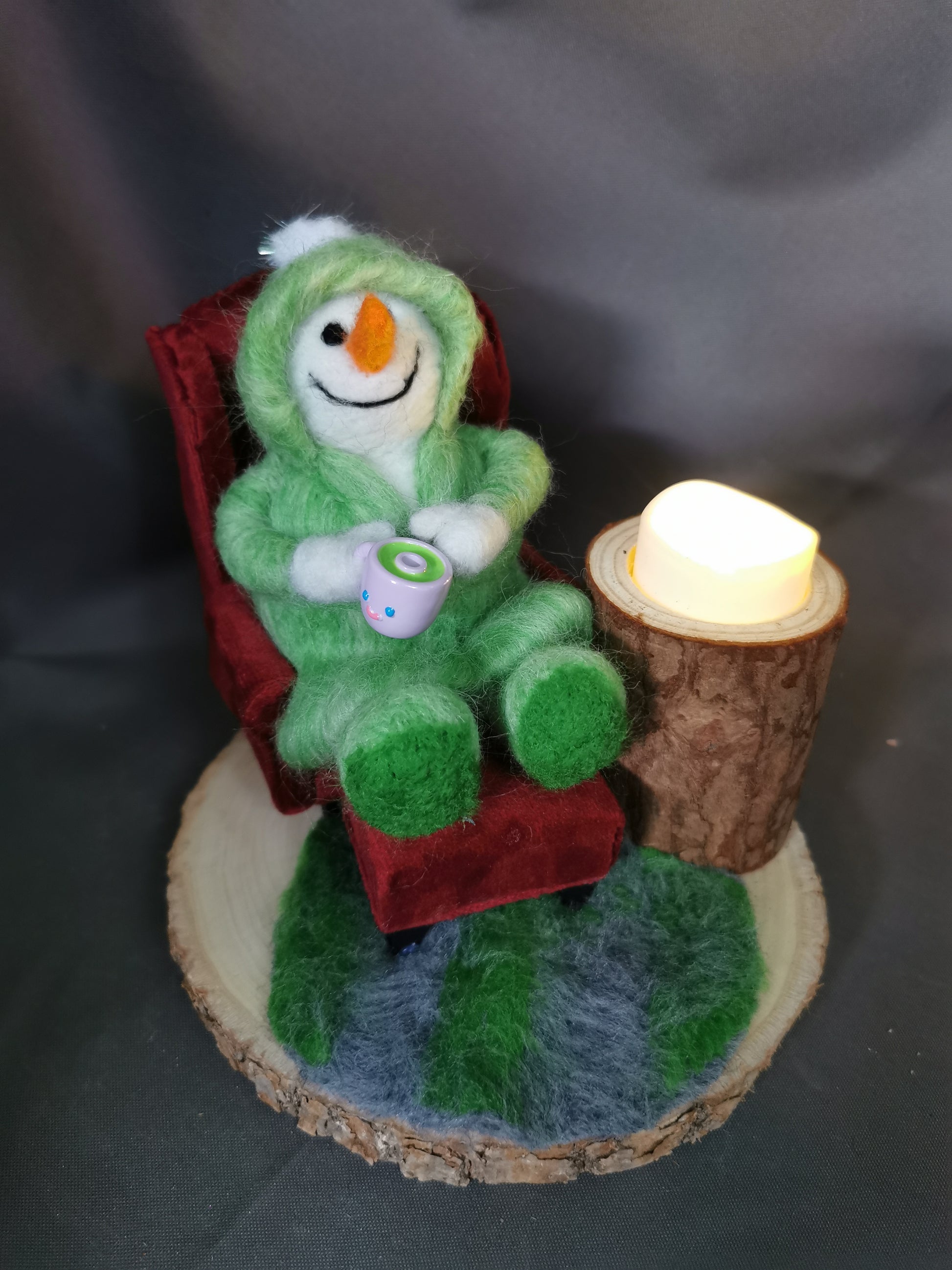 Filz Schneemann im Bademantel auf einem schönen Sessel mit Hocker und Licht, auf großer Holzscheibe, handgefertigt Einzelstück