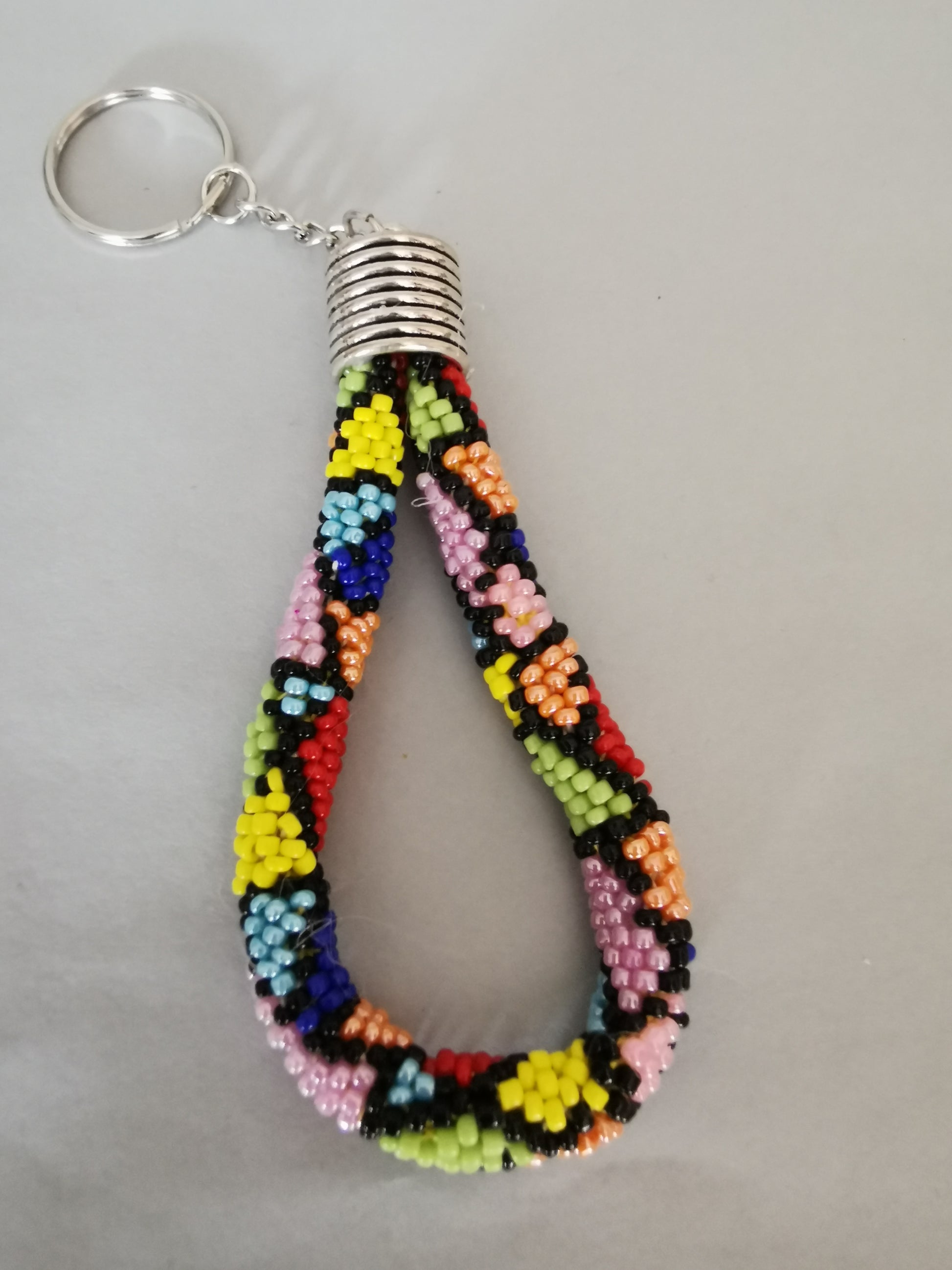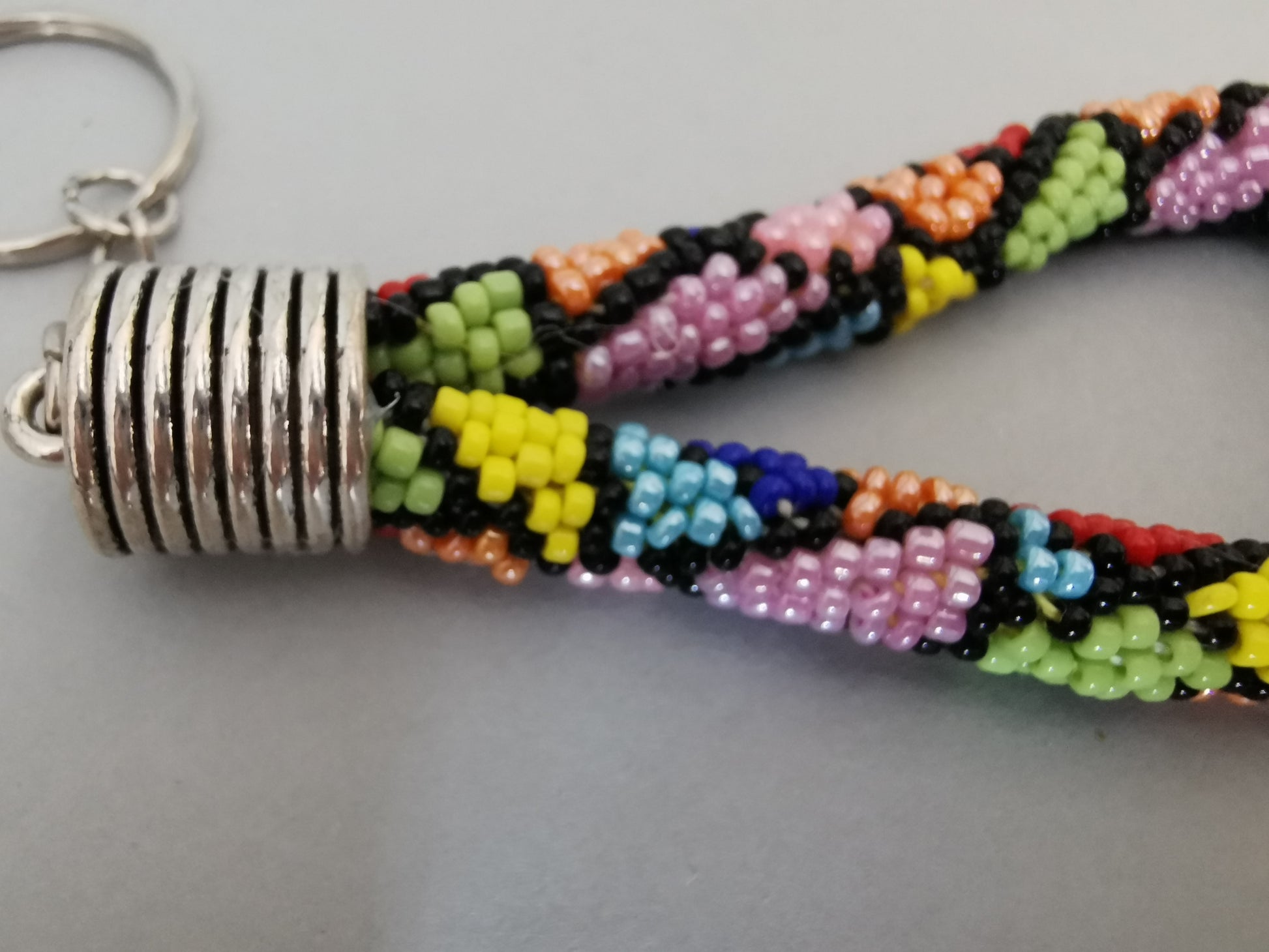 Schlüsselanhänger aus gehäkelten Perlen, verbunden mit einer silberfarbenen Endkappe, Kette und Schlüsselring