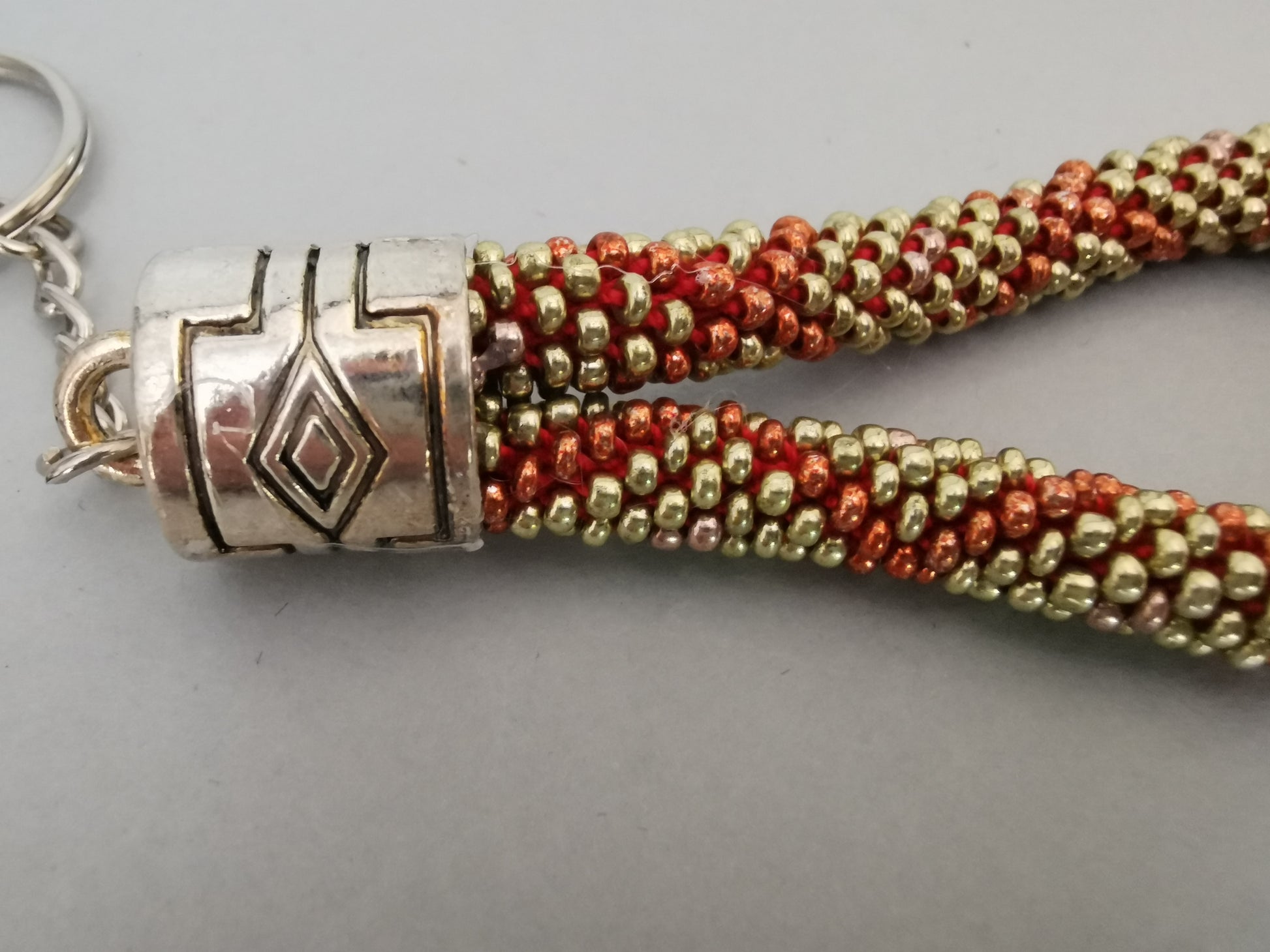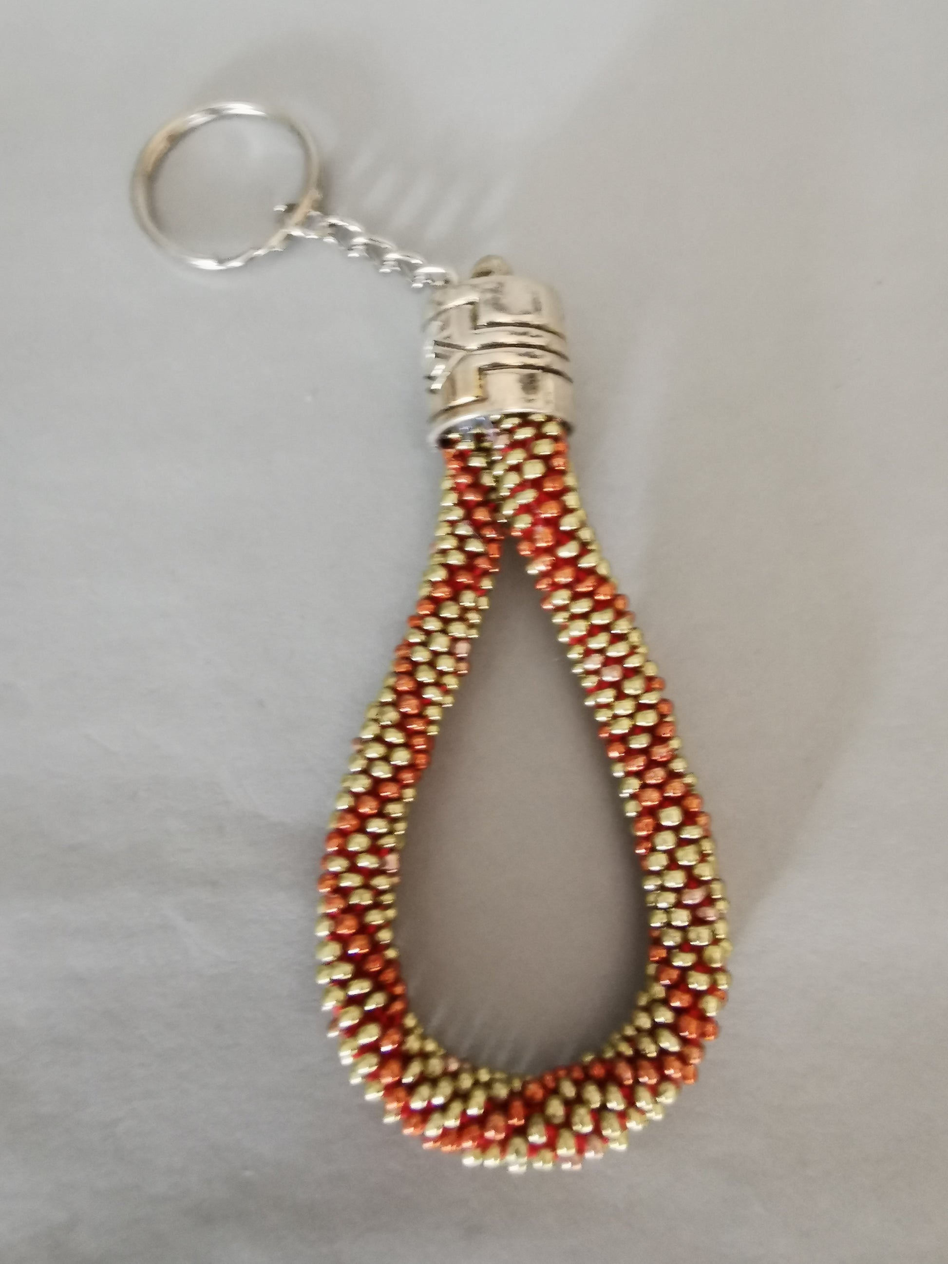 Schlüsselanhänger aus gehäkelten Perlen, verbunden mit einer silberfarbenen Endkappe, Kette und Schlüsselring