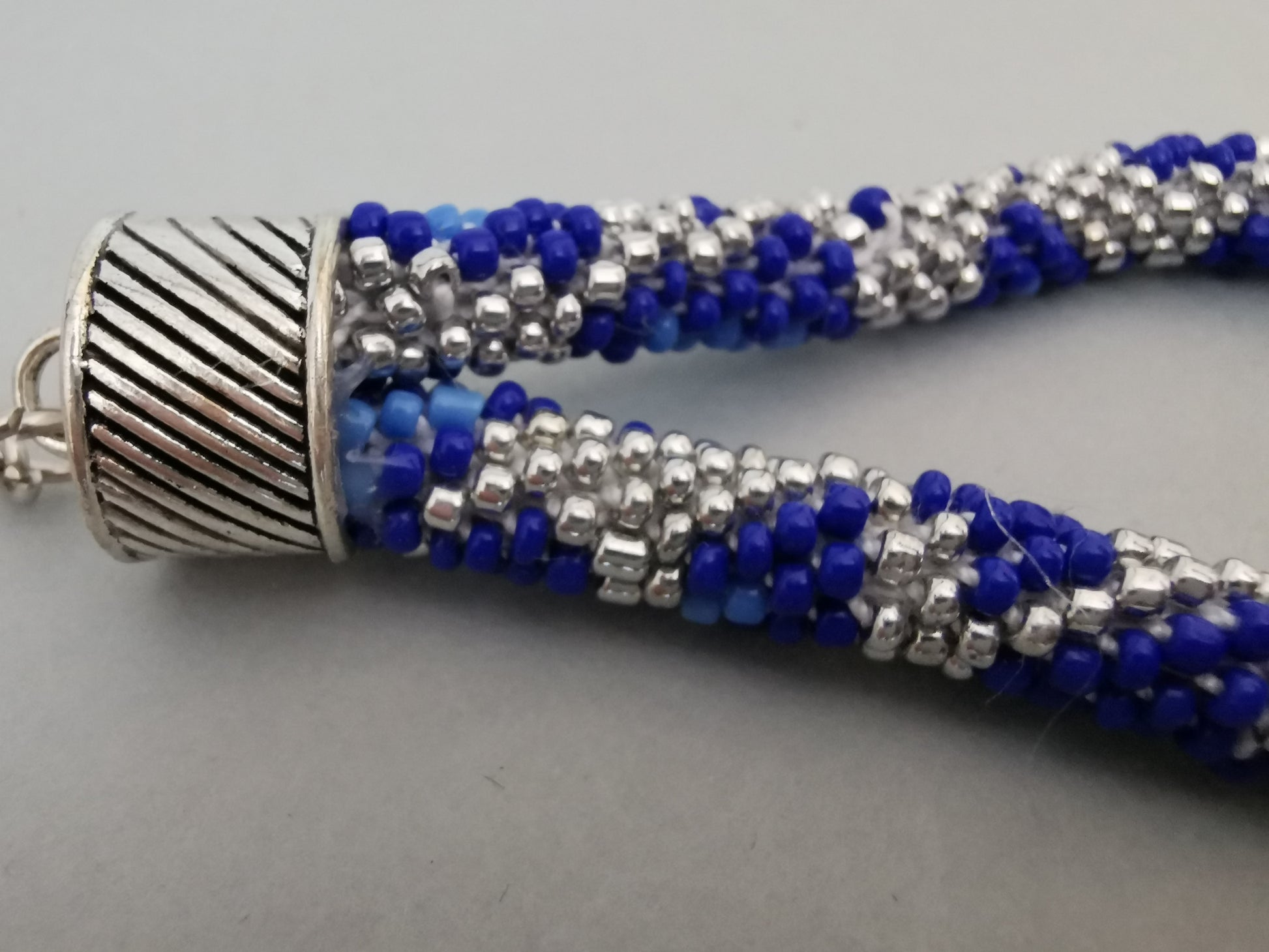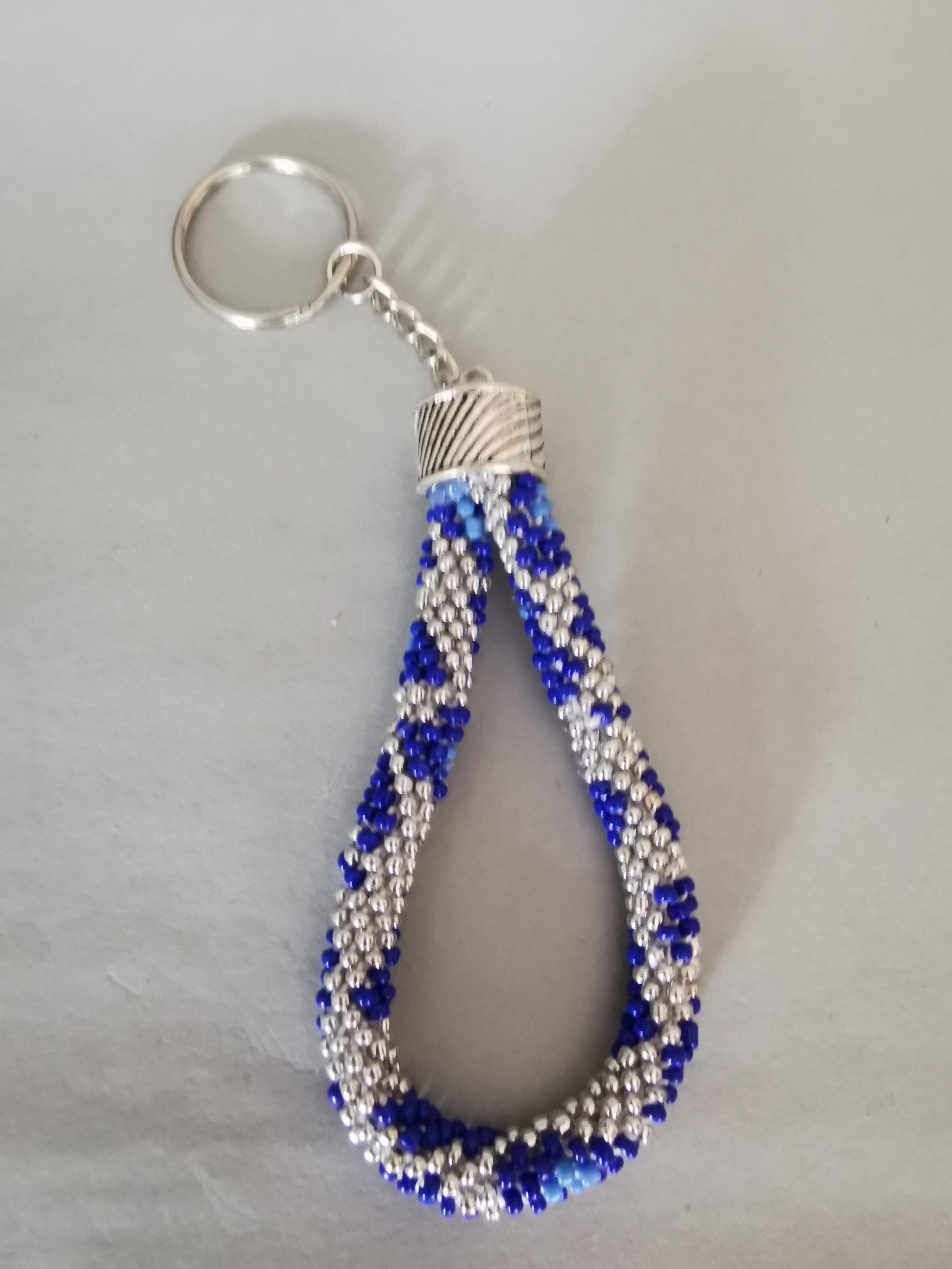 Schlüsselanhänger aus gehäkelten Perlen, verbunden mit einer großen silberfarbenen Endkappe, Kette und Schlüsselring