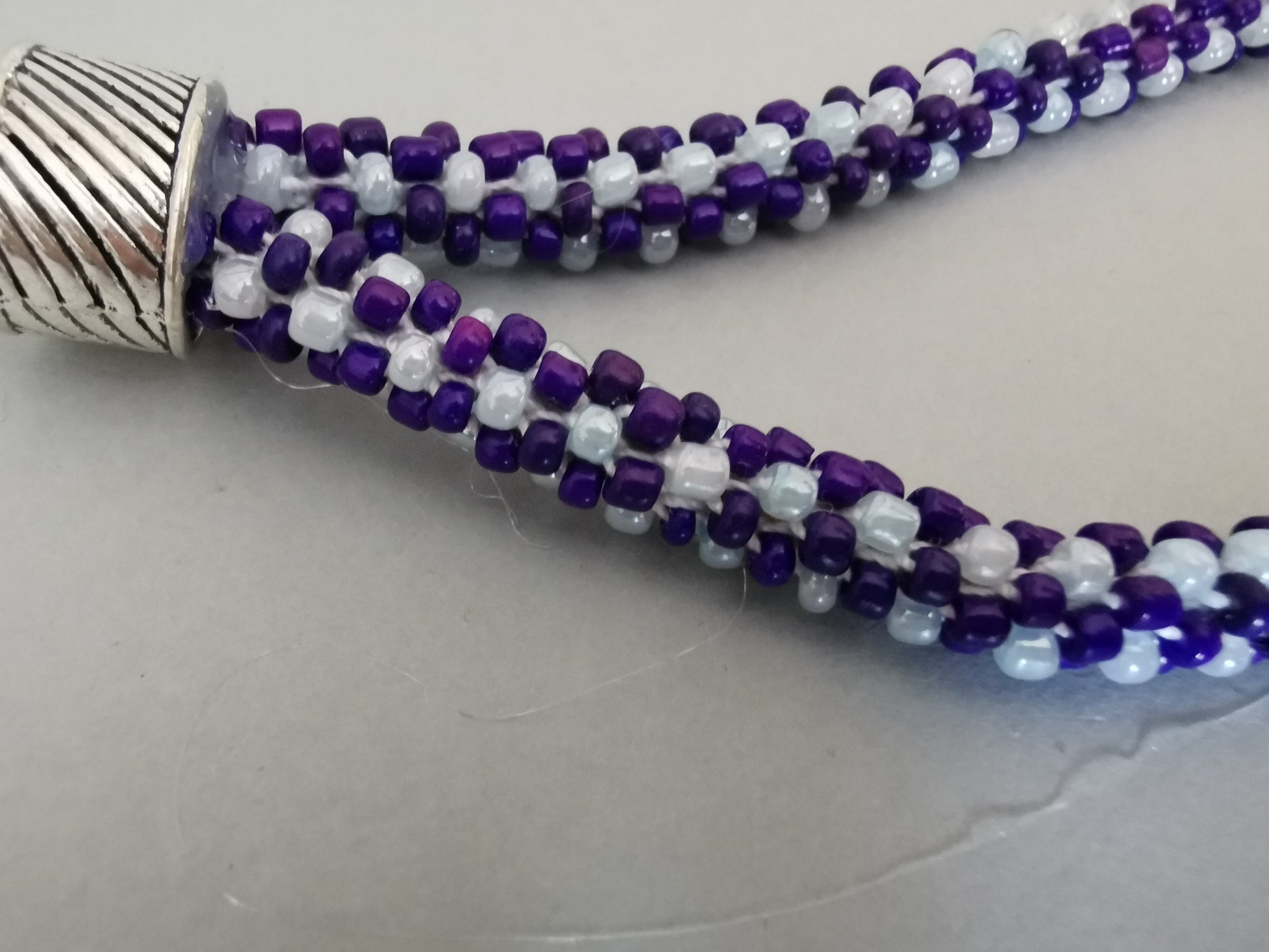 Perlen: blau/lila, hellblau im Muster gehäkelt