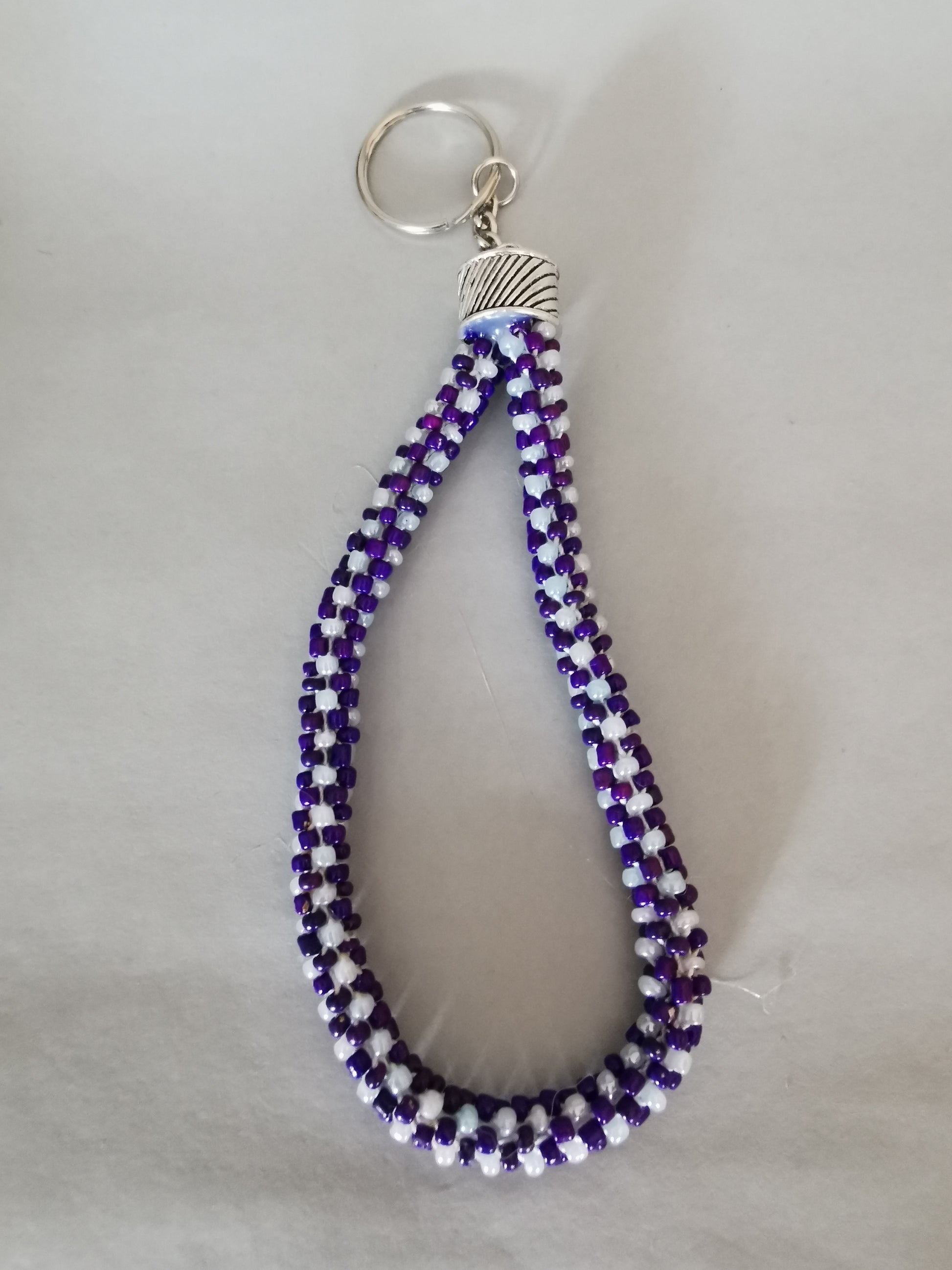 Schlüsselanhänger aus gehäkelten Perlen mit großer silberfarbenen Endkappe, Kette und Schlüsselring