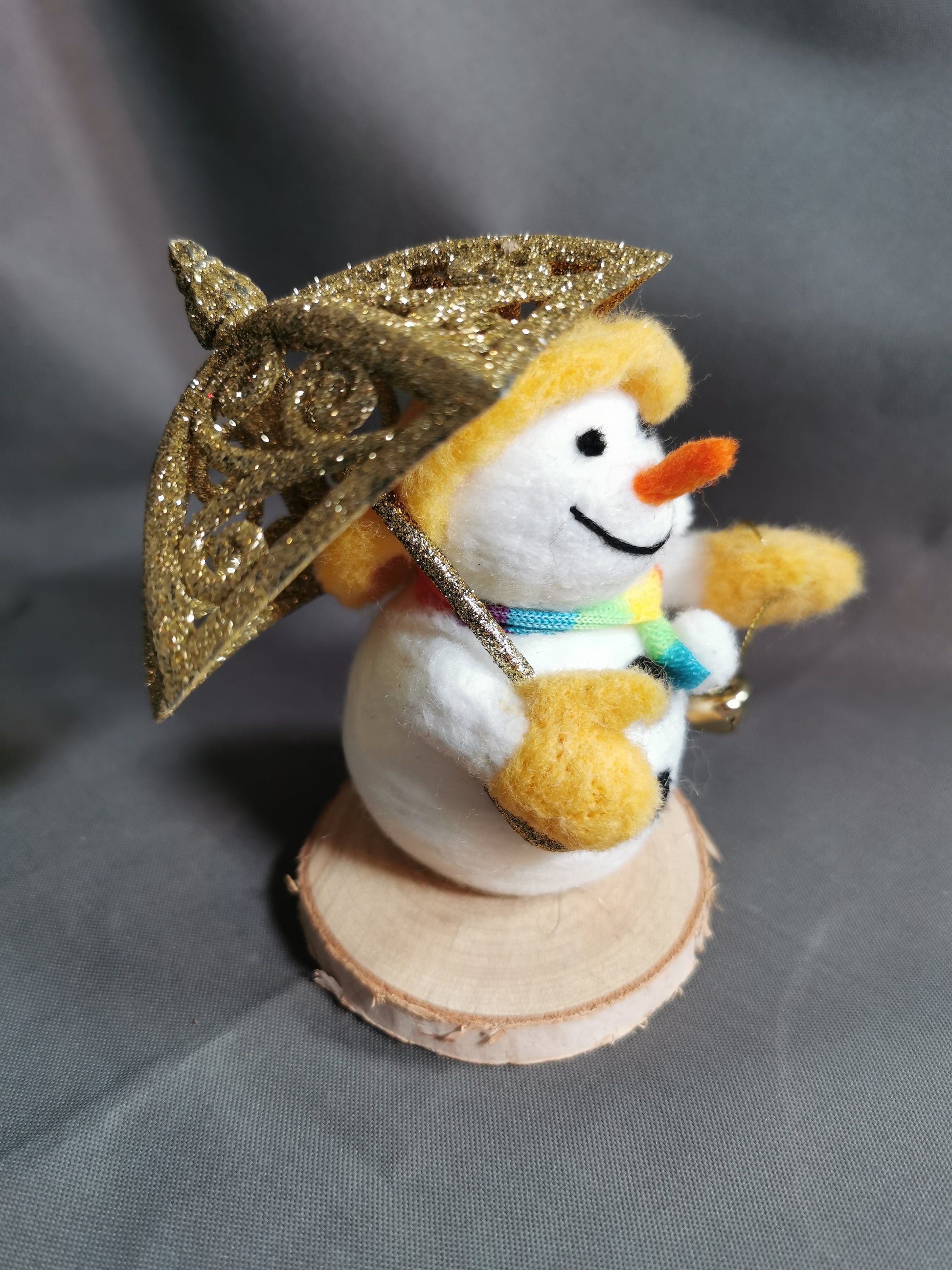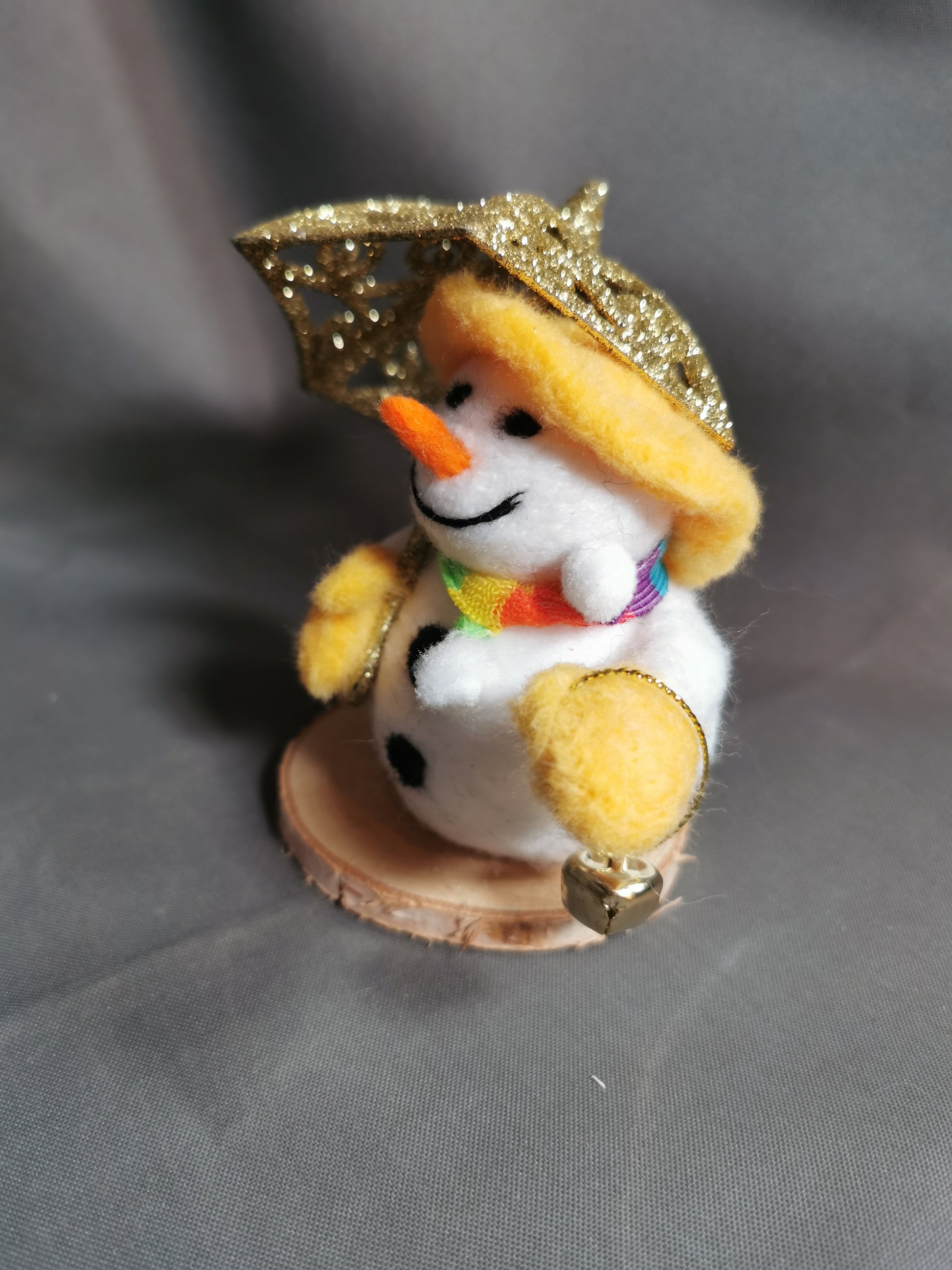 Filz Schneemann mit glitzerndem Schirm und Glöckchen, auf einer Holzscheibe, handgefertigt Einzelstück
