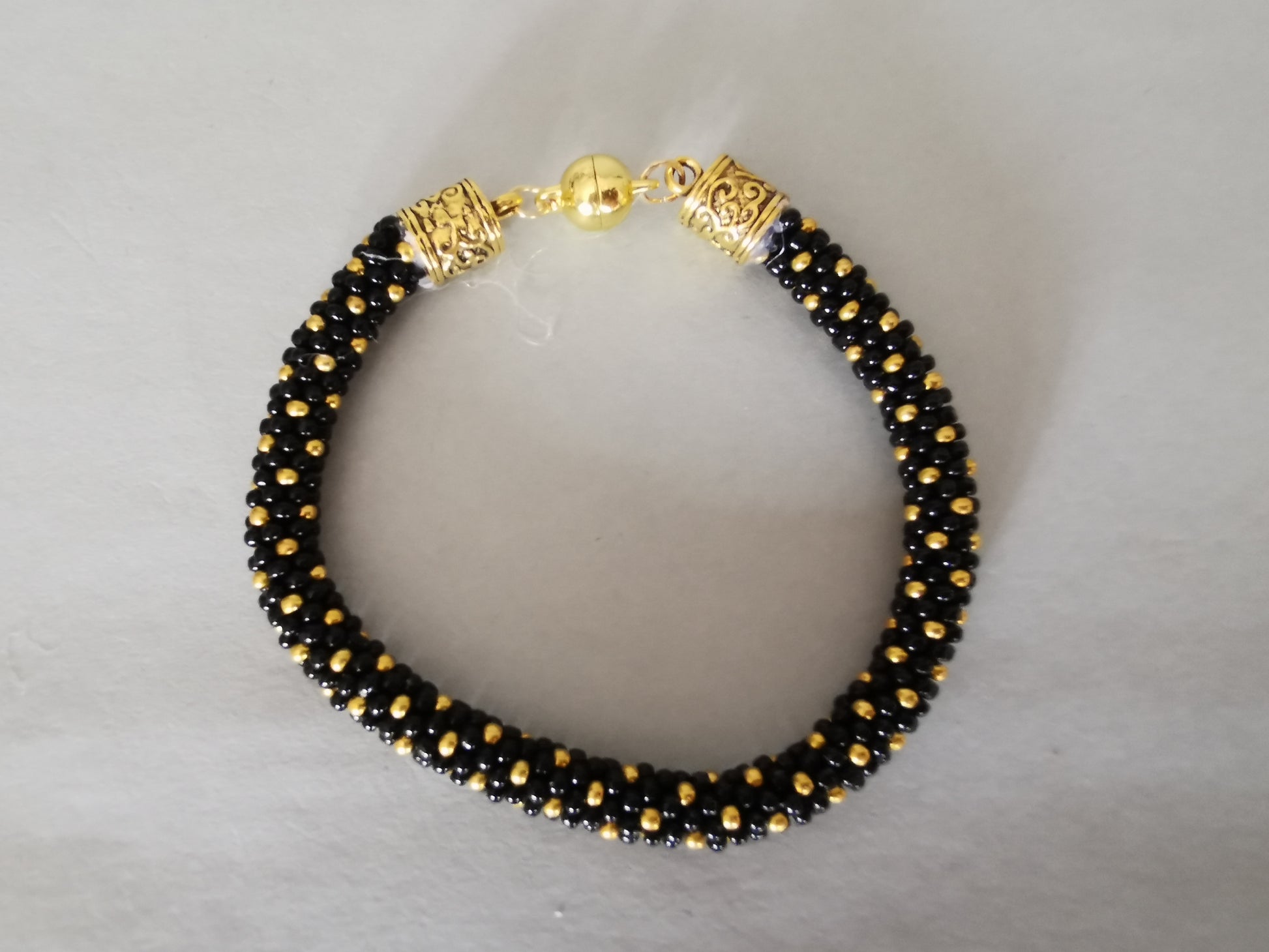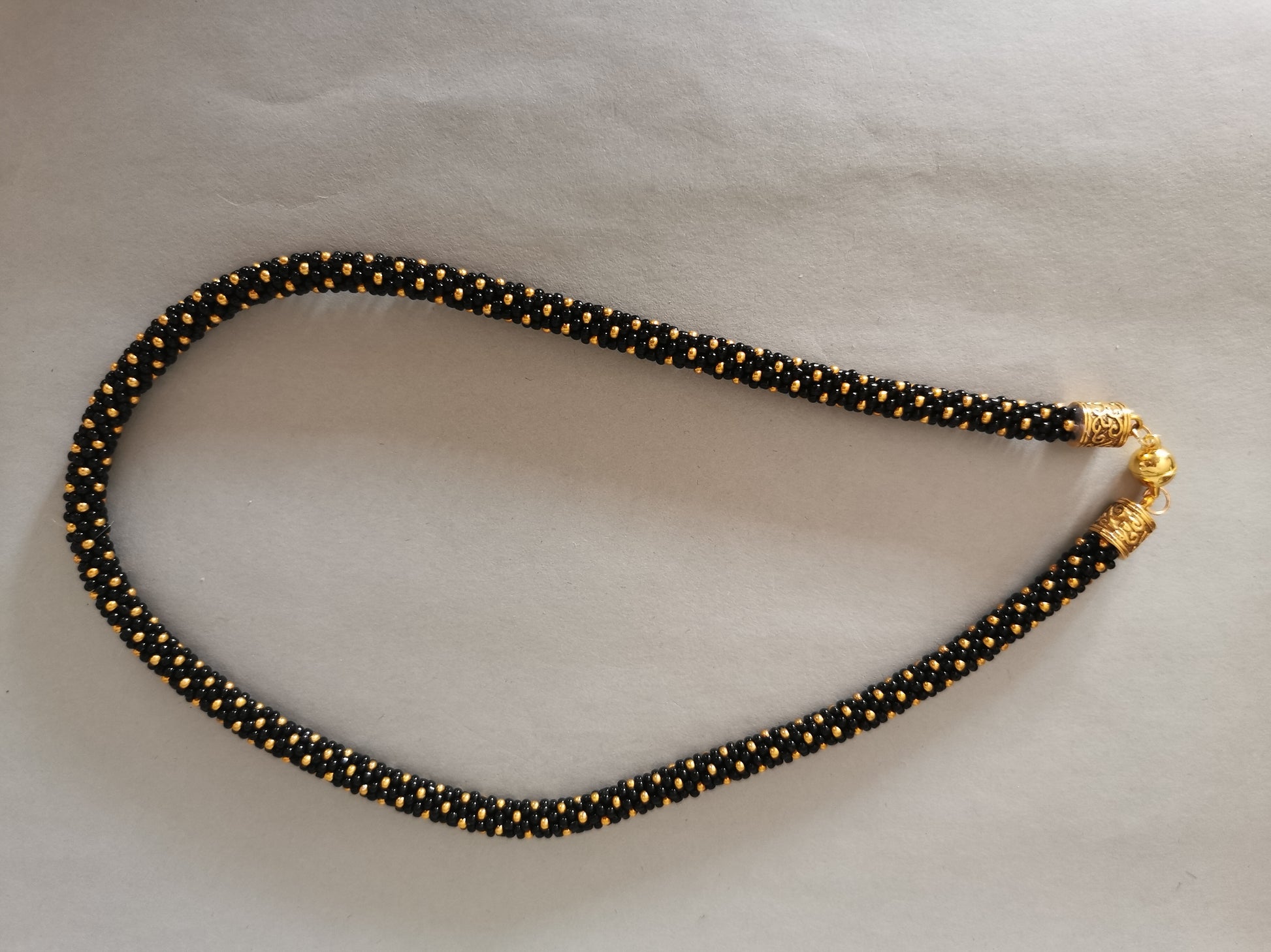 schwarz / goldfarbene Perlen im Muster gehäkelt,