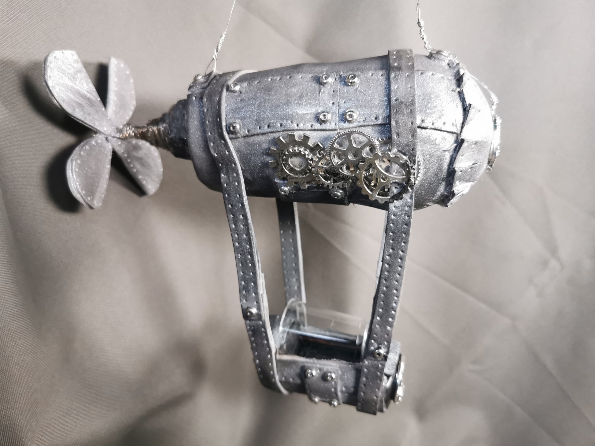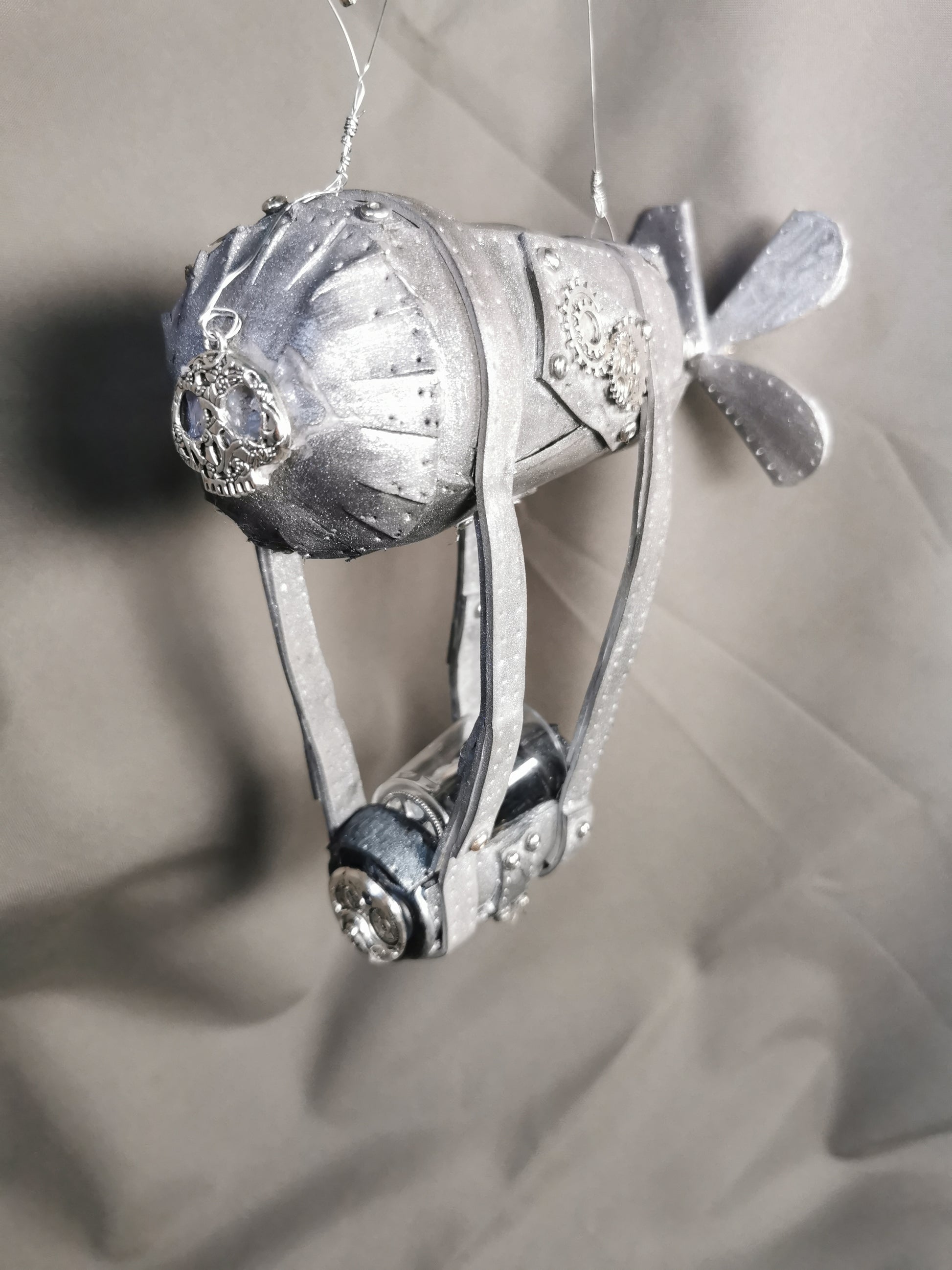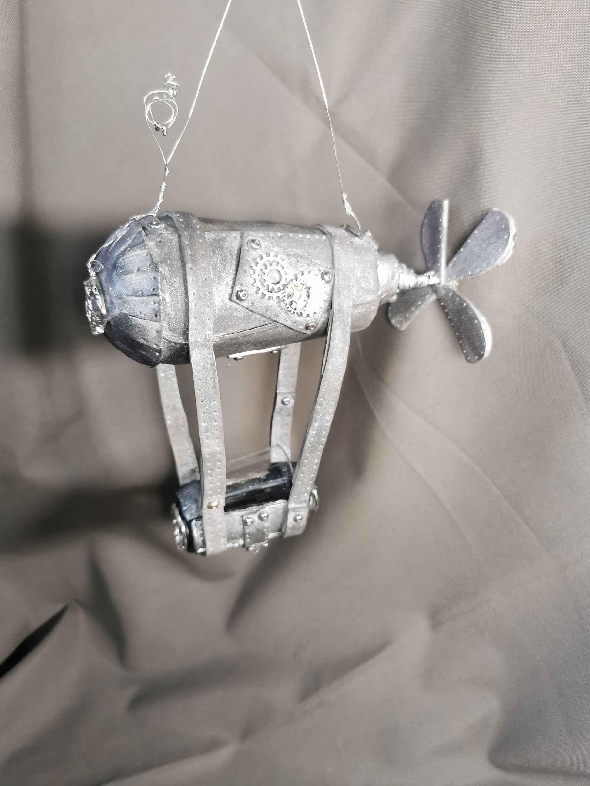 Zeppelin Steampunk, Kern des Zeppelin ist eine alte Glühbirne, mit Moosgummi belegt und mit Steampunk Accessoires verziert.