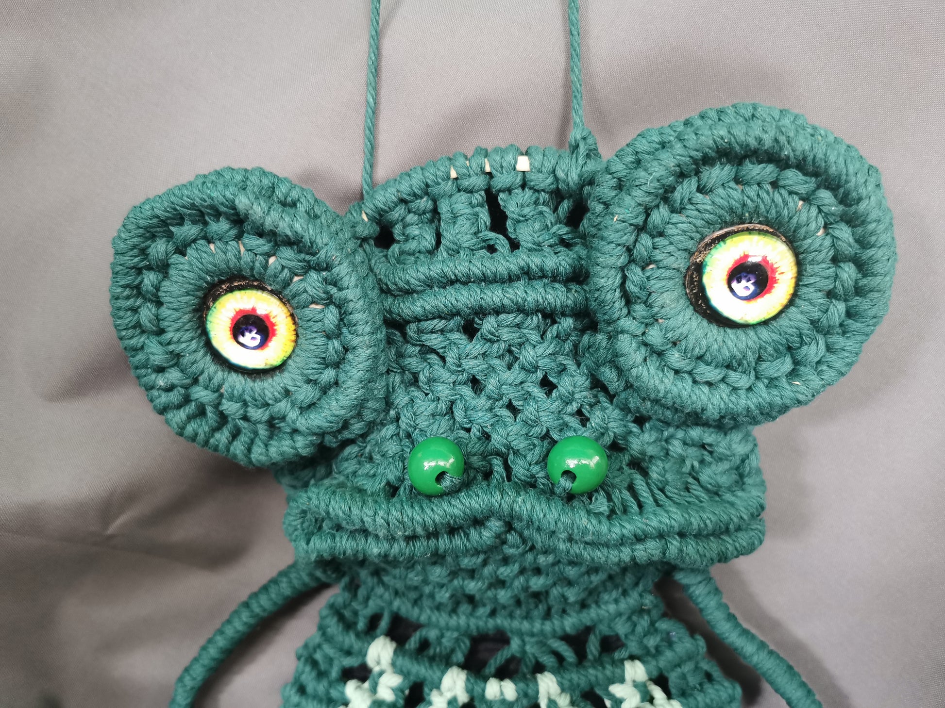 Makramee-Frosch, Makramee-Garn auf Bambusring, mit Glasaugen. Holzperlen als Nase, Beine können beliebig verbogen werden.