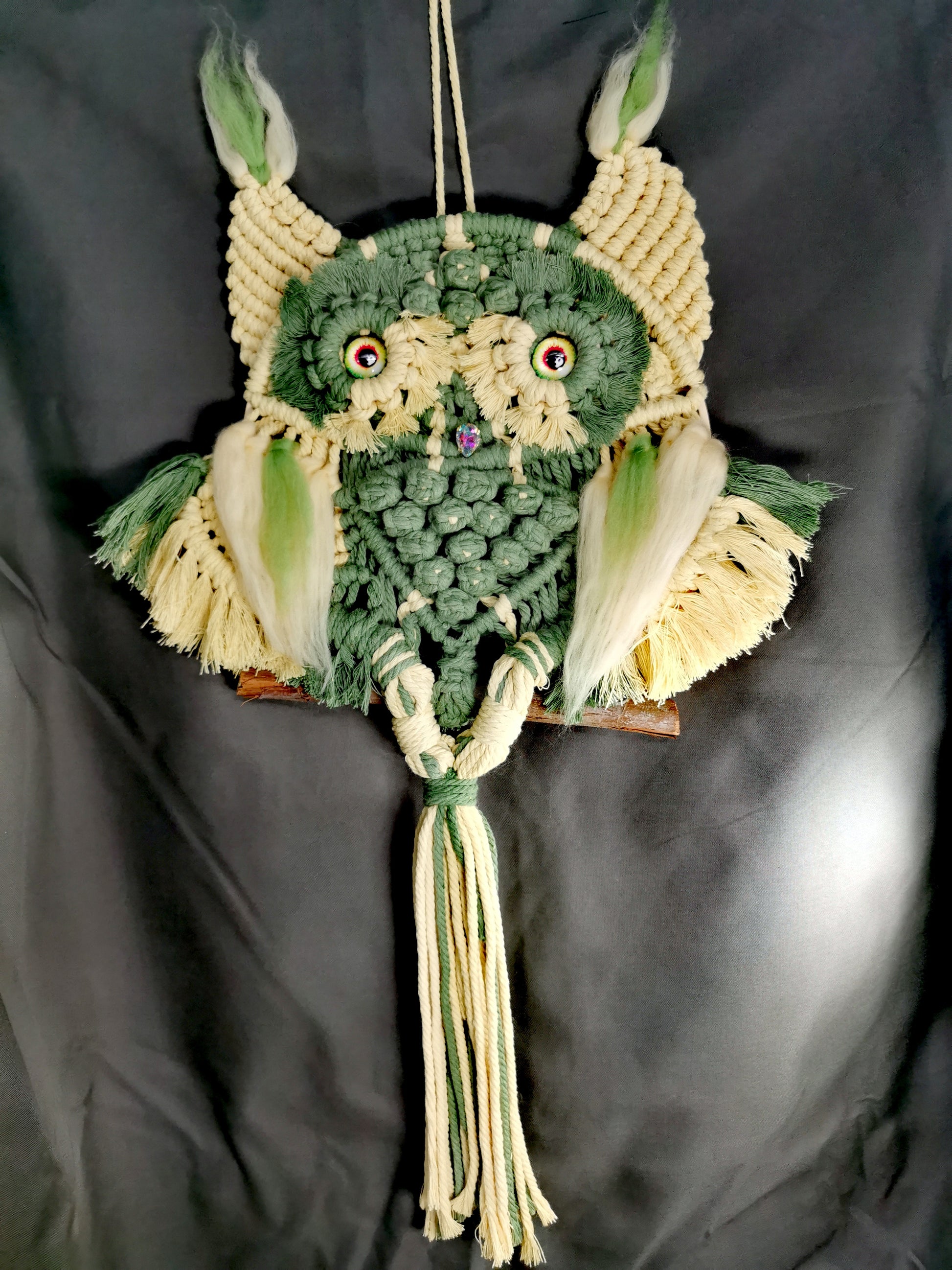 Makramee-Eule, gelb/grünes Makramee-Garn auf Bambusring, mit Strassschnabel und Glasaugen auf einem Holzast, mit Filzapplikationen.