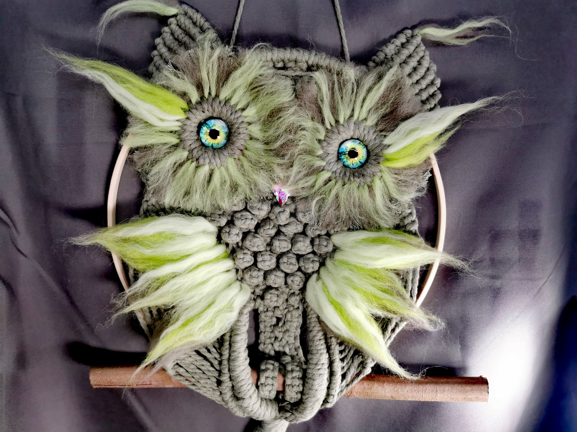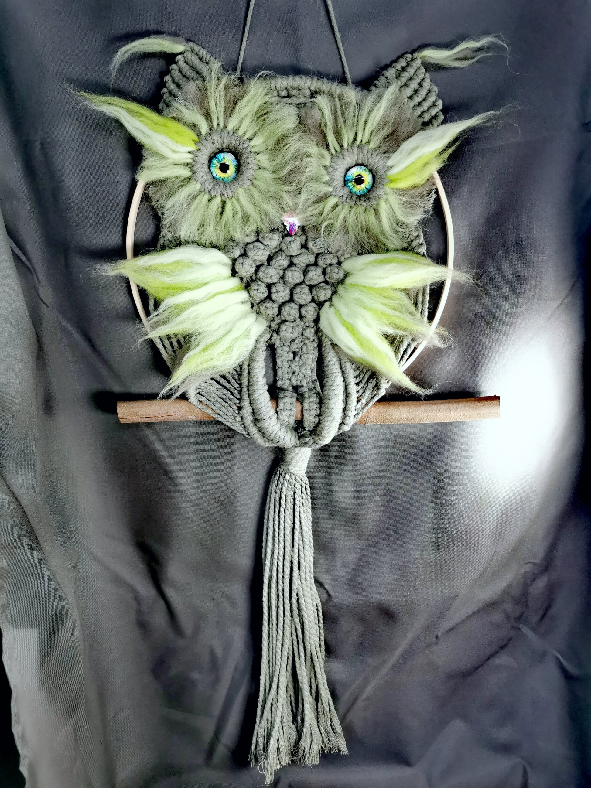 Makramee-Eule, grünes Makramee-Garn auf Bambusring, mit einem Holzschnabel, Glasaugen mit Filzapplikationen auf einem Holzast