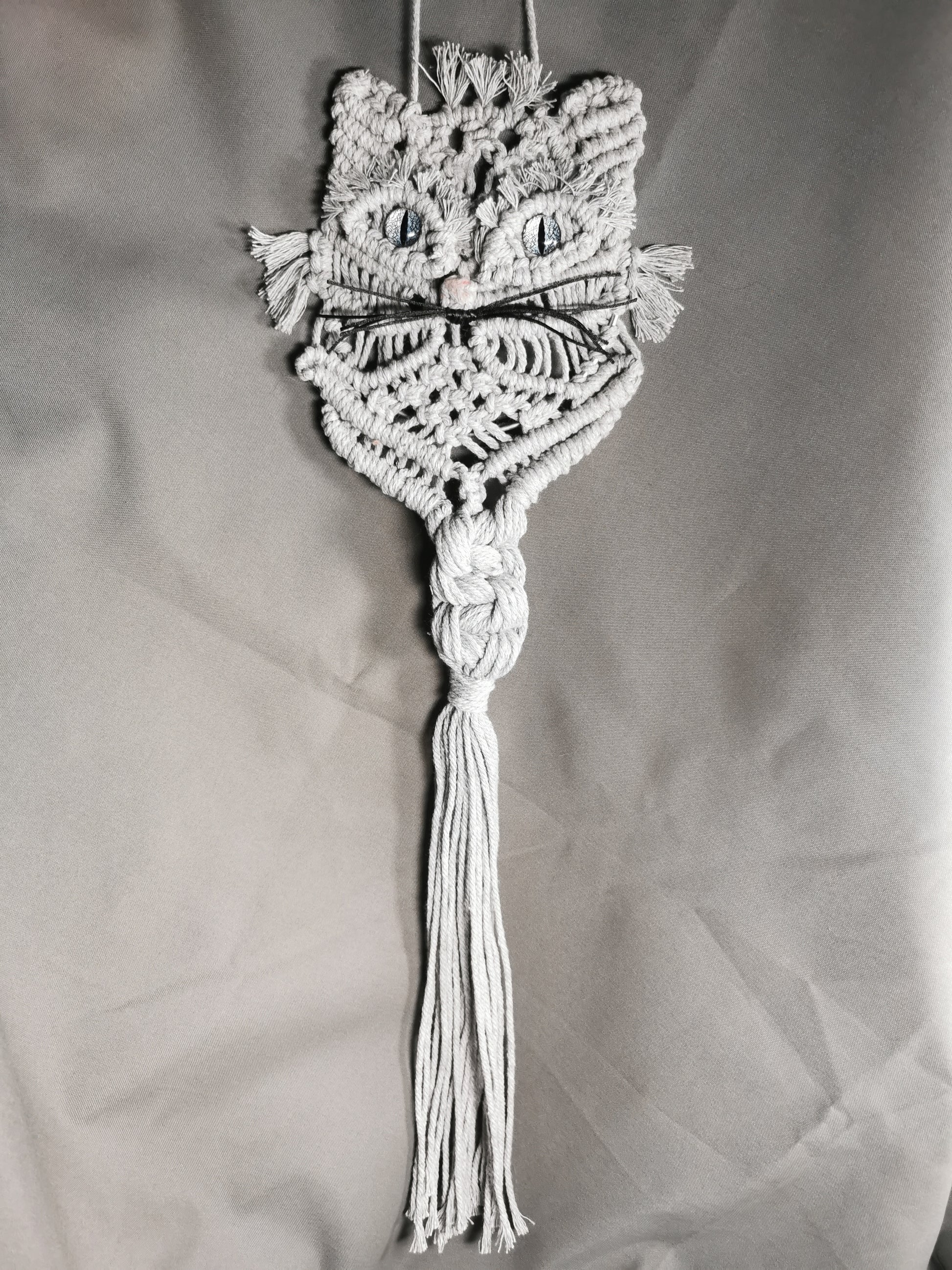 kleine Makramee-Katze, graues Makramee-Garn auf Metallring, mit Glasaugen und