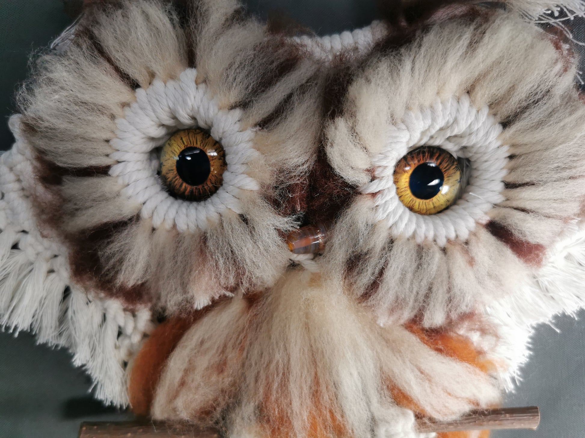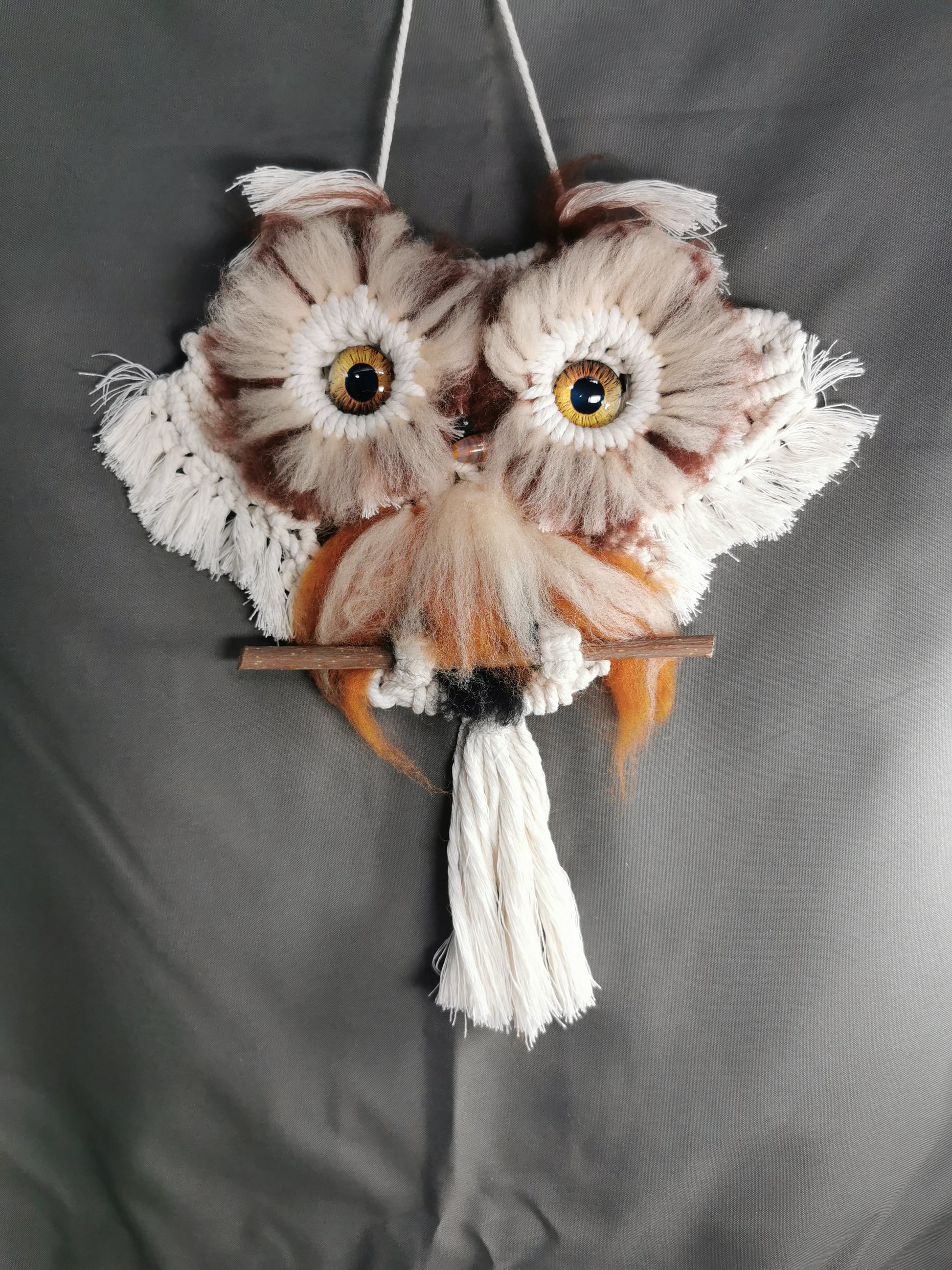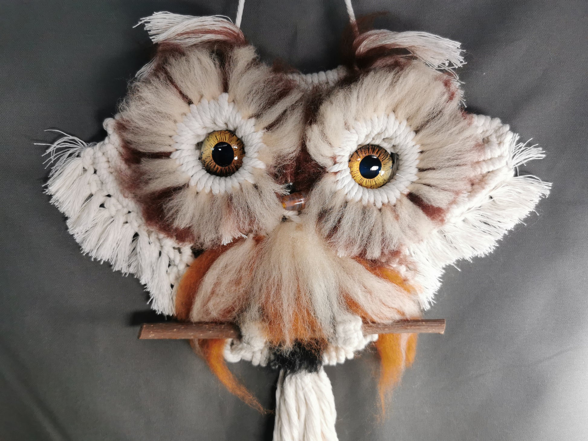 Makramee-Eule, beige/braunes Makramee-Garn, mit einem Holzschnabel, Glasaugen und Filzapplikationen auf einem Holzast