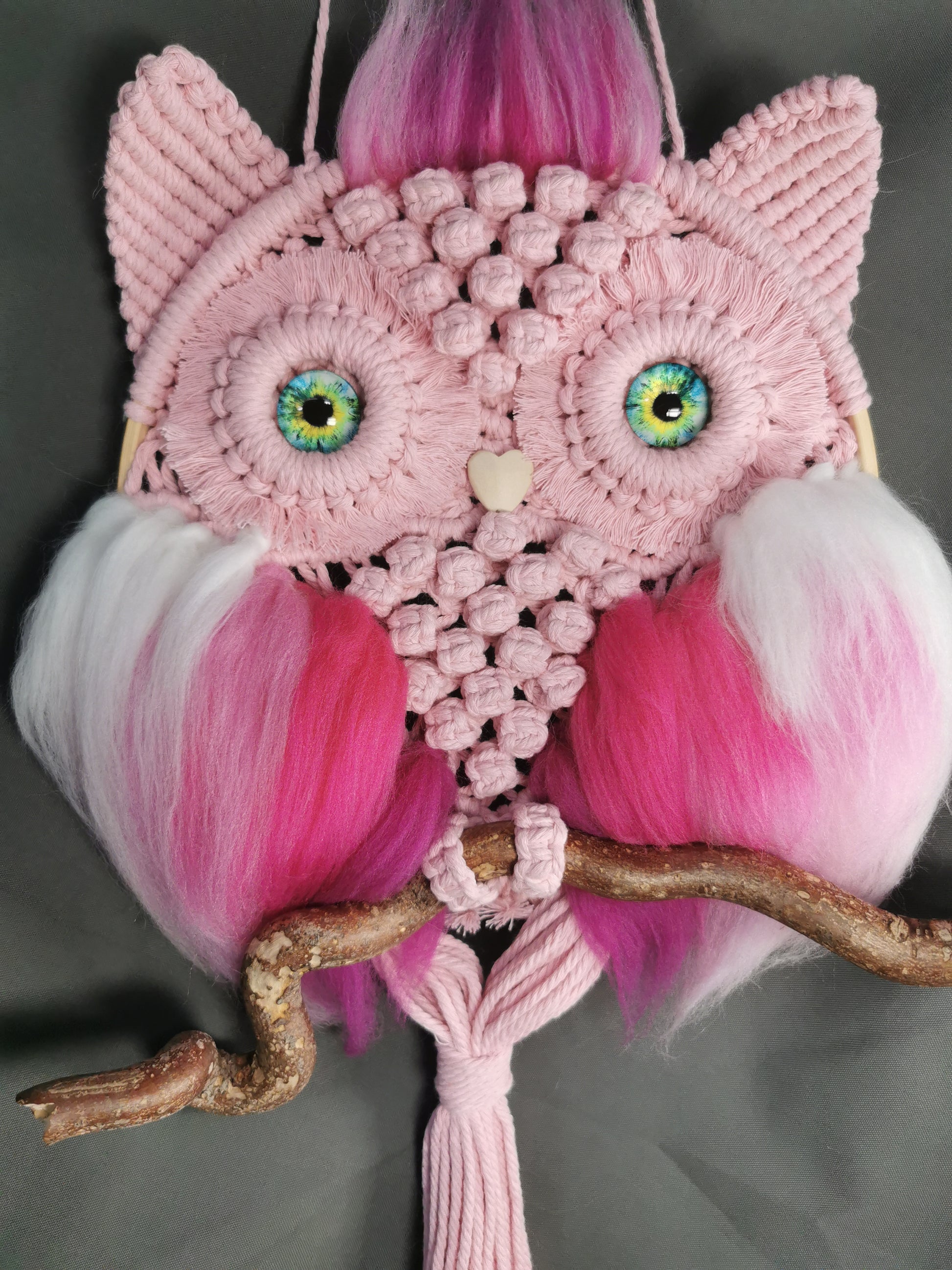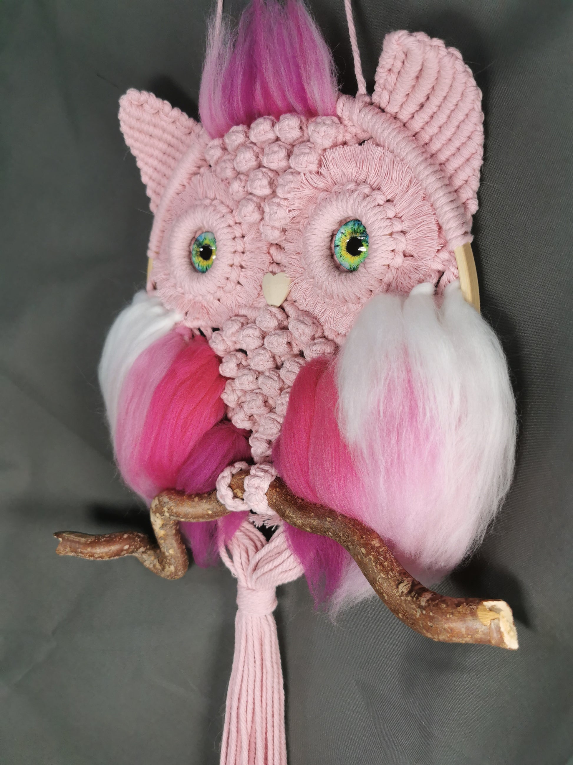 Makramee-Eule, rosa Makramee-Garn auf Bambusring, mit einem Holzschnabel, Glasaugen mit Filzapplikationen auf einem Holzast
