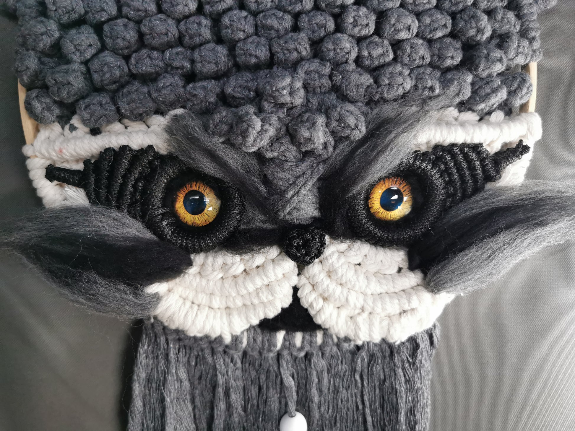 Makramee-Waschbär, grau/weiß/schwarz Makramee-Garn auf Bambusring, mit Glasaugen mit Filz-Applikationen. Holzperlen.