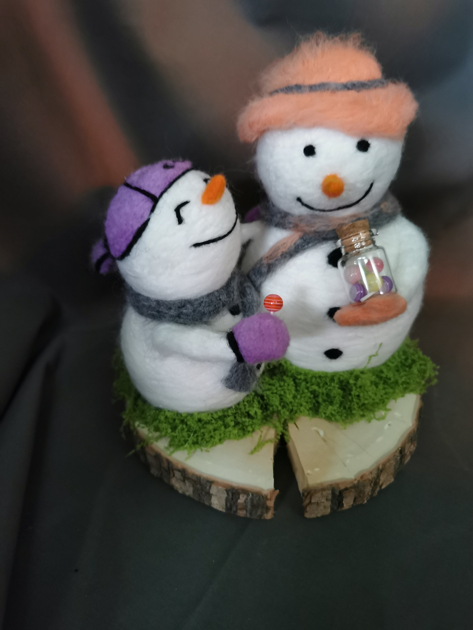 Filz Schneemänner mit Lollis, auf einer Holzscheibe, handgefertigt Einzelstück